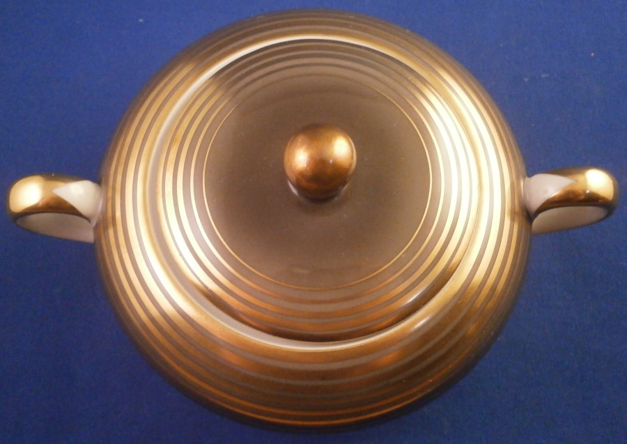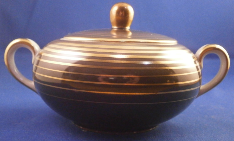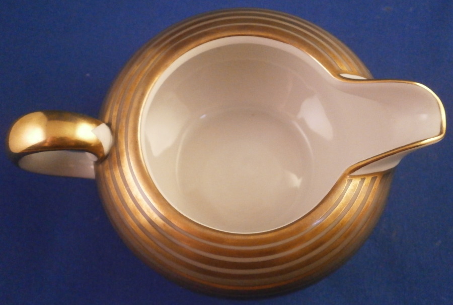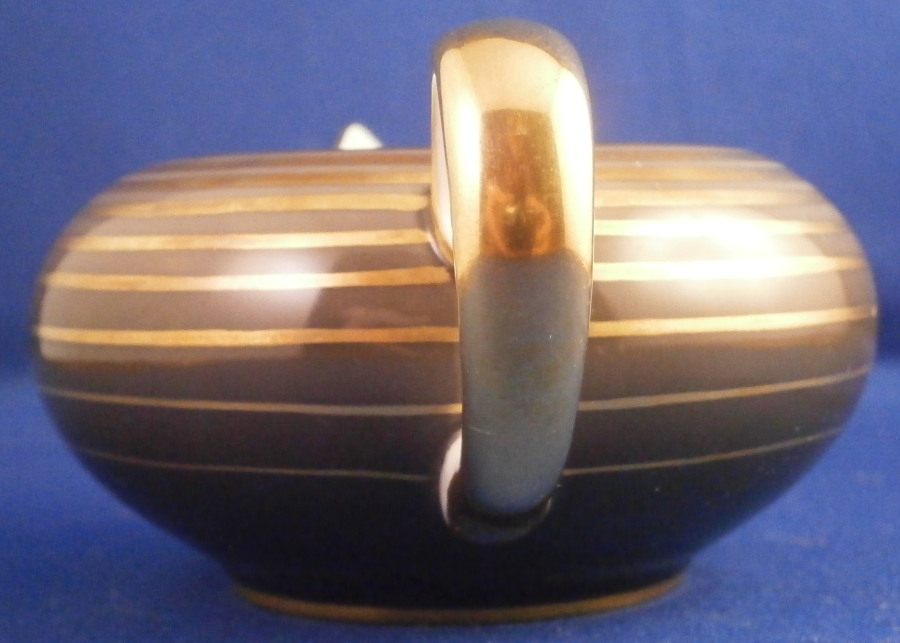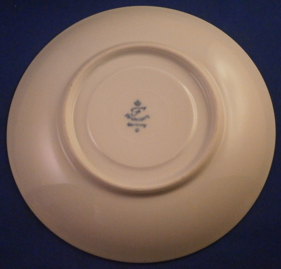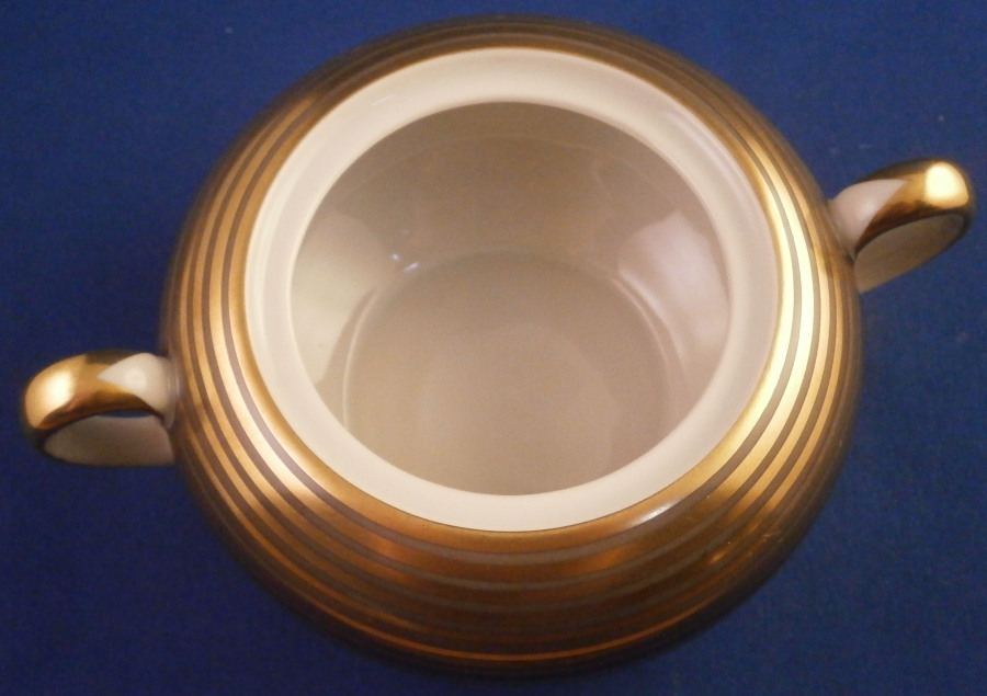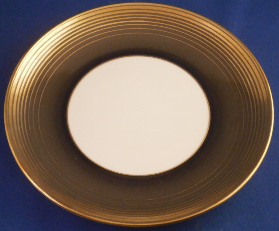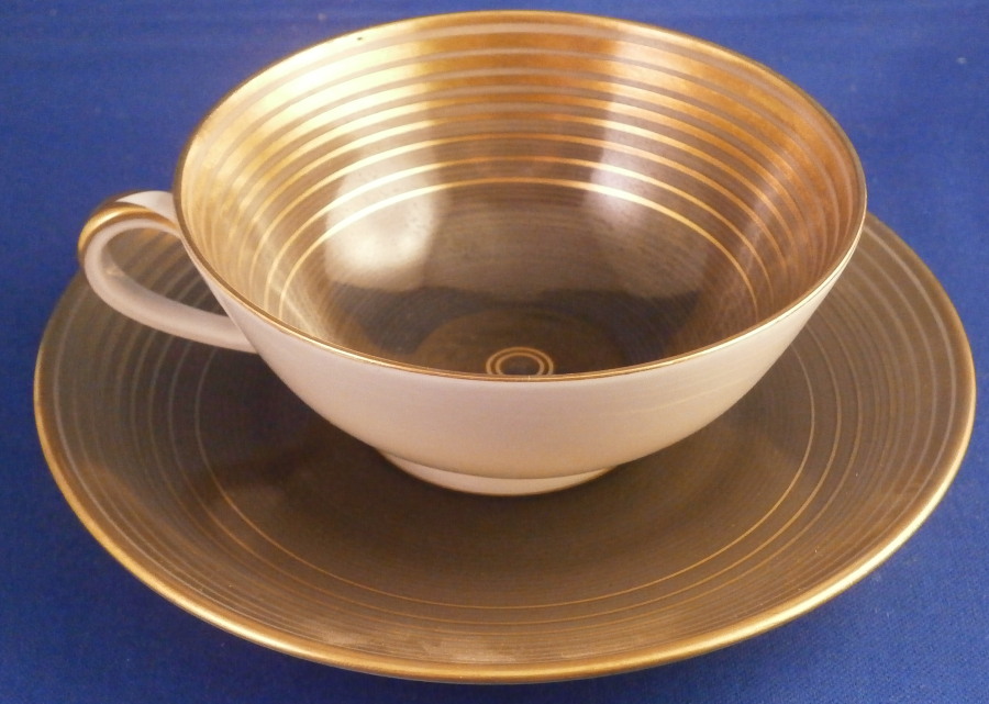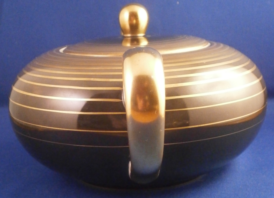 This is a super tea and coffee service set made by Fuerstenberg in the mid 20th century. About as nice an Eames era set as you can find. The set is for five / six people missing just a cup and saucer (the easiest to find item) to make it a complete set for 6 people! The set has the shape number 650 and design 01350. A stunning looking set with a fading brown ground color that is slamost black toward to the bottom and very light towards the top over which a continuos gold ring design was painted going from wider at the top to thinner and then disappearing towards the bottom. The brown ground is also in a ring design on the cups, saucers and plates which reminds me of the Trude Petri pieces at KPM. The outside of the cups, center of the plates and part of the handles and psouts was left white. Nice shape to all pieces and very mid century modern look. All pieces are marked with the underglaze blue mark including the letter F under a crown. Most have the name Fuerstenberg as well as Germany underneath as well as the red design numbers. The creamer has an older mark of just the letter F. in script with Germany under it. Some pieces have a scratch in the glaze on the udnerside done on purpose. Not over the mark just randomly placed. Not sure if this means they are second quality pieces as normally those would be placed over the marks. Never seen that before! All pieces are in great condition, no chips or restorations just the occasional wear or use mark but they display perfectly! The cups are 1.75 inches tall and 4.25 inches in diameter. The saucers are 0.875 inches tall and 6 inches in diameter. The dessert plates are 1 inch tall and about 7.75 inches in diameter. The sugar dish is 3 inches tall including the finial and 4.375 inches in diameter without the handles. The creamer is 2.375 inches tall and 4 inches in diameter, the teapot is 4 inches tall including the finial, 9.75 inches from handle to spout and 6.75 inches in diameter and last but not least the coffee pot is 8.25 inches tall includig the finial, 9 inches from handle to spout and about 5.5 inches in diameter. Please email me for more information or photos.
