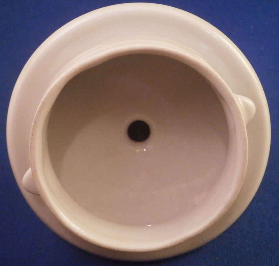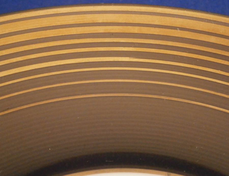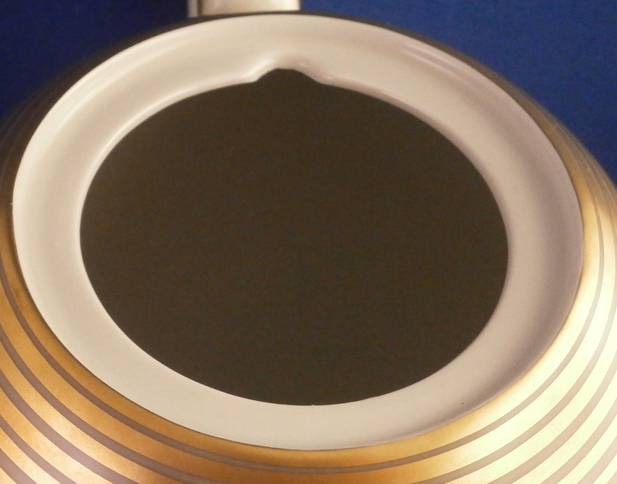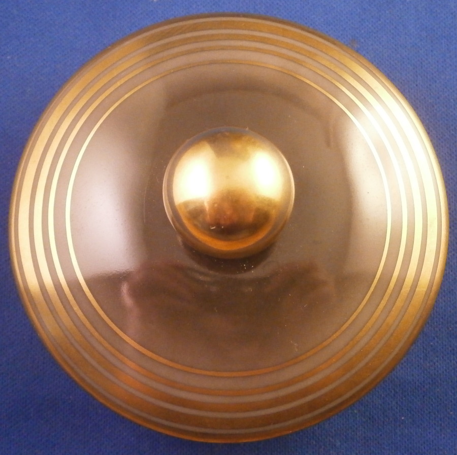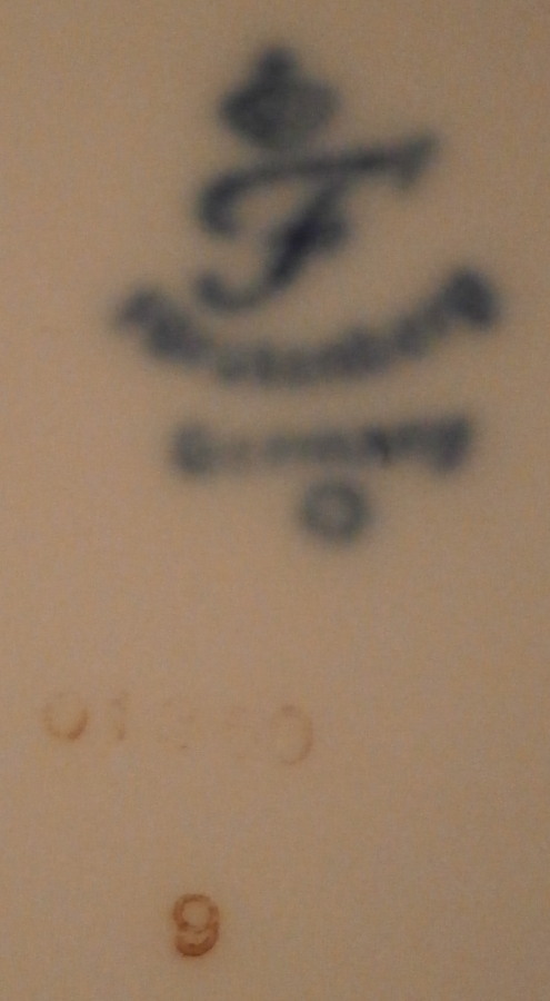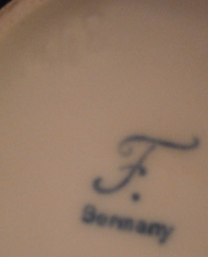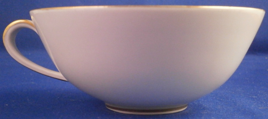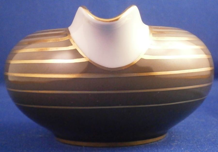 This is a super tea and coffee service set made by Fuerstenberg in the mid 20th century. About as nice an Eames era set as you can find. The set is for five / six people missing just a cup and saucer (the easiest to find item) to make it a complete set for 6 people! The set has the shape number 650 and design 01350. A stunning looking set with a fading brown ground color that is slamost black toward to the bottom and very light towards the top over which a continuos gold ring design was painted going from wider at the top to thinner and then disappearing towards the bottom. The brown ground is also in a ring design on the cups, saucers and plates which reminds me of the Trude Petri pieces at KPM. The outside of the cups, center of the plates and part of the handles and psouts was left white. Nice shape to all pieces and very mid century modern look. All pieces are marked with the underglaze blue mark including the letter F under a crown. Most have the name Fuerstenberg as well as Germany underneath as well as the red design numbers. The creamer has an older mark of just the letter F. in script with Germany under it. Some pieces have a scratch in the glaze on the udnerside done on purpose. Not over the mark just randomly placed. Not sure if this means they are second quality pieces as normally those would be placed over the marks. Never seen that before! All pieces are in great condition, no chips or restorations just the occasional wear or use mark but they display perfectly! The cups are 1.75 inches tall and 4.25 inches in diameter. The saucers are 0.875 inches tall and 6 inches in diameter. The dessert plates are 1 inch tall and about 7.75 inches in diameter. The sugar dish is 3 inches tall including the finial and 4.375 inches in diameter without the handles. The creamer is 2.375 inches tall and 4 inches in diameter, the teapot is 4 inches tall including the finial, 9.75 inches from handle to spout and 6.75 inches in diameter and last but not least the coffee pot is 8.25 inches tall includig the finial, 9 inches from handle to spout and about 5.5 inches in diameter. Please email me for more information or photos.