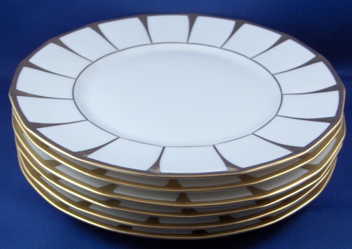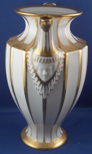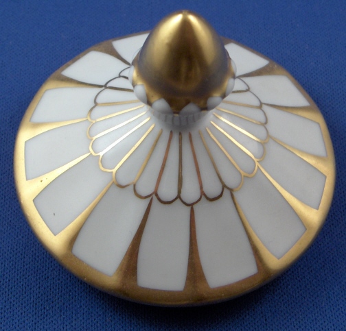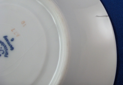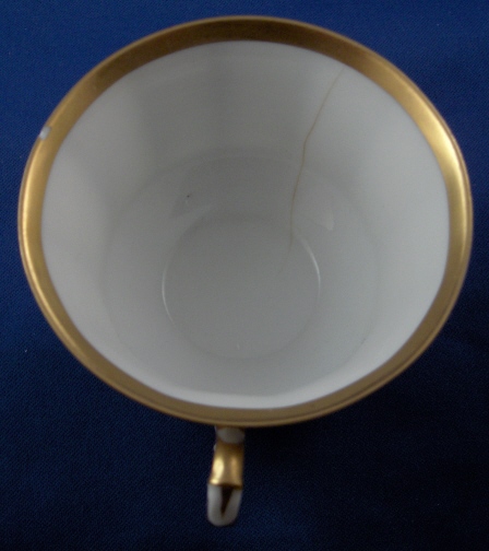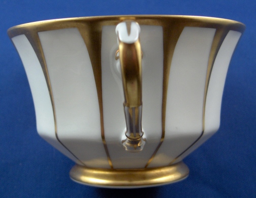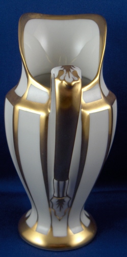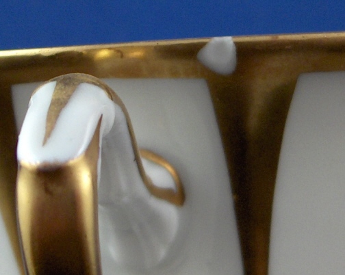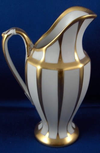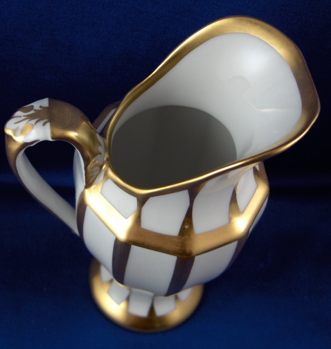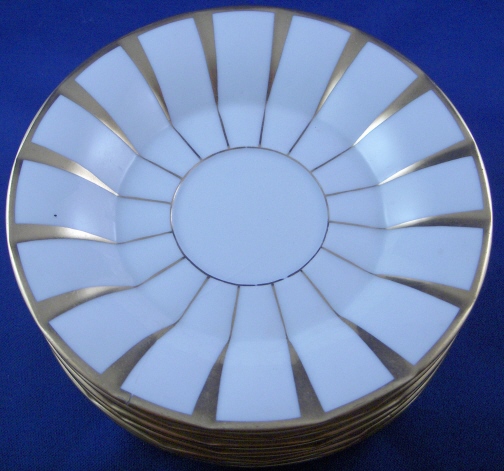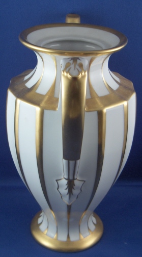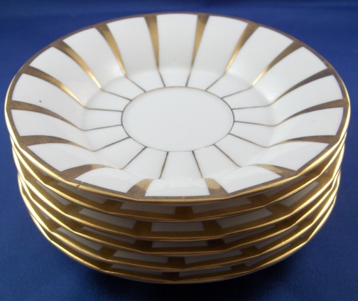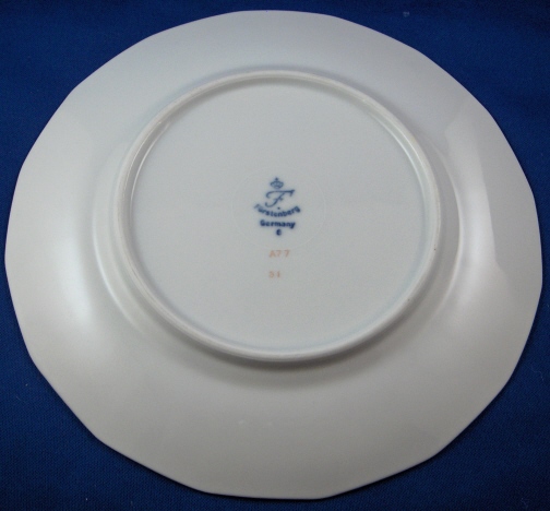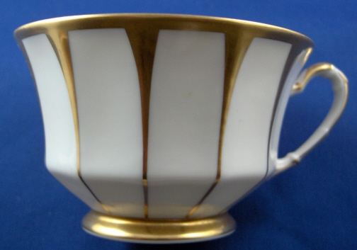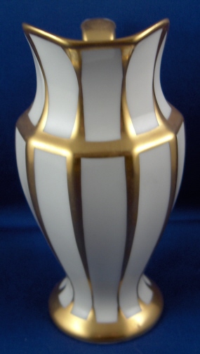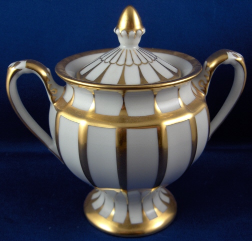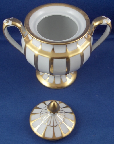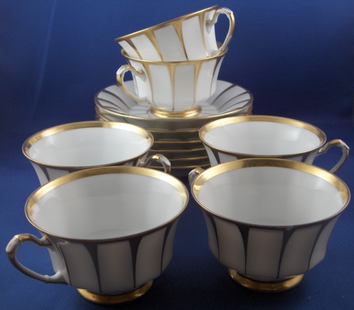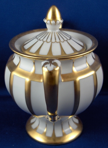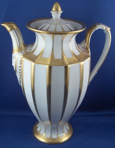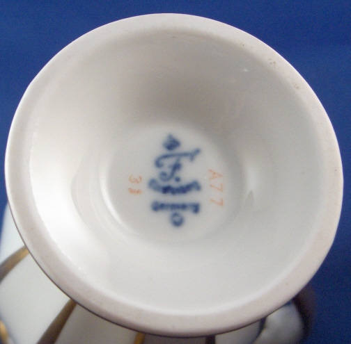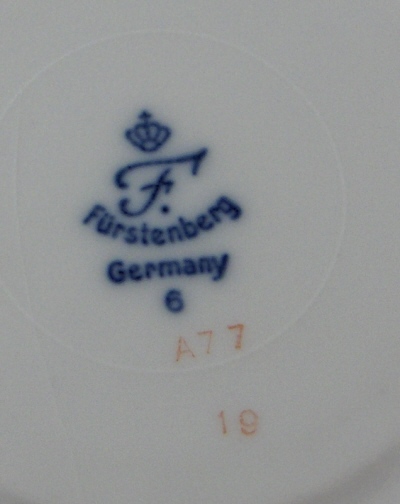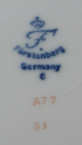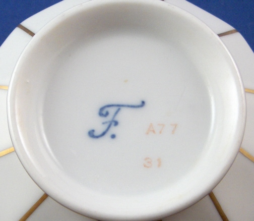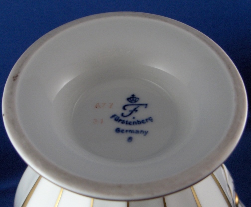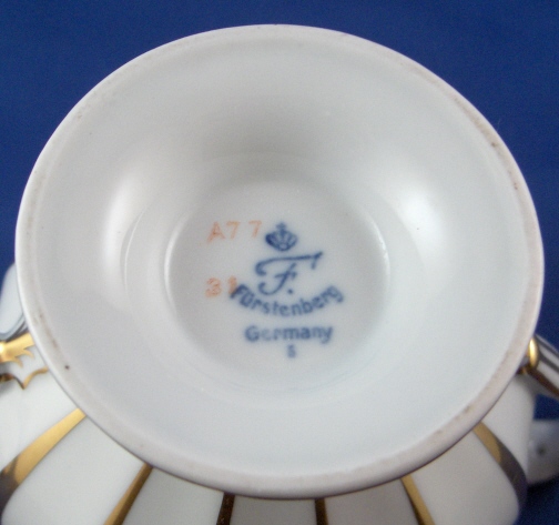 This is a coffee service made by Fuerstenberg in the early 20th century. This is probably their most popular modern seller these days and this set is much older than what you normaly see. It is a set for six people with the Coffee pot, creamer, sugar dish, 6 cups and saucers and six dessert plates. All pieces are nicely modeled and handpainted with a gold design that is as elegant as it comes! The coffee pot has a face under the spout which is neat. All pieces are marked with the underglaze blue F. mark underneath used around 1910. Some pieces also have Germany and Fuerstenberg udnerneath and all have red numbers and letters. The set is in great condition with one cup having a chip and nasty hairline, one cup has a chip and a hairline that is harder to spot, one cup has a teeny chip that would be easily hidden by a little gilding and one saucer has a long nasty hairline. So all in all in great condition!! The coffee pot is 10 inches tall including the lid finial and 4.75 inches in diameter, the sugar dish is 4.75 inches tall and 3.5 inches in diameter, the creamer is 5.5 inches tall and 2.75 inches in diameter, the cups are 2.375 inches tall and 3.75 inches in diameter, the saucers are 0.875 inches tall and 5.625 inches in diameter and the plates are 0.75 inches tall and 7.625 inches in diameter. Please email me for more information or photos.