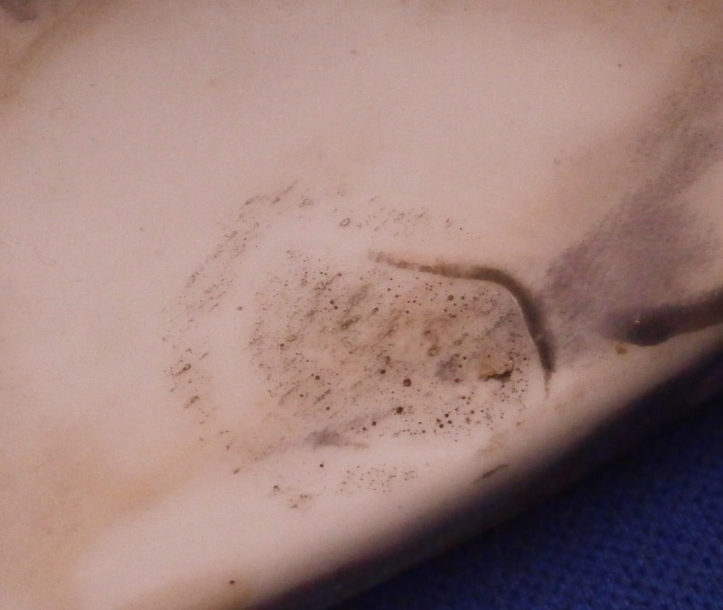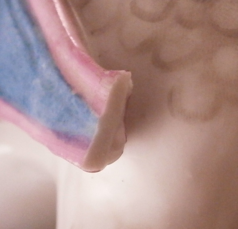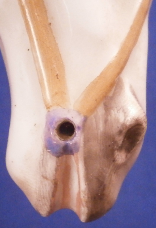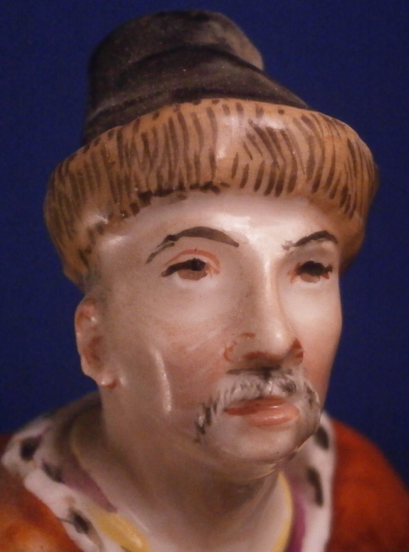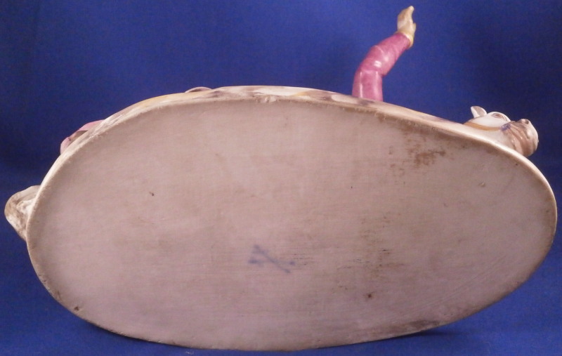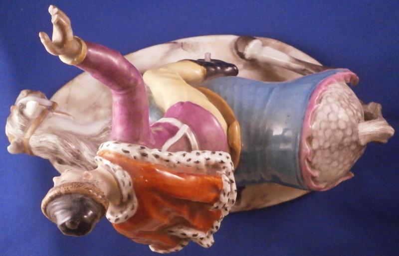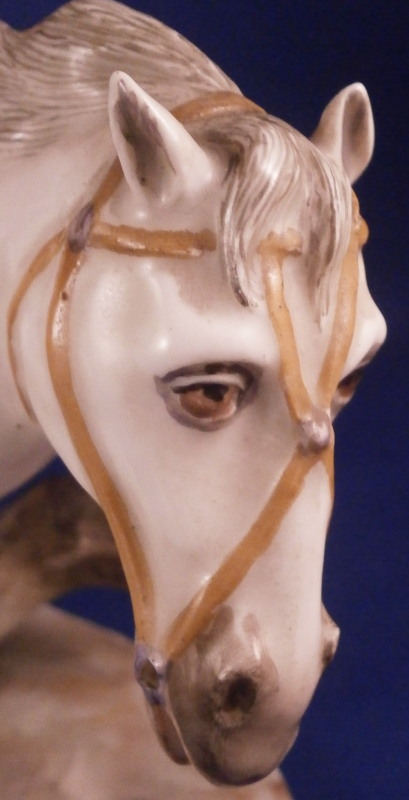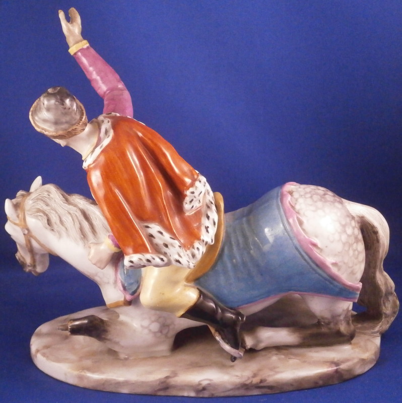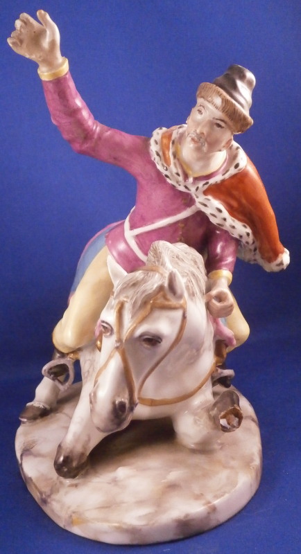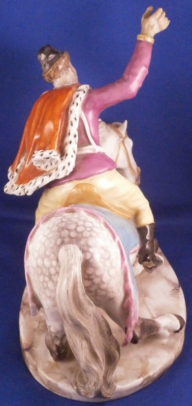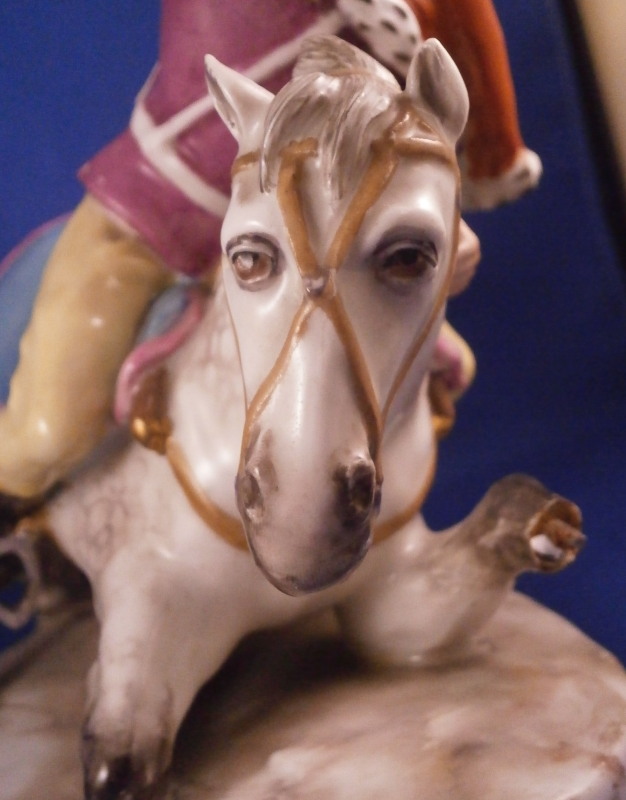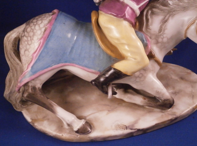 This is a very rare figurine of a hussar soldier on a horse mady by Fuerstenberg in about 1760. A very well modeled figure that is perfectly hand painted. Only very few examples are known of this model! The hussar is nicely dressed with one hand in the air while the other is on the back side of the horse's neck. That hand would ahve been holding the reigns which were not made of porcelain and are long gone. The horse is crashing down during battle onto a typical base for this maker during this period. The horse's face is suprbly painted as it the back end with the spots. The figurine is 7.625 inches tall, 4.5 inches wide and 8.5 inches long. It is marked underneath with the blue crossed swords mark they used quite a bit during this time before it not being allowed anymore later in the 18th century. The piece is in great condition for what it is but the upper hand is damaged and missing four finger tips after it was already rpeviously restored, a whip to the back tip of the horse's blanket and the back front leg of the horse is missing the front part as shown. All these are to be expected on a piece this old and not terribly hard to restore. There is also a spot in the front center of the base that is rough though that seems to have been ground down after it was made possibly where a support of the arm was resting during the firing process. All in all the figurine displays superbly and is very rare! Please email me for more information or photos.