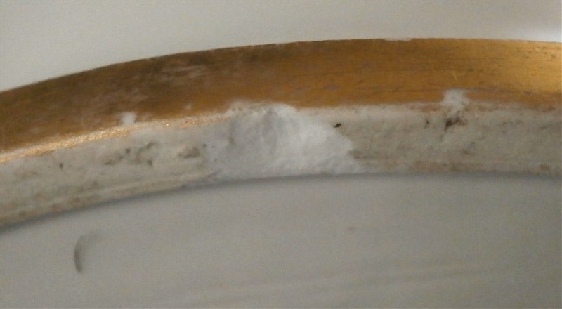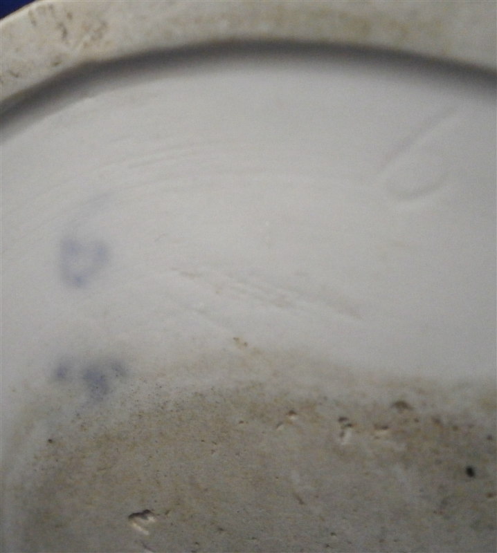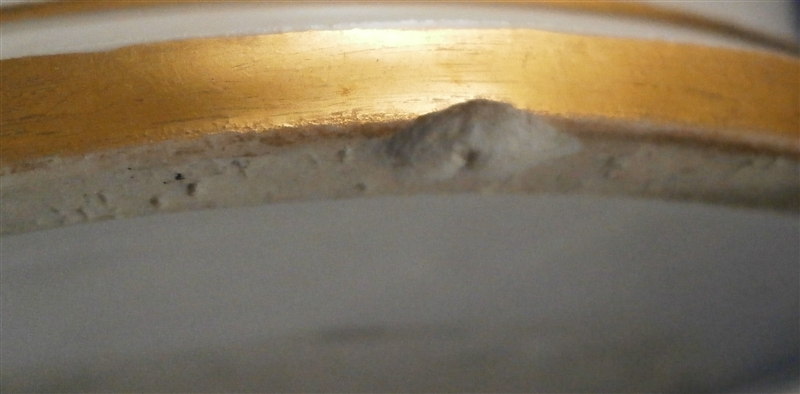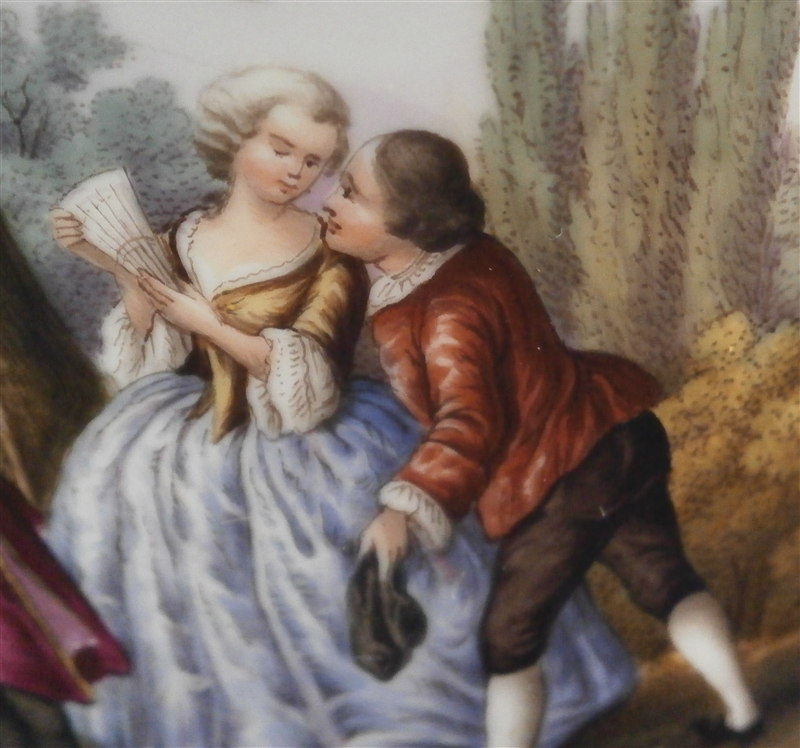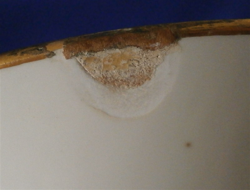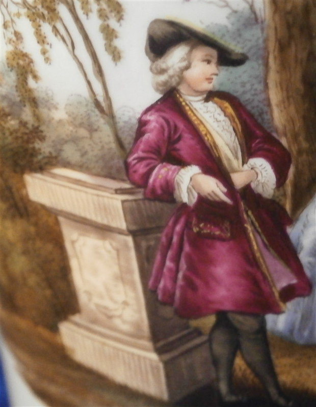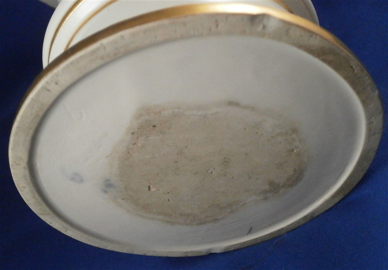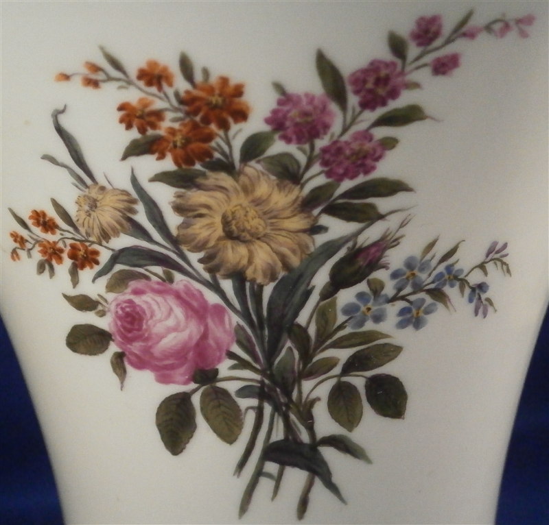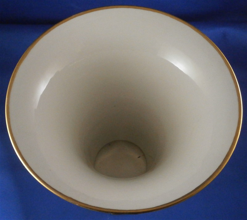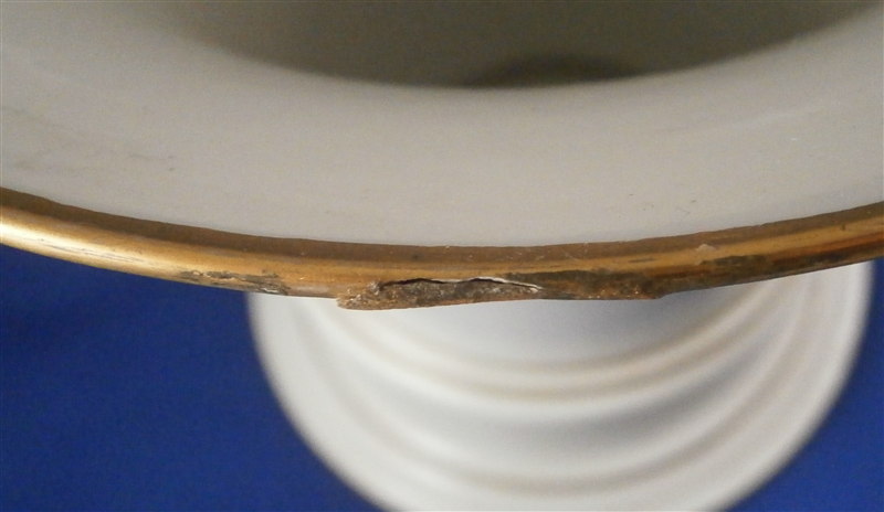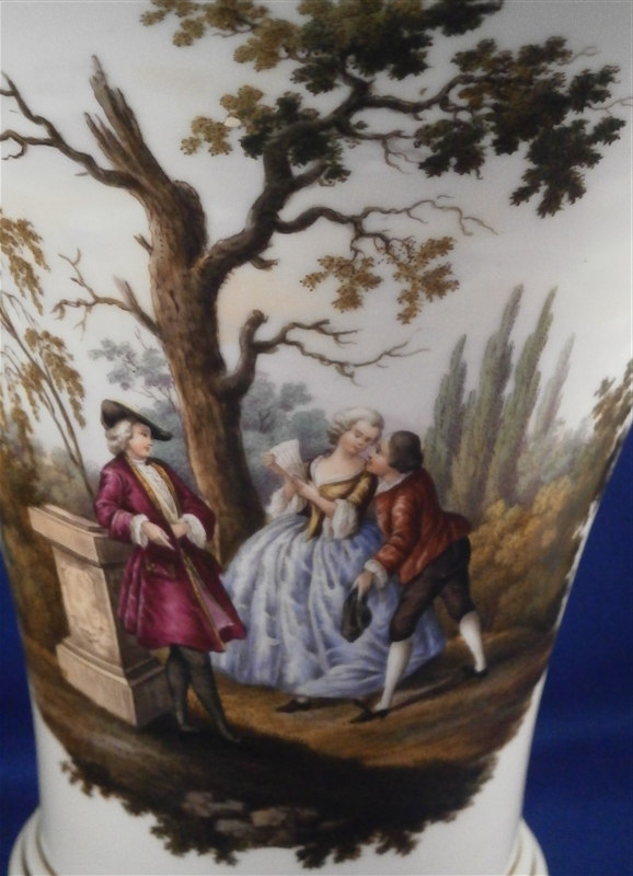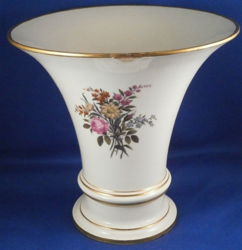 This is a very nice large trumpet shaped vase made by Fuerstenberg in the early 19th century around 1820. It is hand painted on one side with a superb quality scene including three people, a column as well as lots of greenery. There is some gold trim along the bottom, the top as well as the lower part that is riased a bit to make it apear as if the vase is sitting on a base. The back of the vase has a nice floral arrangement on it that is quite nice as well. A really nice piece and quite large for this type of vase. The piece is 7.5 inches tall with a top diameter of just over 7.5 inches. Vases were the most important product for Fuerstenberg and this piece shows us why - quite stunning! It is marked with some underglaze blue marks as well as an incised number but most of it was ground down to make the piece sit flat. The center must have sagged a bit during firing and need to be ground down. The vase displays nicely from the front but there is a large flat chip to the back edge above the floral design as shown as well as two small chips to the underside edge. They would all be a very easy fix! Please email me for more information or photos.