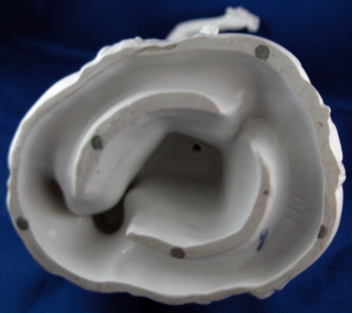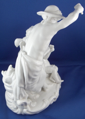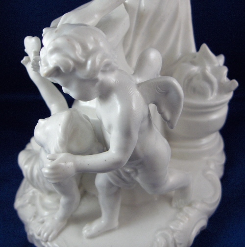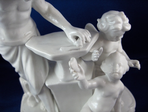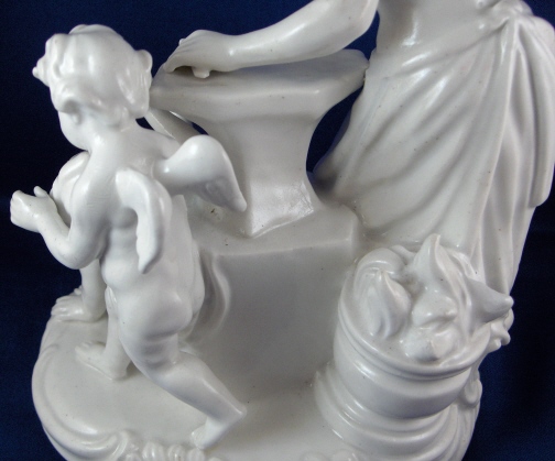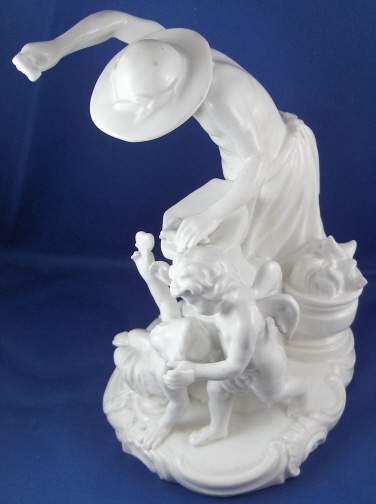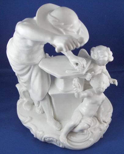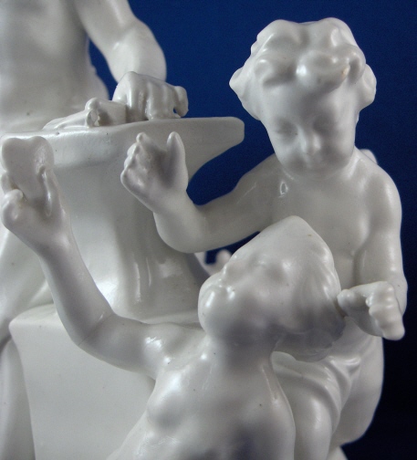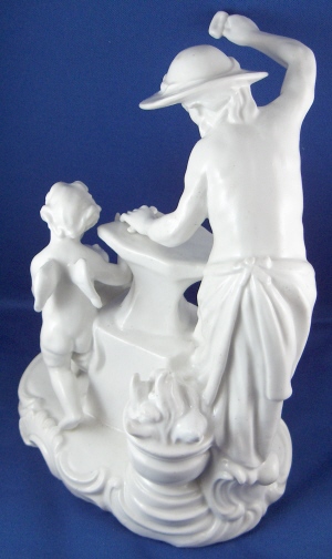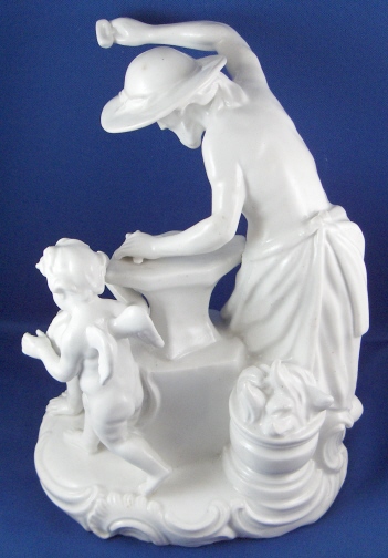 This is a large figurine of a blacksmith with a putto holding a heart and a cherub behind her mady by Fuerstenberg in the 18th century. A nice figurine with lots of detail. The blacksmith is hammering an arrow on his anvil, he has the fire behind him and the other two figures in front of him. The base has some nice scroll work on it typical of this period. The figure is 7.5 inches tall, 5.75 inches wide and 4.75 inches deep. It is marked underneath with the blue script F mark and an incised number 110. The piece is in superb display condition but there has been a good restoration done to it which is hard to figure out since a lot of the piece was oversprayed with a clear glaze to cover any evidence up completely. From what I can figure out the tip of the arrow on the anvil is missing as is part of that tool right there. The putto's right arm was broken and cleanly reattached, the cherubs left wing has been worked on, the hammer in his hand and two chips to the base. This is mostly guesswork since it is very well done. Please email me for more information or photos.