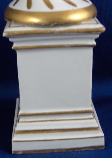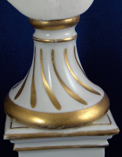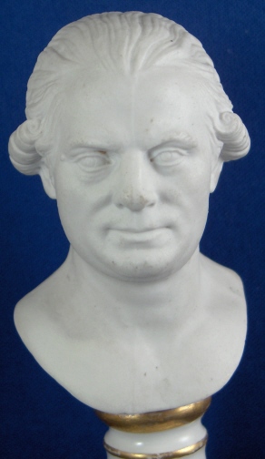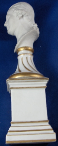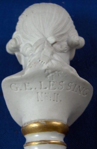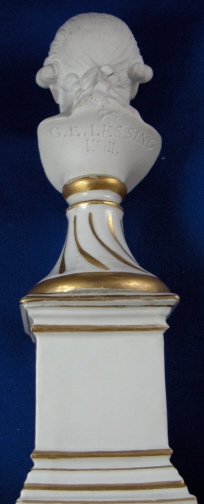 This is a bust of the famous German writer (among other things) Gotthold Ephraim Lessing. It appears to be after a marble bust made by the sculptor Christian Friedrich Krull in about 1780. It was made by Fuerstenberg in about 1781 the year he died in. It is a superb bust with amazing detail and left in biscuit (a form of unglazed porcelain) these details are shown off perfectly. The base of the bust is glazed and has a nice gold design to it. That sits on top of a square column with some gold trim to the edges. The piece is in great condition with some invisible minor work to the top corners of the column. The entire piece is 7.125 inches tall, 2 inches wide and 2 inches deep. It is marked underneath with the underglaze blue script F mark as shown but the bust itself has the rare impressed horse mark on it with G.E. LESSING impressed under it as well as No. 11. The horse mark was only used on biscuit busts so it is a rare one to see. Please email me for more information or photos.