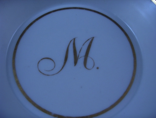 This is a saucer made by Fuerstenberg around 1780. It is simply handpainted with the letter M. in the center (I wonder why I bought it :) and two gold rings as trim. The saucer is 1.25 inches tall and 5.125 inches in diameter. It is in super condition with very little wear to the gold and is marked with the underglaze blue script F mark underneath. Please email me for more information or photos.