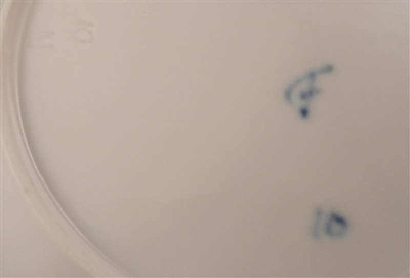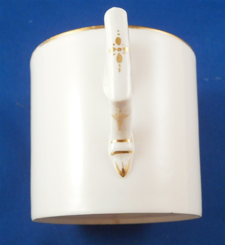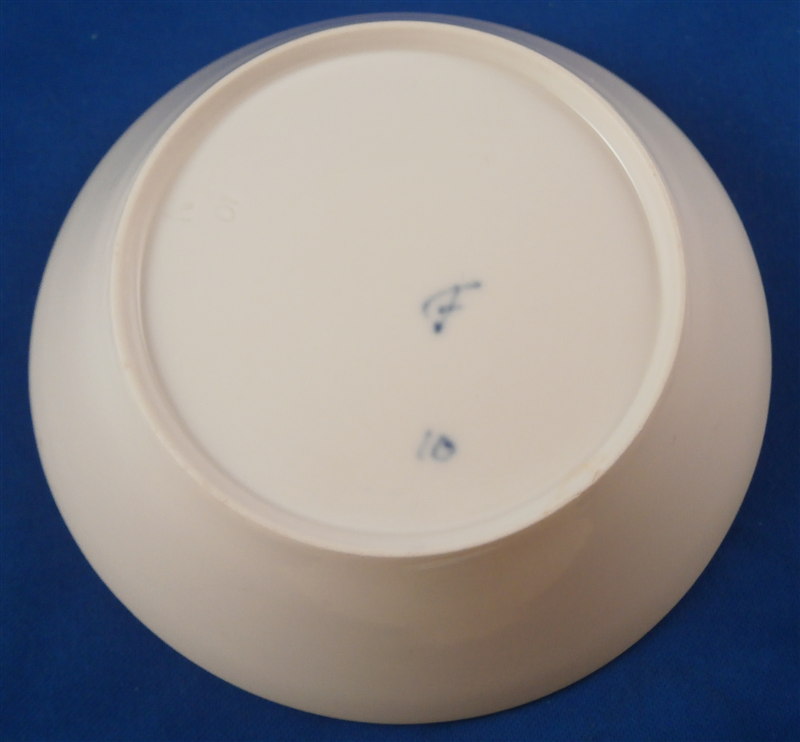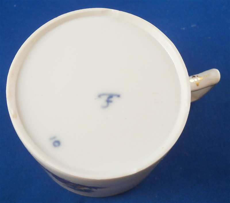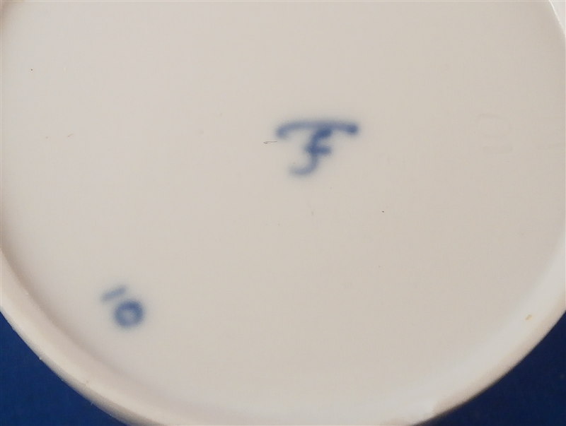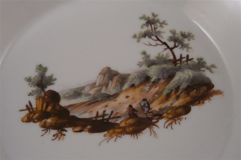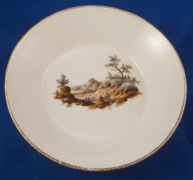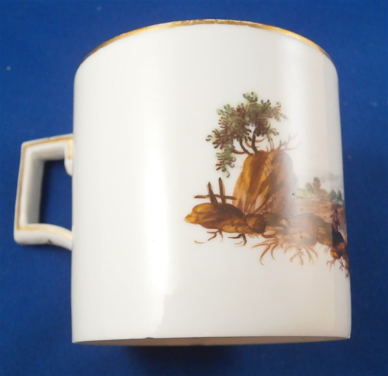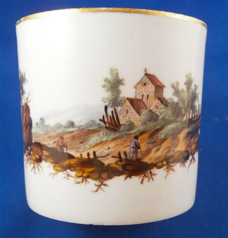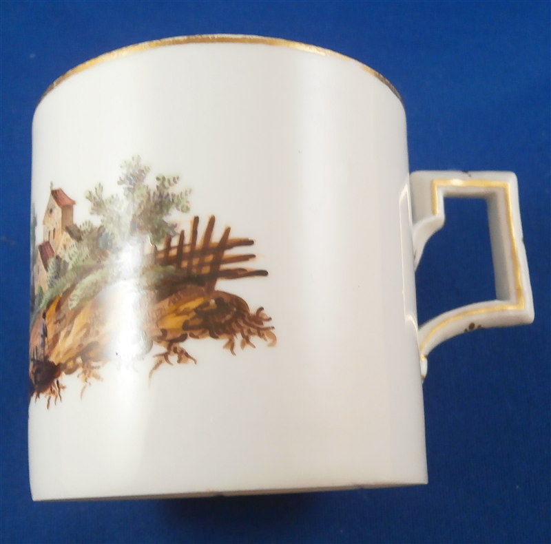 This is a cup and saucer set made by Fuerstenberg around 1780. Both the cup and the saucer have a superb handpainted scene on them including some nice trees, boulders, two people and a church on the cup. Gold trim to the edges and the handle. The cup is 2.375 inches tall and 2.5 inches in diameter. The saucer is 1.25 inches tall and 5 inches in diameter. Both are in super condition with very little wear to the scene on the saucer and some wear to the gold trim of the edges. The footring of the cup has some minor chips some of which are glazed over so from the making. The cup and saucer are marked with the underglaze blue script F mark as well as a number 10 and some impressed numbers. Please email me for more information or photos.