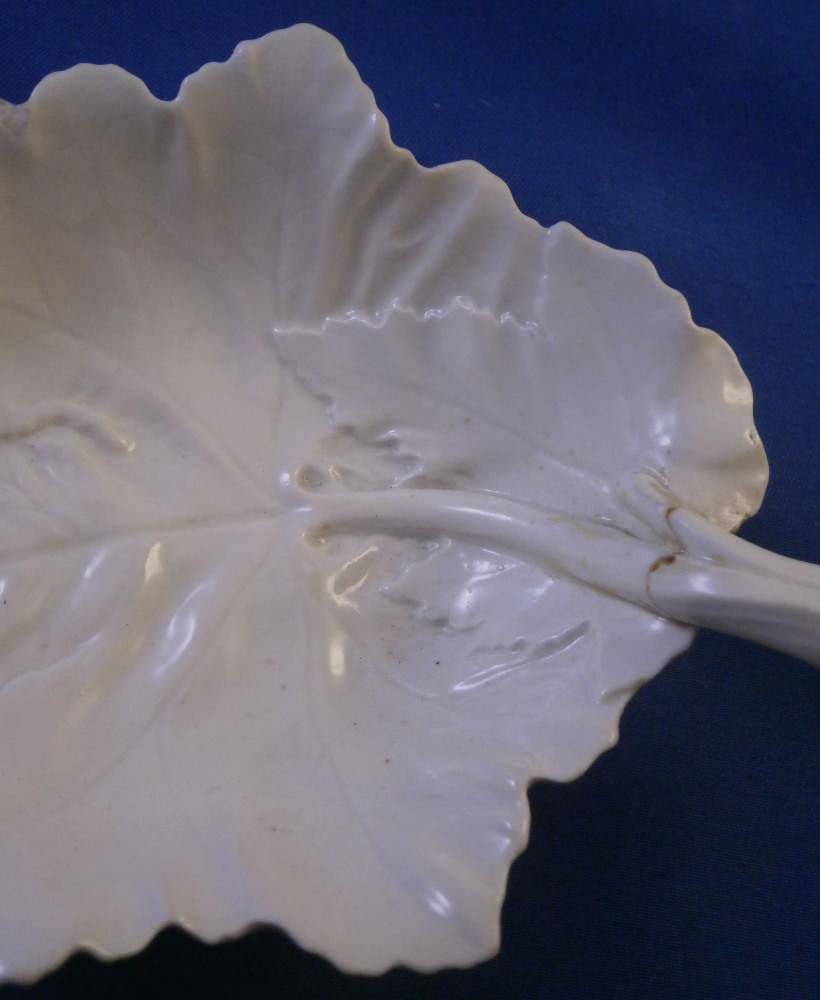 This is a very early leaf dish made by Furstenberg during the very beginning of their existence pre 1760. It has a nice deep shape and has lots of molded details to it. There is a smaller leaf towards the terminal that overlaps the larger leaf. In pretty decent condition considering the fragile nature and age. Could not find anything like it in my books or online. There is a flat chip to the edge as shown that does not affect the shape and the branch handle has been broken off and reglued. Nothing missing so an easy fix for a decent restorer. The dish is marked udnerneath with the under glaze blue script F mark as shown as well as the number 54 over an incised script F mark which I have never seen before. Definitely an unusual and early piece! It is about 1.375 inches tall (at the handle), 5.375 inches from handle end to tip of leaf and 3.635 inches deep. Please email me for more information or photos.