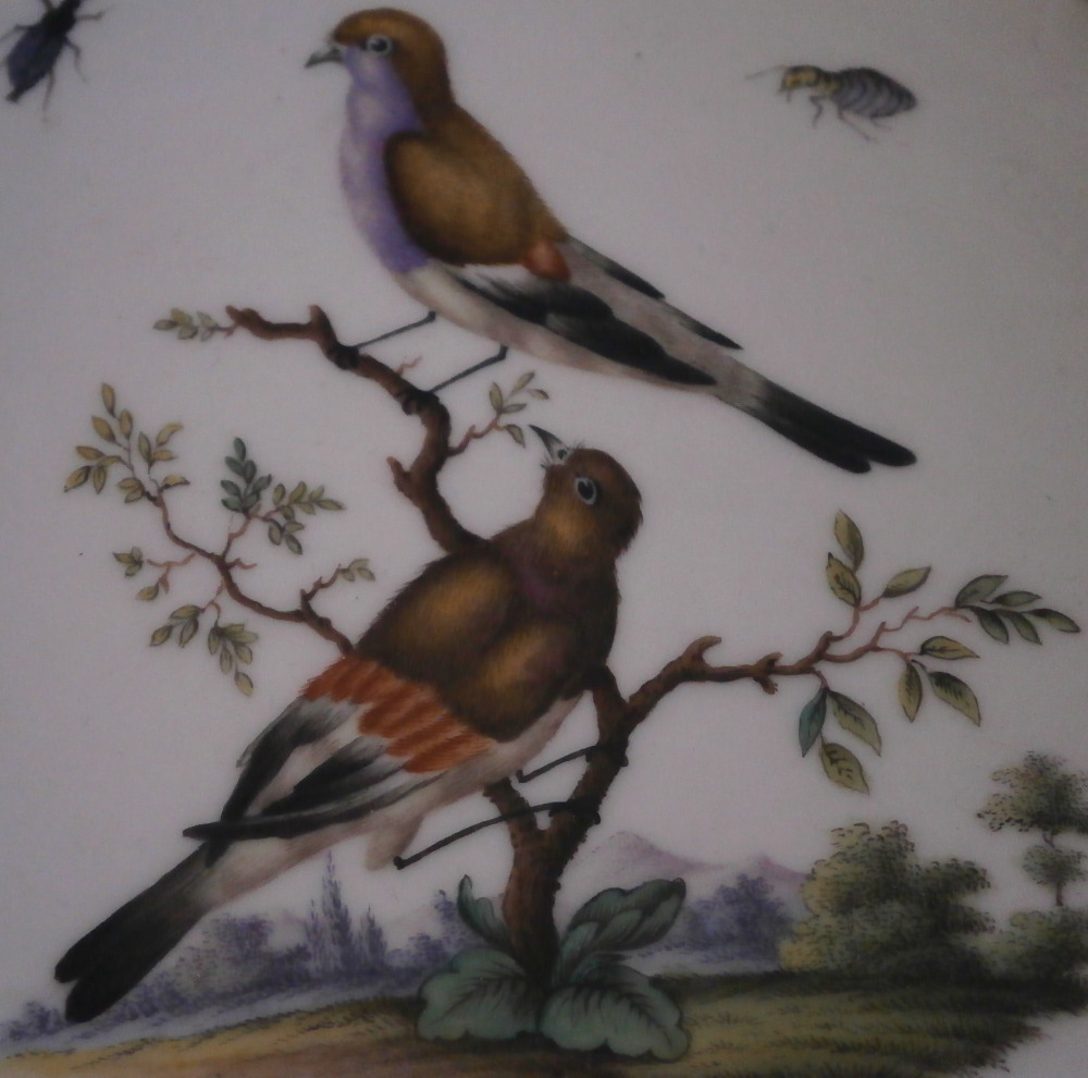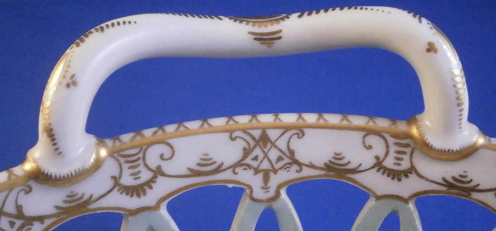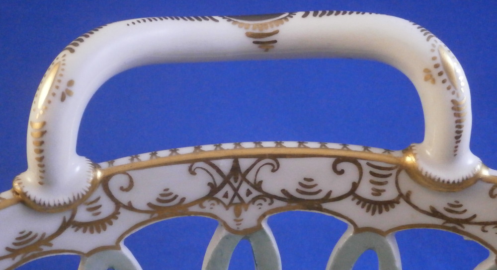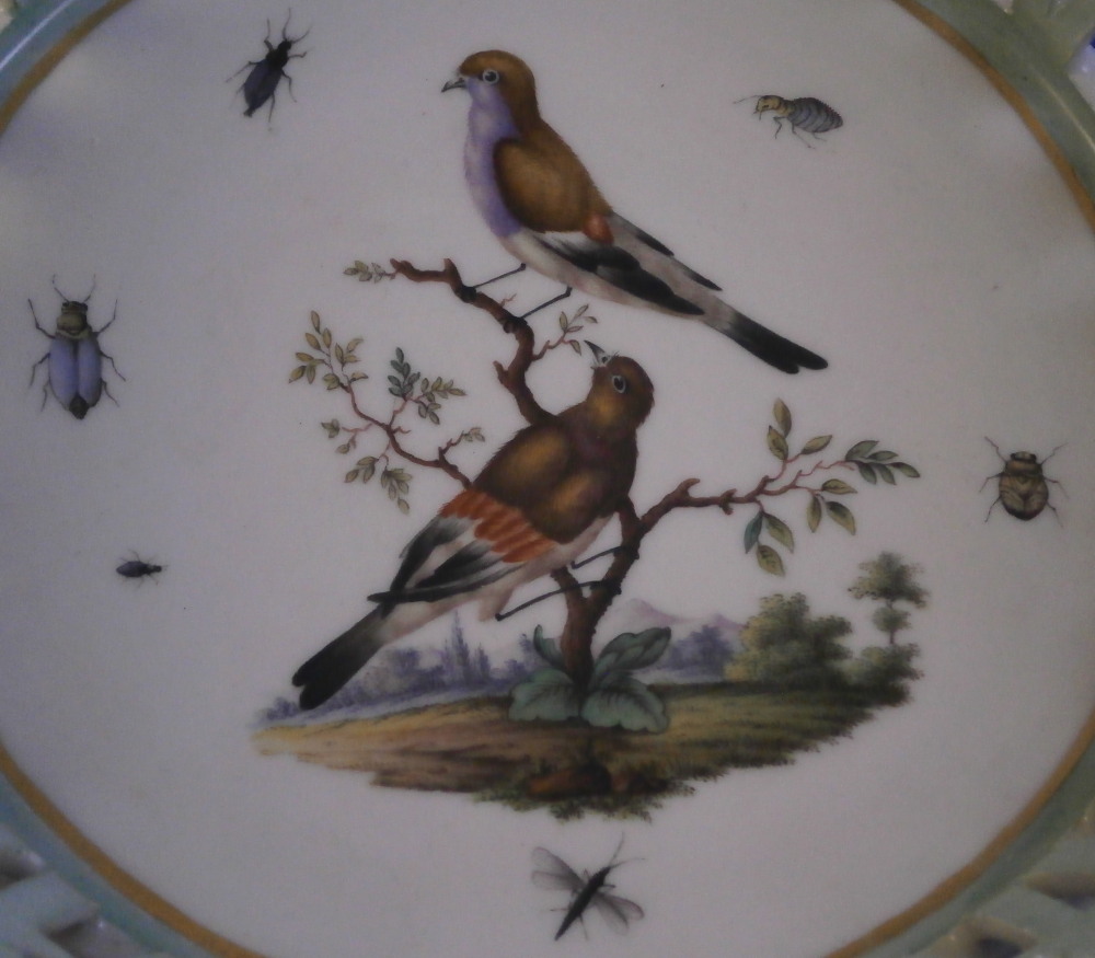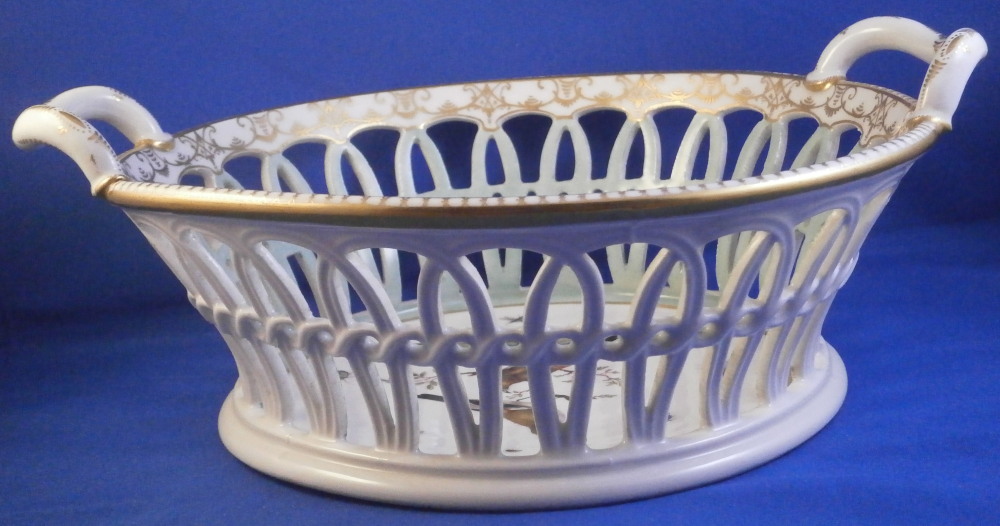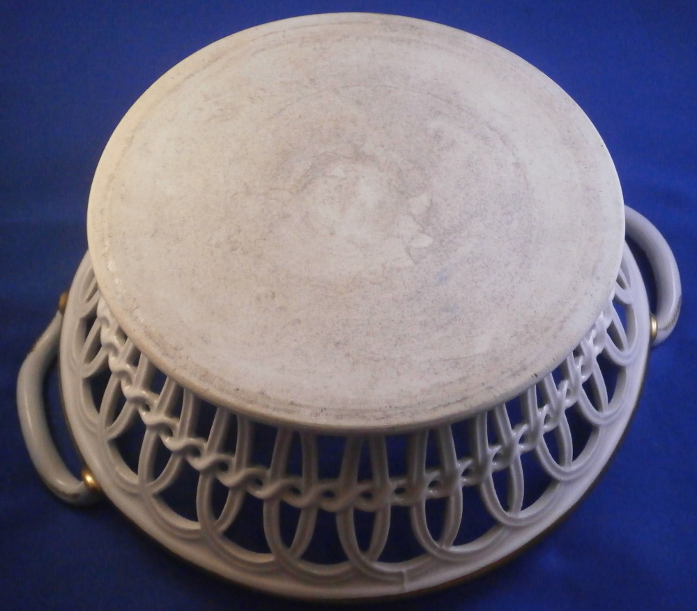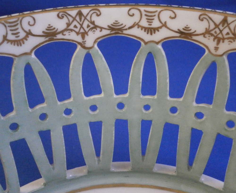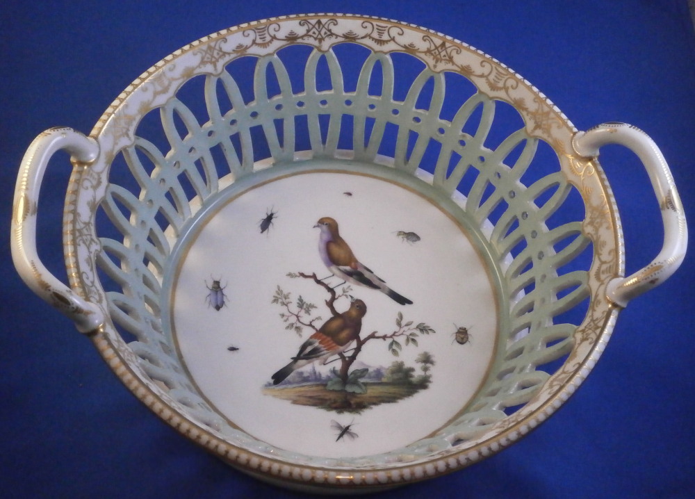 This is a superb reticulated basket made by Fuerstenberg in the 18th century. A rare model that is nicer than their other ones plus it comes with a bird scene instead of just flowers so it's extra special :) The piece has a fancy reticulated side to it painted with a turquoise ground color. The top edge is left white with a fancy gold trim to it, a handle to either side and a superb hand painted bird scene on the bottom inside including two birds in a landscape surrounding with some bugs scattered about. The mayfly and cricket are extra nice! The outside reticulated area has a relief design to it. The basket is in almost perfect condition except for a tight stable hairline to one small section of the reticulation as shown. Even the gilding is perfect! It displays perfectly! Amamzing given the fragile nature of the piece and its age! The basket is 3.875 inches tall at the handles and 9 inches in diameter so a nice size. The bottom is unglazed which is typical of their earlier pieces but you can still see the faint F mark and another blue mark under that. A nice early piece from a great maker! Please email me for more information or photos.