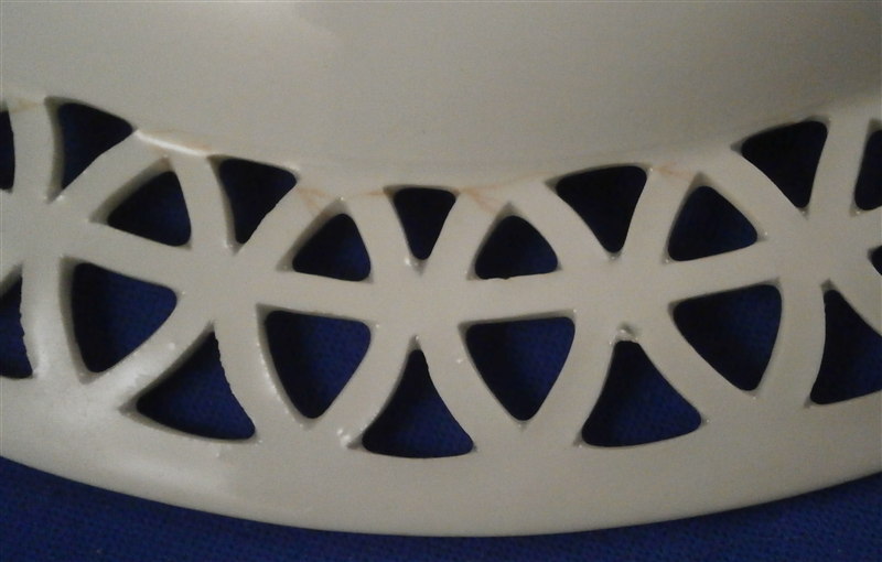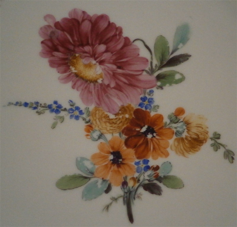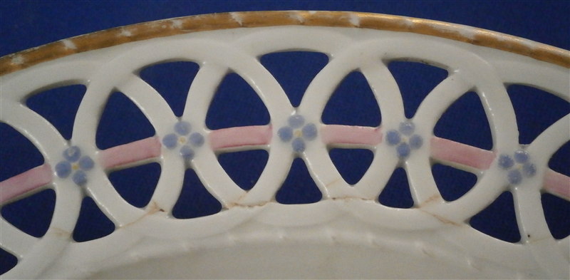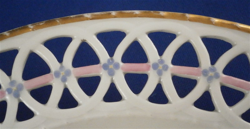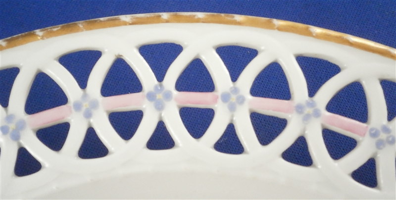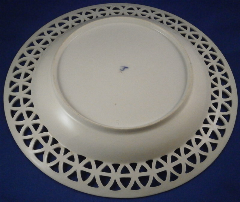 This is a nice reticulated floral plate made by Fuerstenberg in the 18th century. It is hand painted with a nice floral arrangement in the center as well as three small flowers and a stunning reticulated rim that is quite typical of this maker. The rim has a pink band in it as well as blue and yellow flowers and a gold trim to the edge. The plate is in good condition with a bit of wear to the gold trim and some hairline cracks to the reticulated rim toward the bowl part as shown in one area as well as some paint flaking off the floral arrangement as shown. It displays perfectly! It is marked with the Fuerstenberg under glaze blue script F mark and an incised X as well as an incised letter S and another letter behind that as shown. The plate is 1.375 inches tall and 9.5 inches in diameter. Please email me for more information or photos.