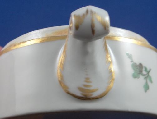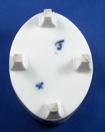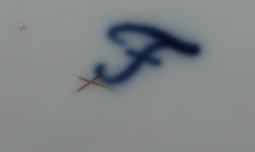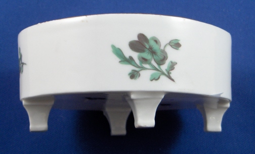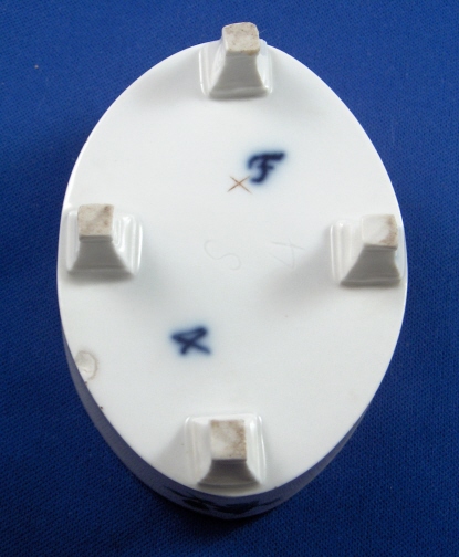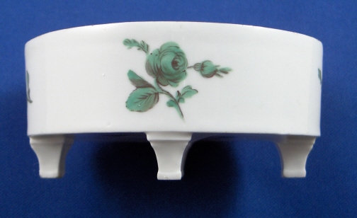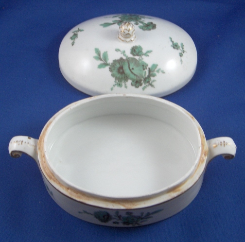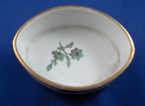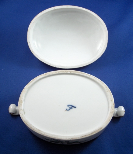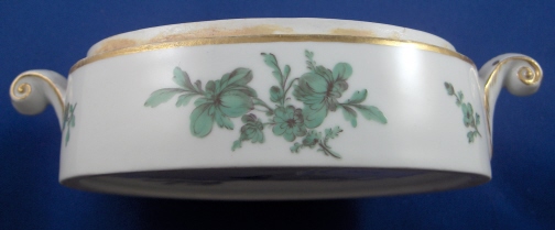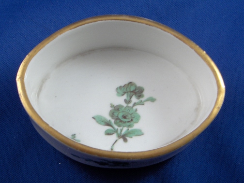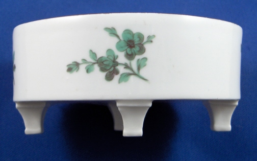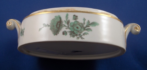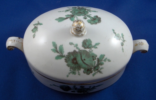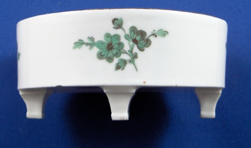This is a set of three salt dishes made by Fuerstenberg around 1780. There is the lidded master salt and two smaller open salts. All three are handpainted with lots of flowers in shades of green as well as a gold trim. The master salt is3.25 inches tall, 6.5 inches wide and 3.75 inches deep. The smaller open salts are 1.5 inches tall, 3.5 inches wide and 2.5 inches deep. All are in super condition with one of the open salts having a flat chip underneath and the master salt has some staining on the rim where the lid sits so can't be seen unless open. Very little wear to the gold trim. All three are marked with the underglaze blue script F mark as well as some impressed letters and numbers. Please email me for more information or photos.
