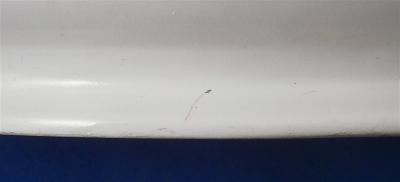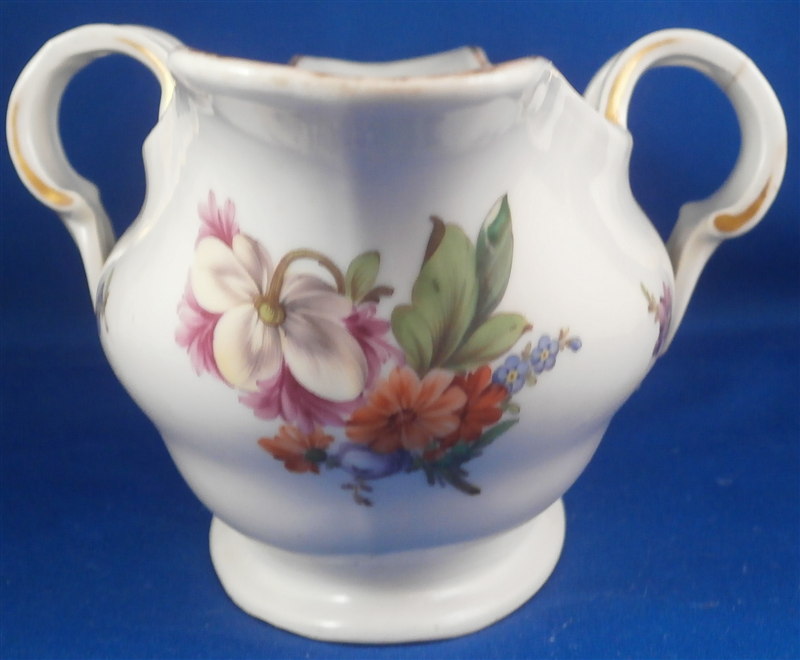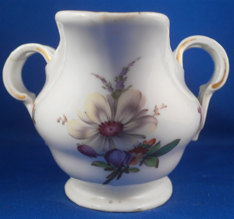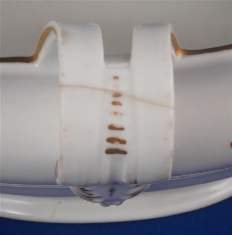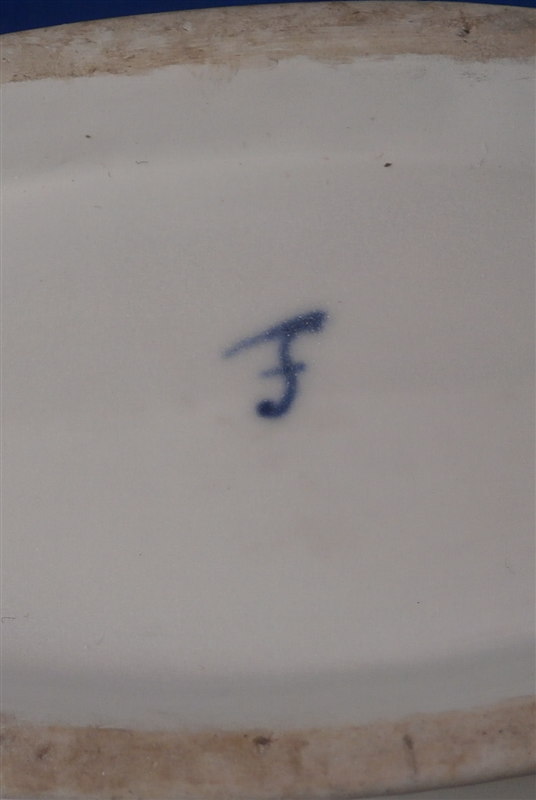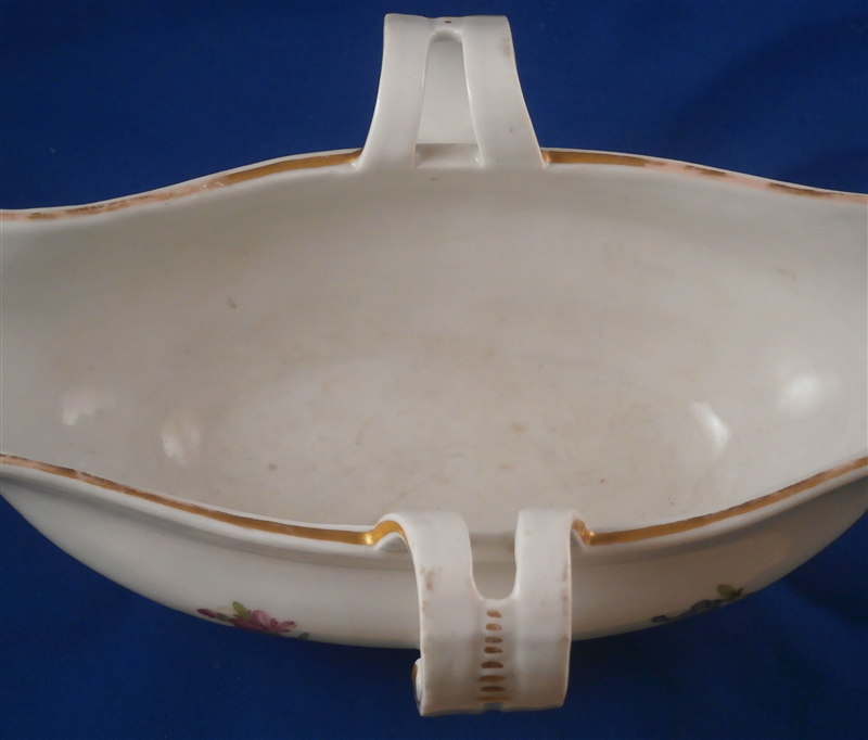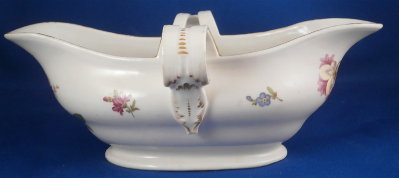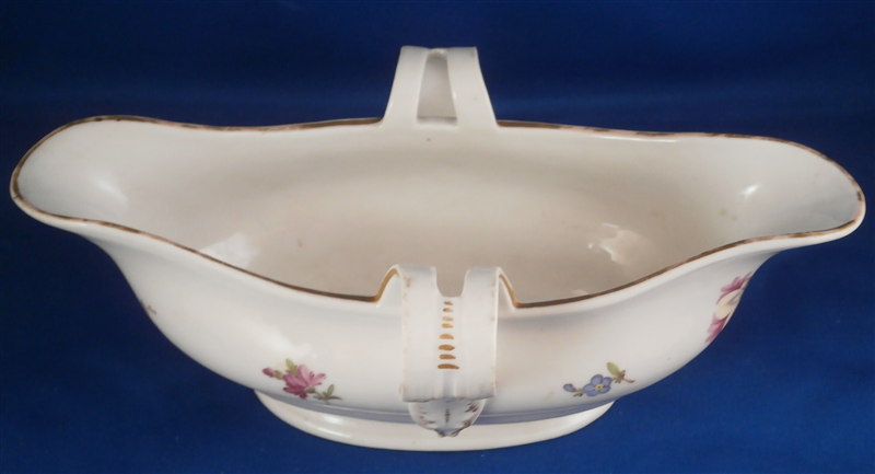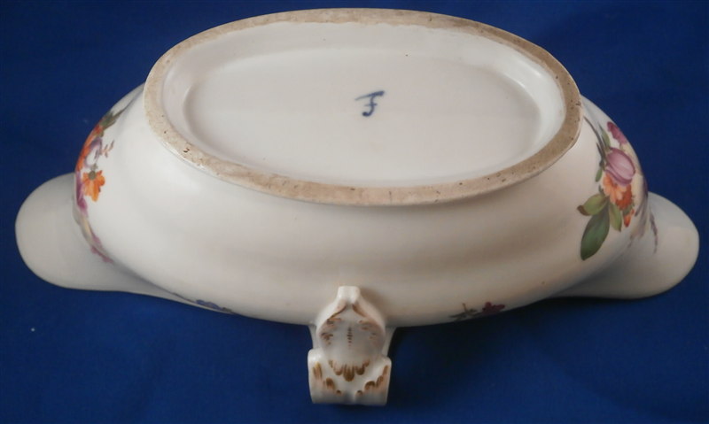 This is a rare sauce dish made by Fuerstenberg in the 18th century. It is nicely handpainted with a larger floral arrangment at each end, four smaller flowers in between and a gold trim to the top edge and handles. The sauciere is in good condition with one handle having a hairline crack through it and the footring has been restored expertly. A bit of wear to the gold trim and use marks on the inside bottom. A nice and very uncommon example. The piece is 3.25 inches tall, 8.875 inches long and and 5 inches wide. Marked underneath with the underglaze blue script F mark as shown. Please email me for more information or other pictures.