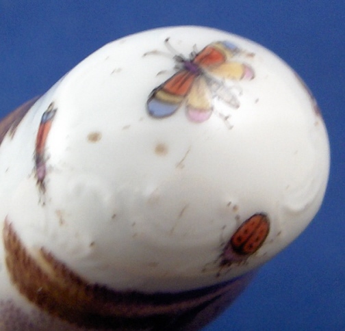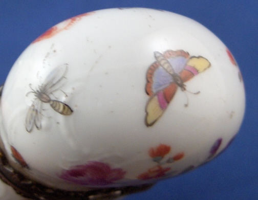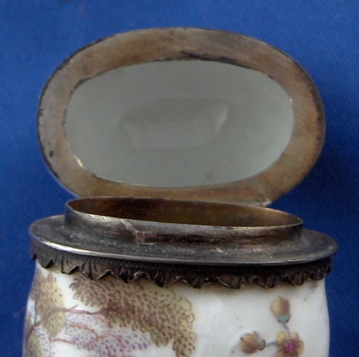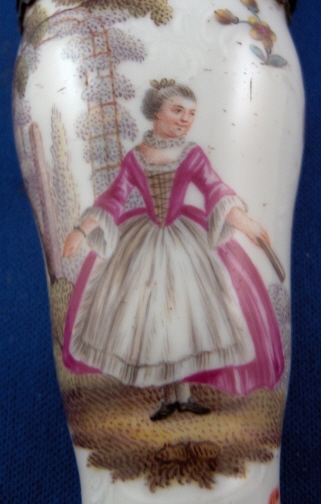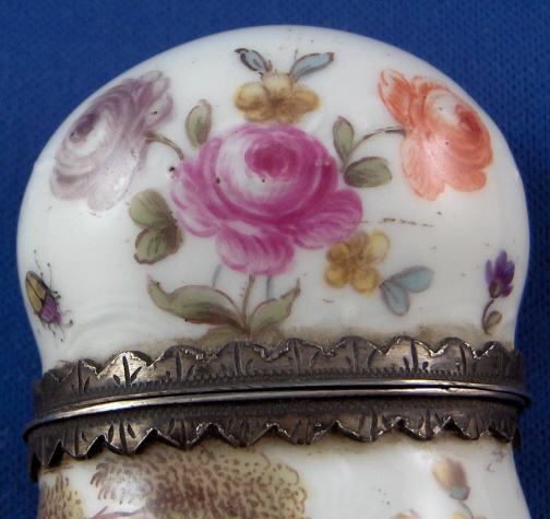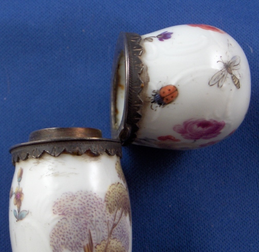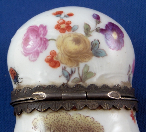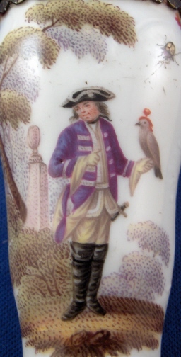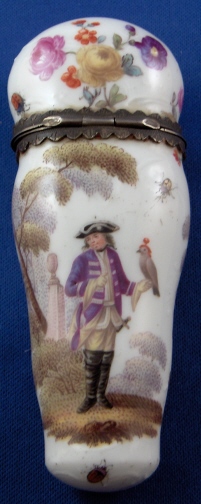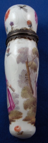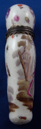 This is a superb sewing / needle case (I guess it could have been for some funky glasses too) made by Fuerstenberg in the late 18th century. It is handpainted with some superb scenes as well as flowers and has silver mountings. The flowers and small bugs are typical for 18th century Fuerstenberg of this period as are the scenes. One is of a gentleman holding a falcon and the other side is of a lady holding a fan (I think) and wearing a nice dress. Both are surrounded by a landscape type scene. There is also a bit of a relief design to the paste which might be hard to see in the photos. The piece is not marked but there is no doubt to it being made by them during this period! It is in supeb condition with a few tiny scratches but they are limited to the white areas and do not affect the scenes or other paintings. The hinge is a tiny bit loose but it closes tightly and all is well. The sewing case is 4.25 inches tall, 1.625 inches wide and 1.125 inches deep. A very nice piece and quite the rare find! Please email me for more information or photos.