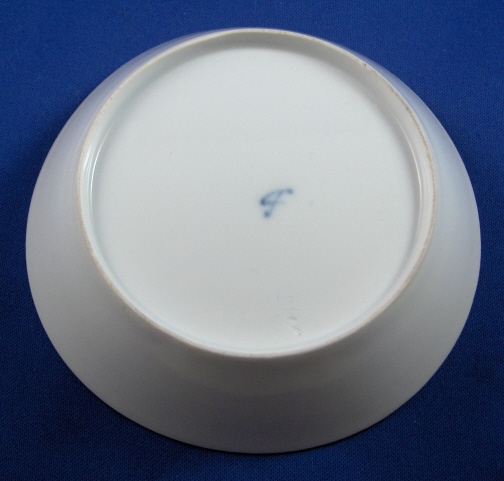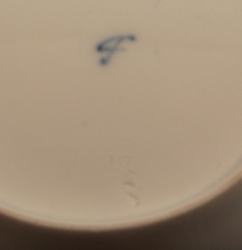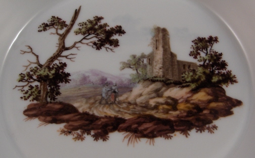 This is a saucer made by Fuerstenberg around 1780. Very nicely handpainted with a landscape scene with a ruin, rocks, trees and people in it. Also a nice gold trim. The saucer is just over an inch tall and 5 inches in diameter. It is in super condition with very little wear to the gold trim and is marked with the underglaze blue script F mark as well as an impressed S and 12. Please email me for more information or photos.