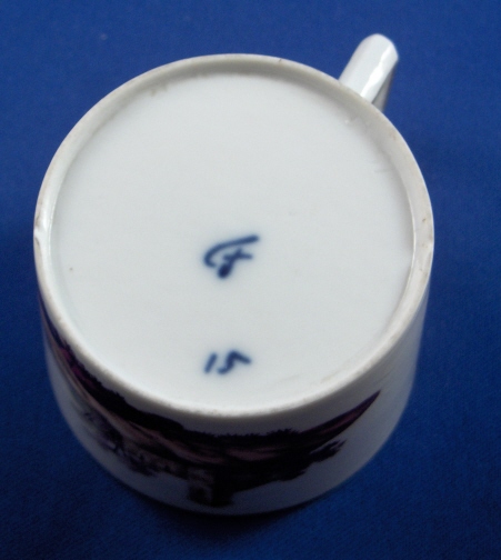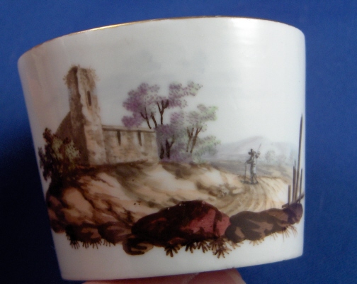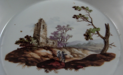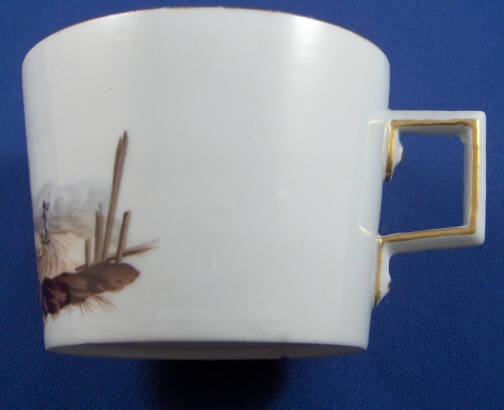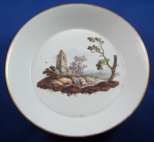 This is a cup and saucer set made by Fuerstenberg around 1780. Both pieces are very nicely handpainted with a landscape scene with a ruin, rocks, trees and people in it. Also a nice gold trim. The cup is 2 inches tall and 2.75 inches in diameter. The saucer is just 1.125 inches tall and 5 inches in diameter. Both are in super condition with very little wear to the gold trim and is marked with the underglaze blue script F mark. Please email me for more information or photos.