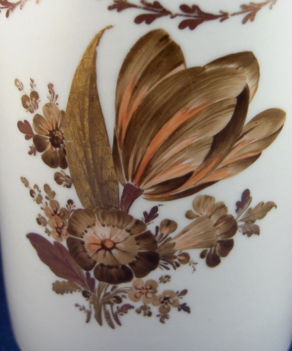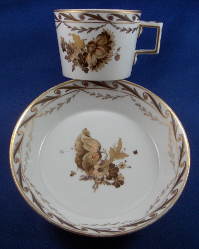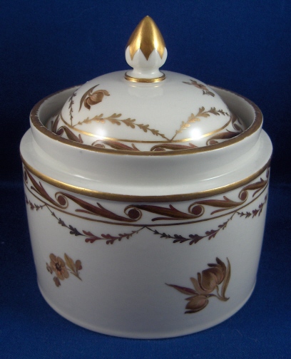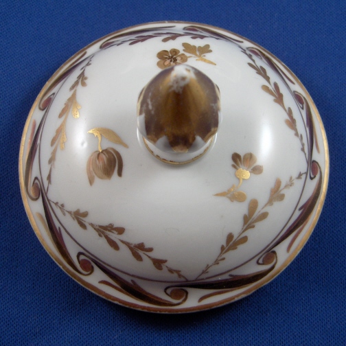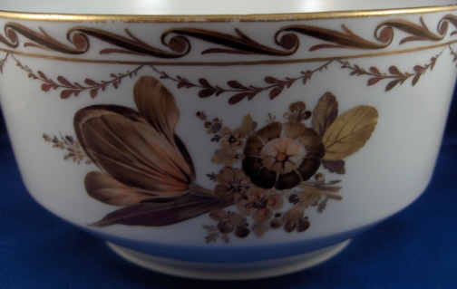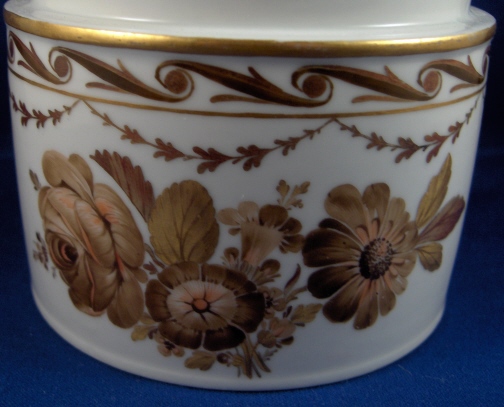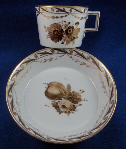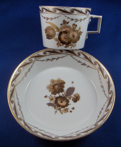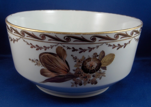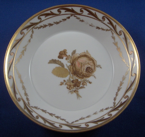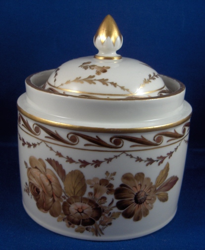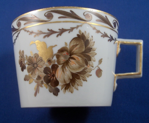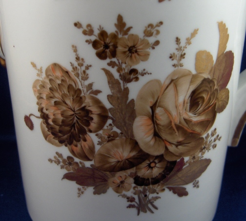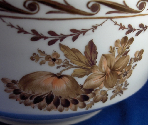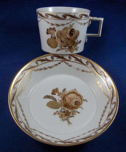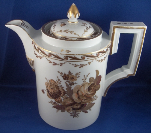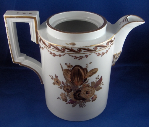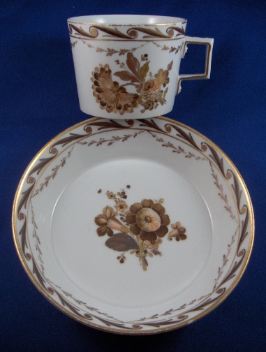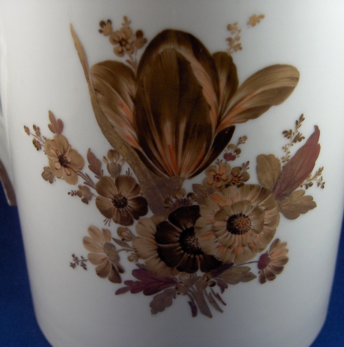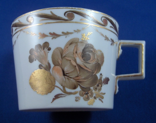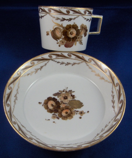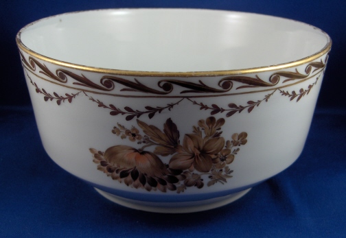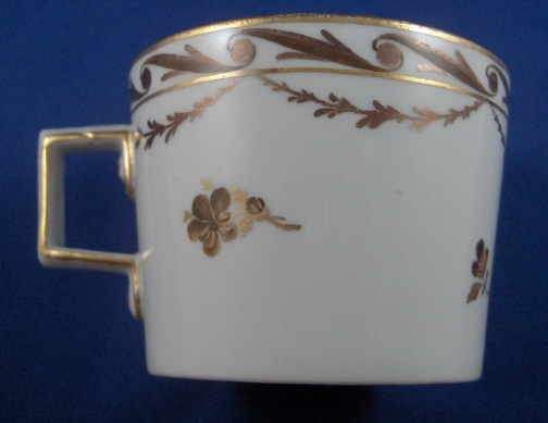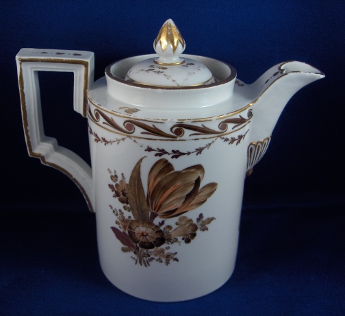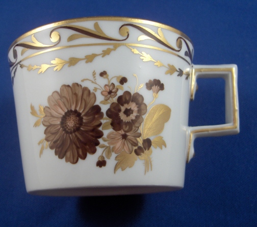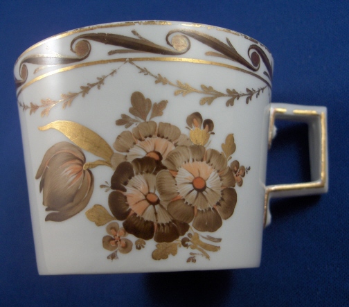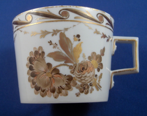 This is a tea and coffee service made by Fuerstenberg in the late 18th century. All pieces are handpainted with flowers in the Sepia colors with gold highlights with the cups and saucers all having one large flower arrangement and the cups also have some small single flowers. The larger pieces all have two large flower arrangements and some smaller flowers. All pieces have a nice rim design with some gold trim. The square handles which I happen to love are typical for the classicism period around 1800. All pieces are marked with the underglaze blue F mark underneath as well as some other incised numbers and letters. The set is in great condition with one cup being a later replacement but still quite old (early to mid 19th century). There is a little bit of wear to the gold highlights mostly as well as the rims. The smaller pot has some nibbles on the spout and a small long chip on the handle. The lid of the larger pot has a few small nibbles underneath and that is really it. The smaller pot is 5.75 inches tall and 3.25 inches in diameter, the larger pot is 8.75 inches tall and 4.75 inches in diameter, the sugar dish is 4.75 inches tall and 4 inches in diameter, the waste bowl is 3.5 inches tall and 7 inches in diameter, the cups are 2 inches tall and 2.75 inches in diameter and the saucers are 1.125 inches tall and 5 inches in diameter. Please email me for more information or photos.