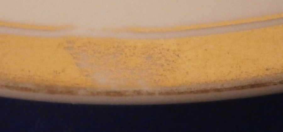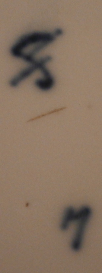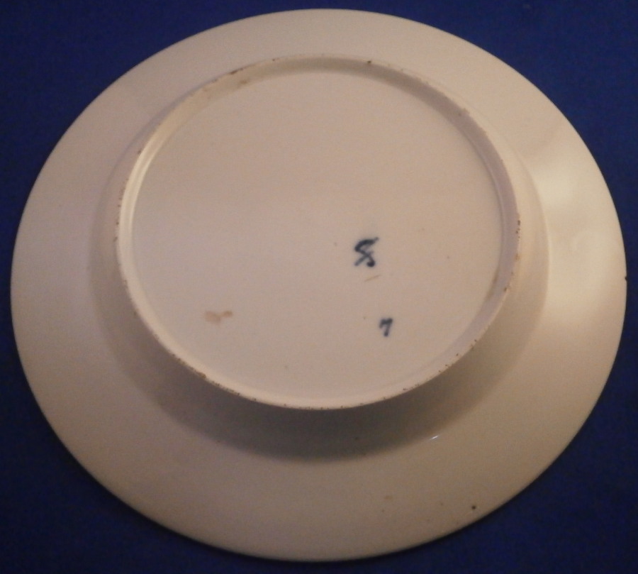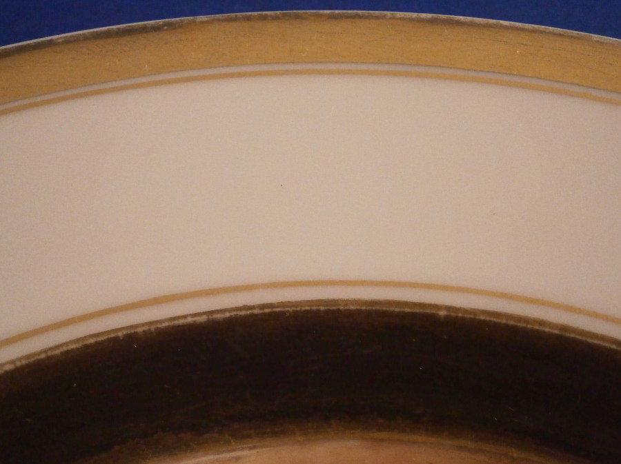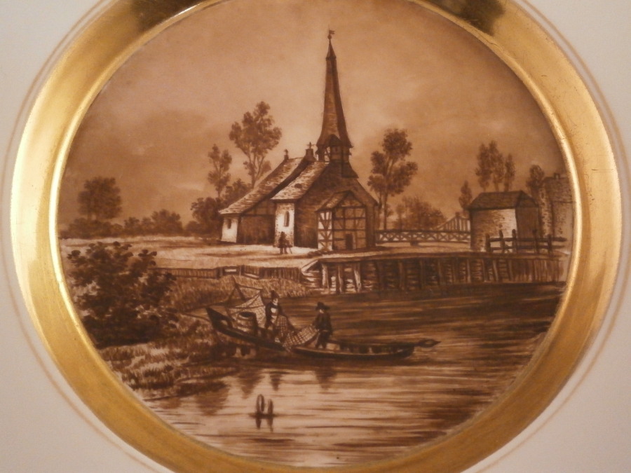 This is a great plate made by Fuerstenberg around 1820. The piece is hand painted in sepia tones with a scene of a town during this era. Not sure which one but maybe someone could identify it. It is not my hometown of Holzminden since there is a bridge in the background and the one in my town wasn't build until the 1880s. It is likely a bridge over the river Weser in the region so that could be a good clue. Either way the scen has a large buidling in the center right next to the river with a boat and passengers in the front and a couple of other buildings and some trees and bushes. The rim has two thick gold rings with a thin gold line along the edge of the thicker gold rings. A typical Biedermeier style piece that looks stunning. Hard to find these scenic pieces from this time period! The mark was used from 1820-1860 but this style looks closer to the 1820 end of this period. The plate is 1.125 inches tall and 8.5 inches in diameter. It is in great condition with some use marks to the gold trim with one spot around 7 o'clock that is more worn. It displays perfectly! The piece is marked with the under glaze blue script F mark of the period as well as blue number 7 as shown. A scratch mark under the F denoting it as a second choice piece possibly because of a few black firing spots. Wish it was labelled as to the town on the front but no such luck :( Please email me for more information or photos.