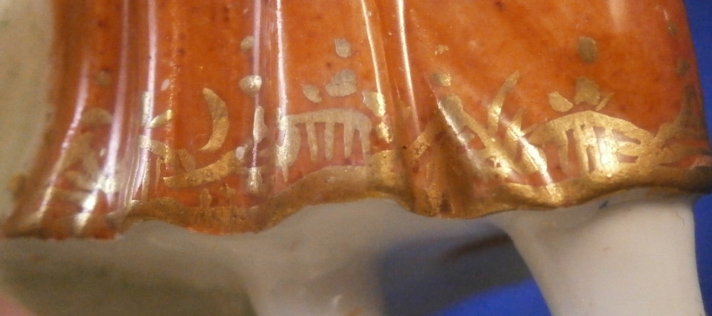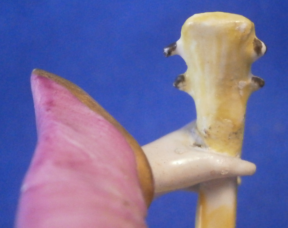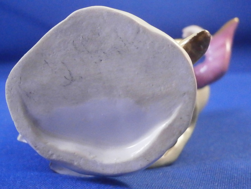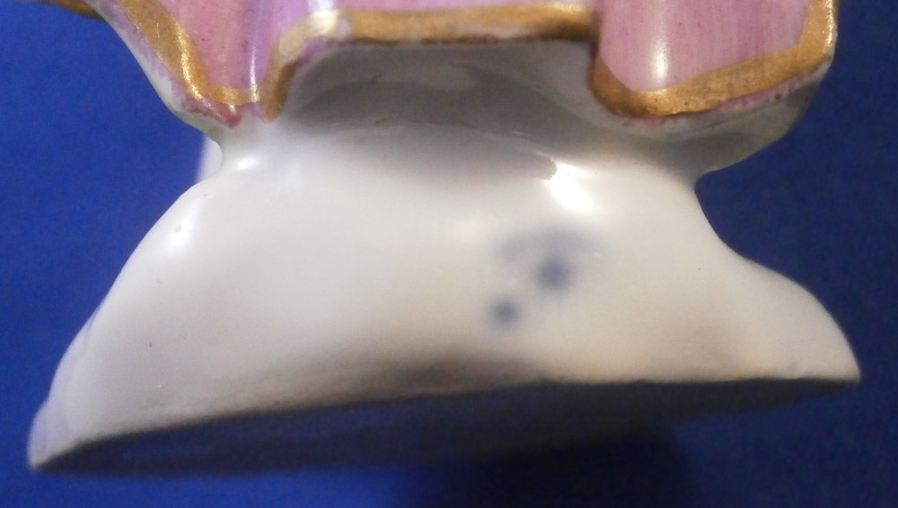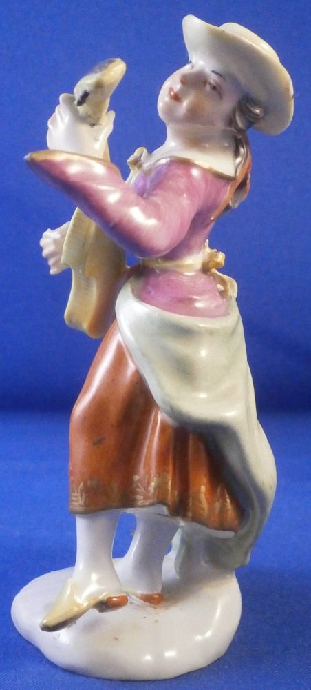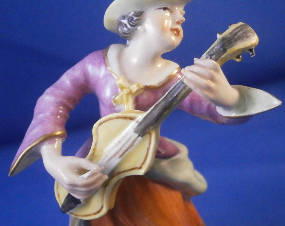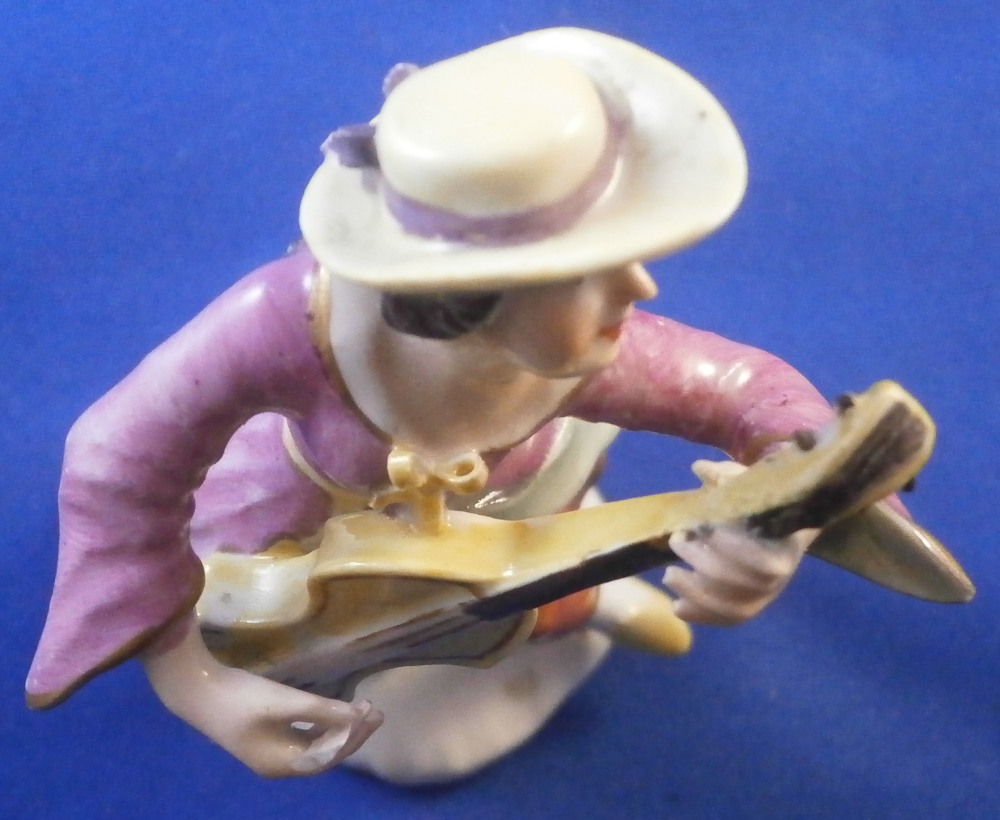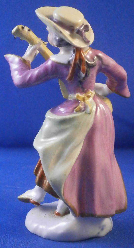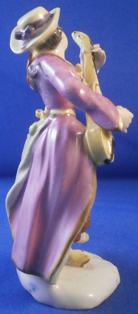 This is a cute little figurine of a lady playing the guitar made by Fuerstenberg around 1765. I could not find this model but did find a male violin player of the same size that was modeled by Anton Carl Luplau so I assume there is probably a whole set of these out there though rare for sure. The lady is nicely modeled with an orange skirt with nice gilding along the bottom edge, a pink long robe covering most of the rest of her. She is wearing a nice hat with a bow to it, has a yellow bow to the front and back and off course is holding the guitar. Typical early base. The figure is marked to the back of the base with the under glaze blue script F mark used from 1760 until 1770. The figure is superbly hand painted and is in great condition with some minor damage to a string end of the bow on her hat, similar damge to the orangestring in her hair and the end of the guitar has been restored as shown. None of this is obvious and she displays superbly! The figure is 3.5 inches tall, about 2.125 inches wide and 1.5 inches deep. Please email me for more information or photos.