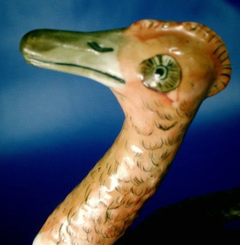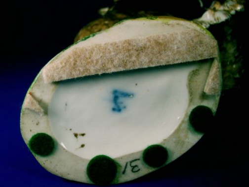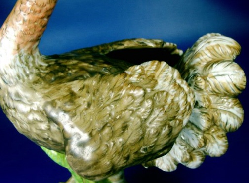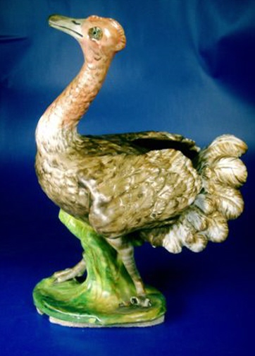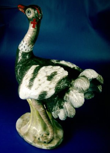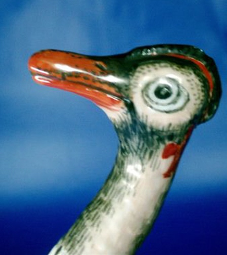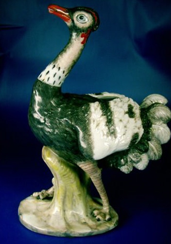 This is a rare pair of Ostrich made by Fuerstenberg in about 1770. It is very rare to find both the male and female of this set. Both are superbly painted and are just a really nice pair of figurine to display. They are both in superb condition. He has a firing crack between his toes and she has a kink in her left leg due to the firing process. He is 6.5 inches tall and she is about 6 inches tall. The dating of this pair is a bit difficult but there is a male at the Herzog Anton-Ulrich-Museum in Germany that dates to 1756 and has the same mark. Please email me for more information or photos.
