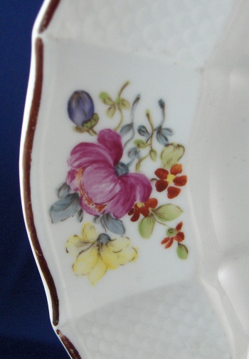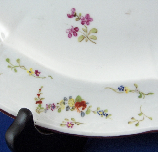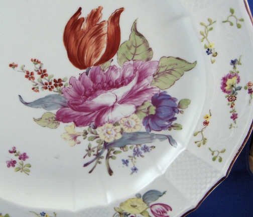 This is a plate handpainted with super detailed flowers made by Fuerstenberg in the 18th century right around the beginning of the factory. It has a nice relief design to the rim with a few larger flower arrangements and some sprigs painted on it. In the center is a large flower arrangement of superb quality and two small sprigs and a leaf. The plate is marked with the underglaze blue F mark underneath as well as an impressed W with a hole next to it. It is 1.375 inches tall and 9.5 inches in diameter so a nice size. The plate is in great condition with a bit of wear to the outside rim color and some chips to the footring the plate is standing on. Please email me for more information or photos.