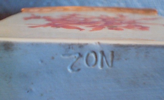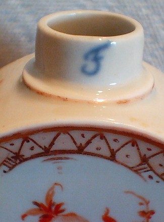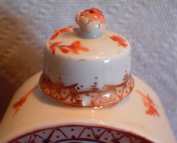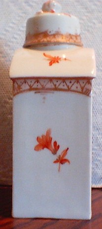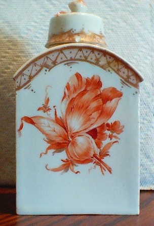 This is a lidded tea jar made by Fuerstenberg in the 18th century. It is handpainted with a nice orange floral arrangement on the front and back as well as some smaller flowers on the sides and the lid. Nice peach colored trim with gilding on top of it to top edge here and the bottom edge of the lid. Floral finial to the lid. It is not common to find the original lid on these at all and the condition of this piece is superb with just one small chip to the lid edge. The piece is marked with the underglaze blue F mark on the rim which would be covered by the lid. Also udnerneath No2 which is a size reference. It is 5 inches tall, 3.75 inches wide and 1.75 inches deep. Sold a long time ago hence the different style pictures but it was worth having it on the site as a reference. Please email me for more information or photos.