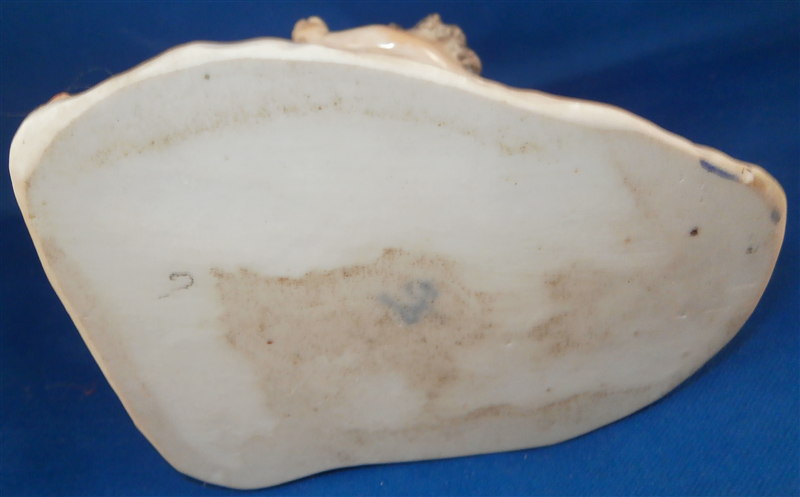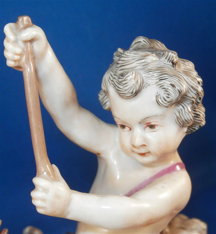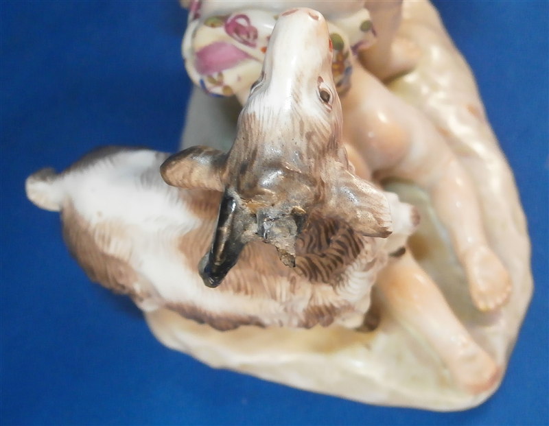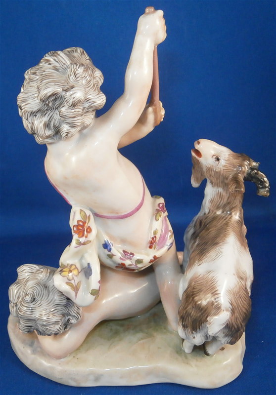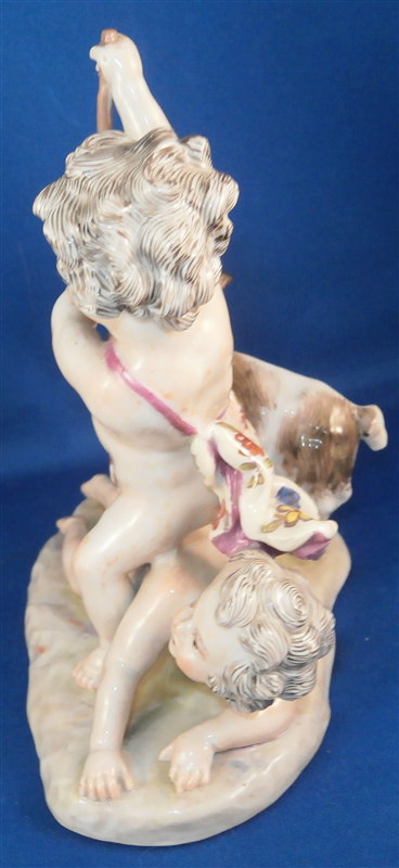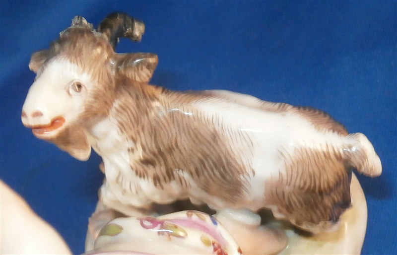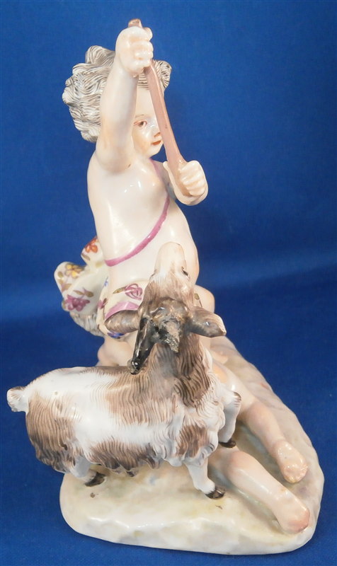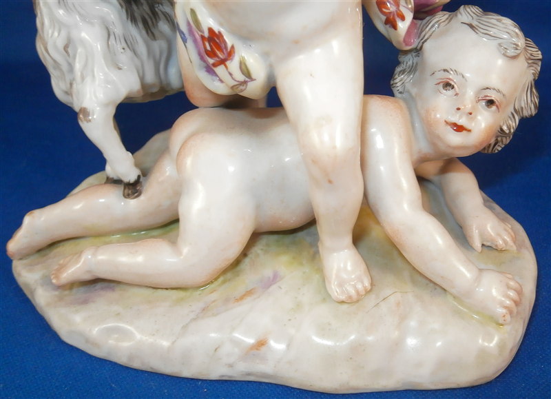 This is a figurine designed by Simon Feilner of two putti with a goat mady by Fuerstenberg in about 1800. A very well modeled figurine that is fun to look at. Not sure what this piece is meant to represent if anything or is just meant to be a fun piece. One putto is standing over the other that is crawling on the floor with the goat next to them looking up at the item the standing putto is holding in his hands. Not sure what it is - possibly a whip?? The figurine is 5.125 inches tall, 4.375 inches wide and 3.25 inches deep. It is marked underneath with a faint script F mark as shown. The piece is in great condition with the horns of the goat being damaged but it displays nicely! Please email me for more information or photos.