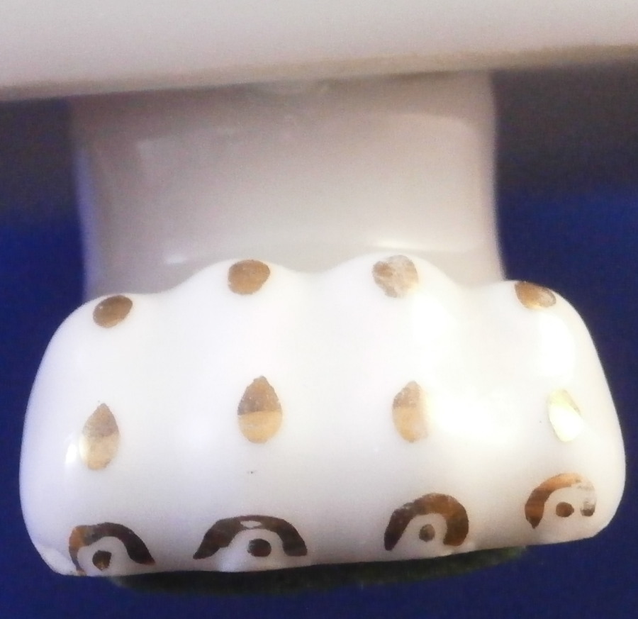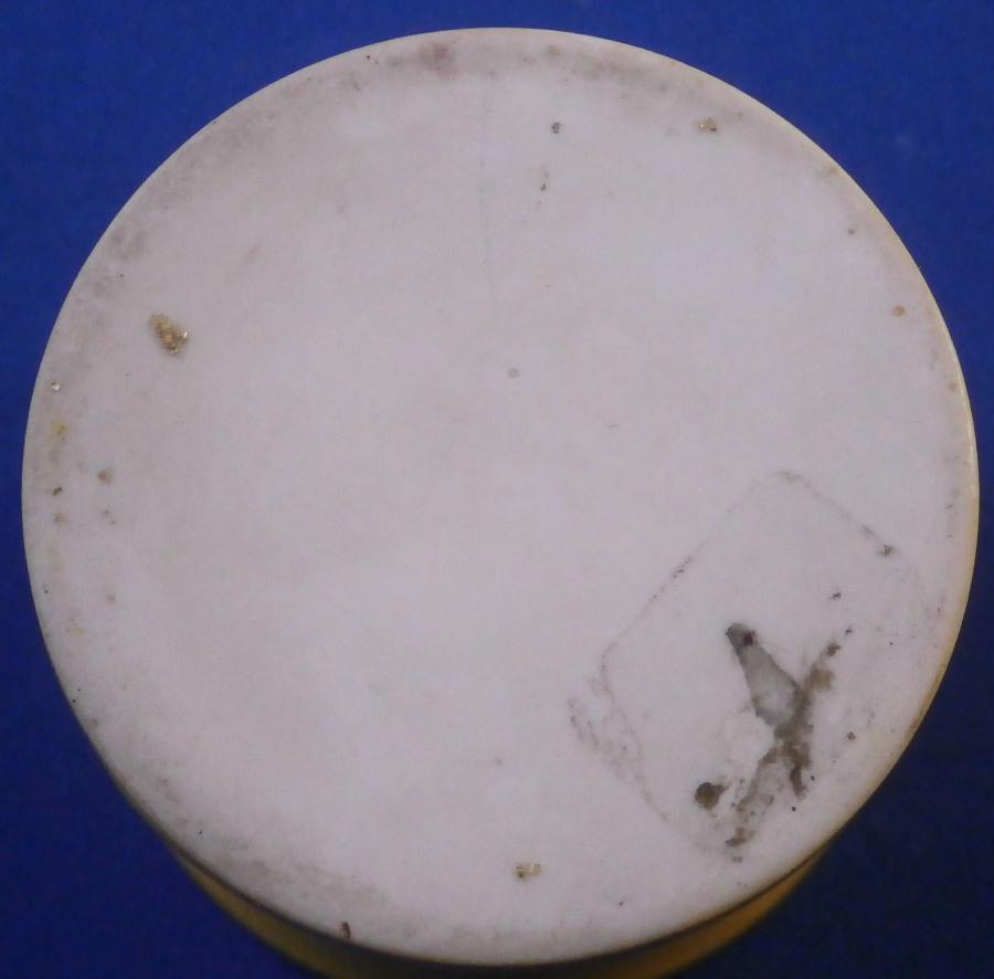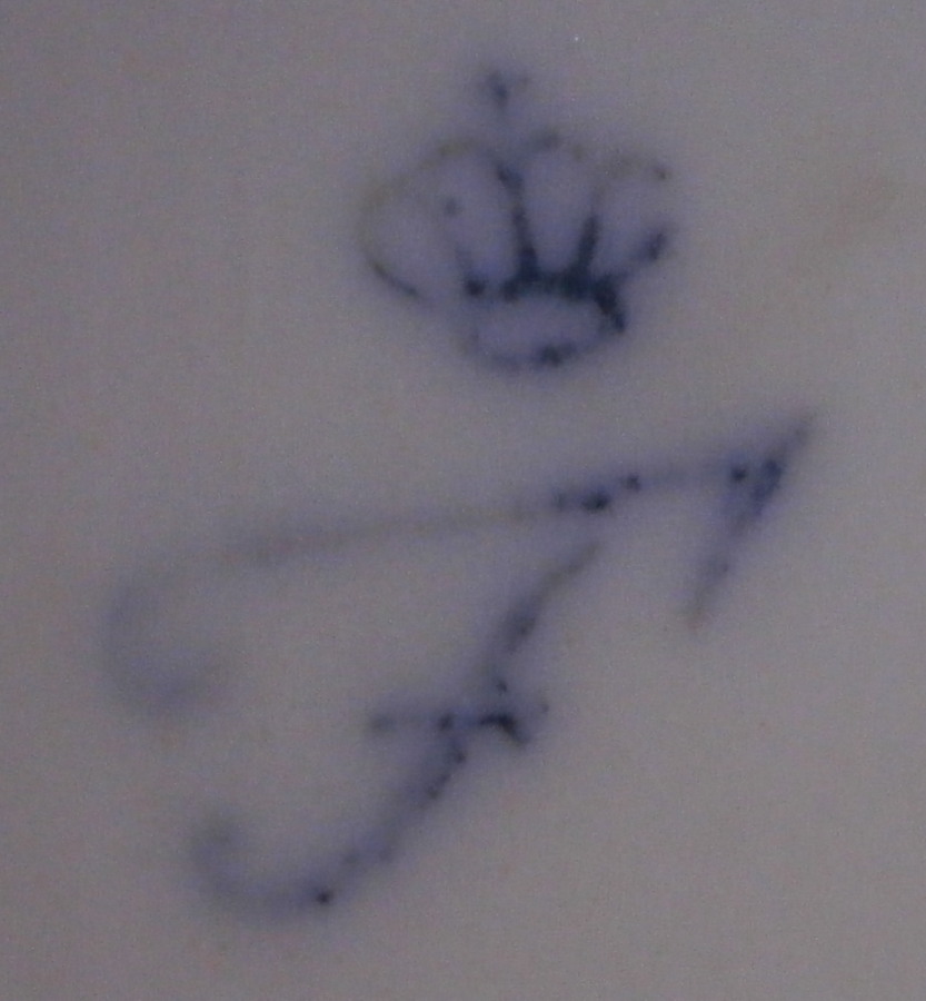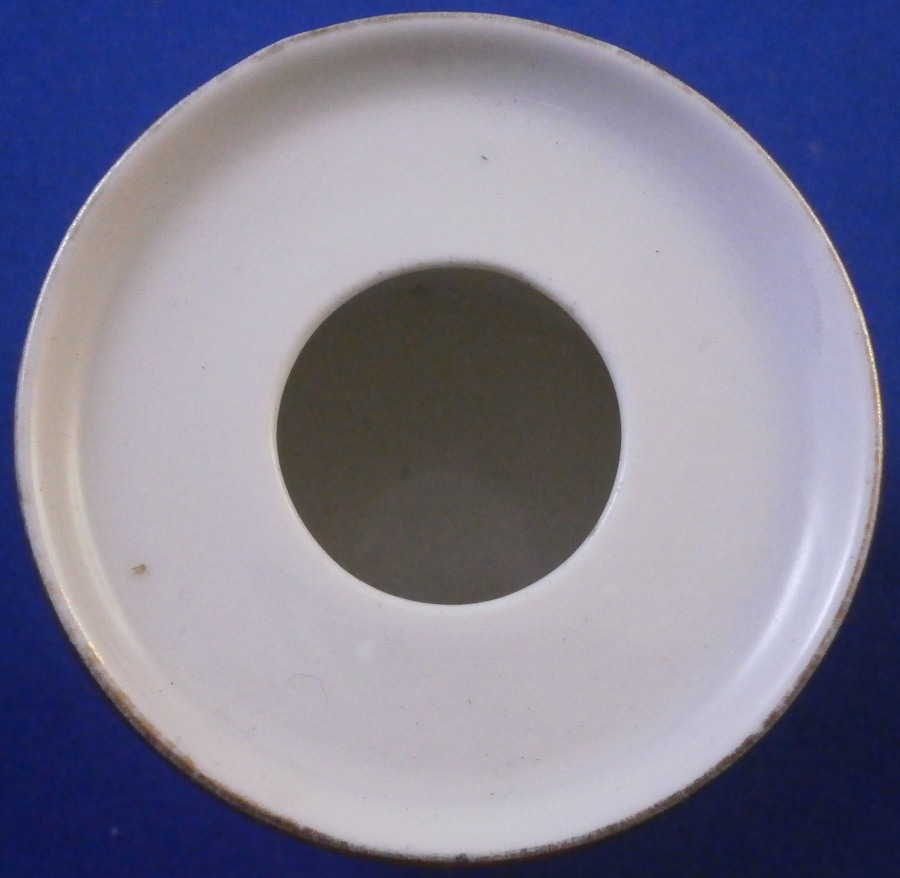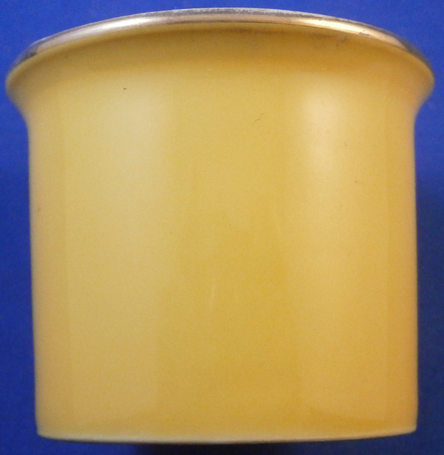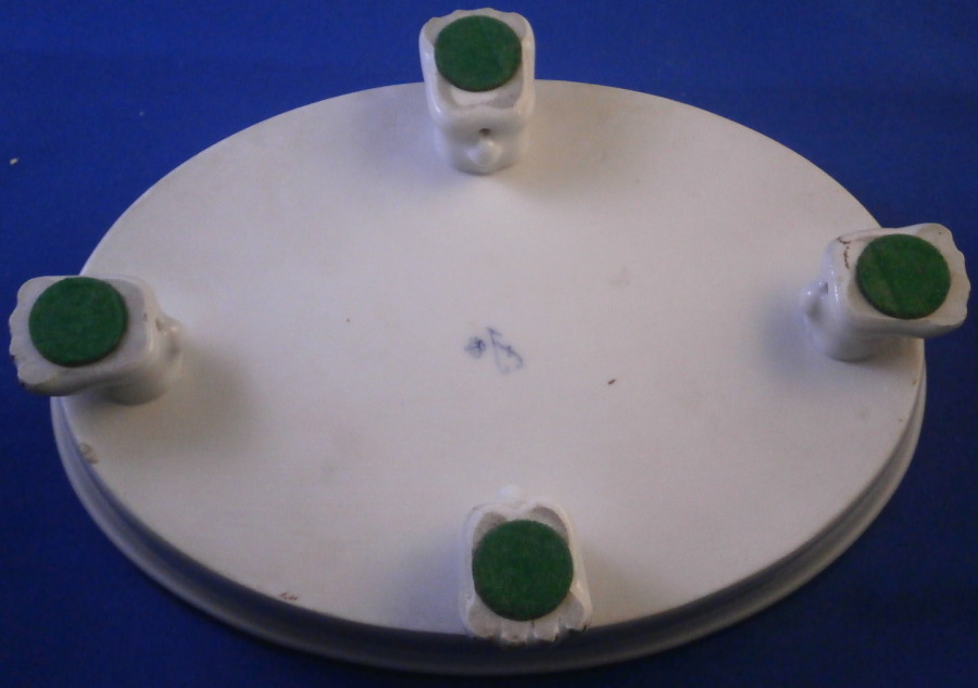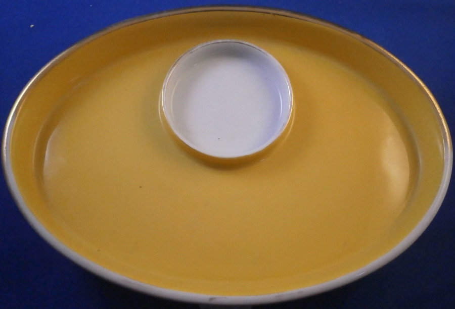This is an inkwell with its undertray made by Fuerstenberg in the mid 20th century. The piece has a superb yellow ground color to it that in combination with the white porcelain and gold trim give it a very mid century modern feel. One does not see yellow all that often on porcelain since I believe the color is derived from gold which makes it rather expensive. The little inkwell is separate and just sits in its spot in the tray. The tray sits on four claw shaped feet. The tray is marked underneath with the blue F under a crown mark while the little ink pot is not. The tray is 7.75 inches wide, 5.375 inches deep and 1.75 inches tall including the feet. The little inkwell is 1.875 inches tall and 2.25 inches in diameter. The set looks nice but was used quite a bit since the gold trim along the front of the edge of the tray has worn off. There is an almost chip along the edge of the ink pot as shown. It never came off and you cannot see it from the outside but the inside has a faint crack line where the crack started. It's stable and really not obvious when on display. Still a neat and quite different looking set. I also have the matching blotter on the site if anyone would like the combo. Please email me for more information or photos.