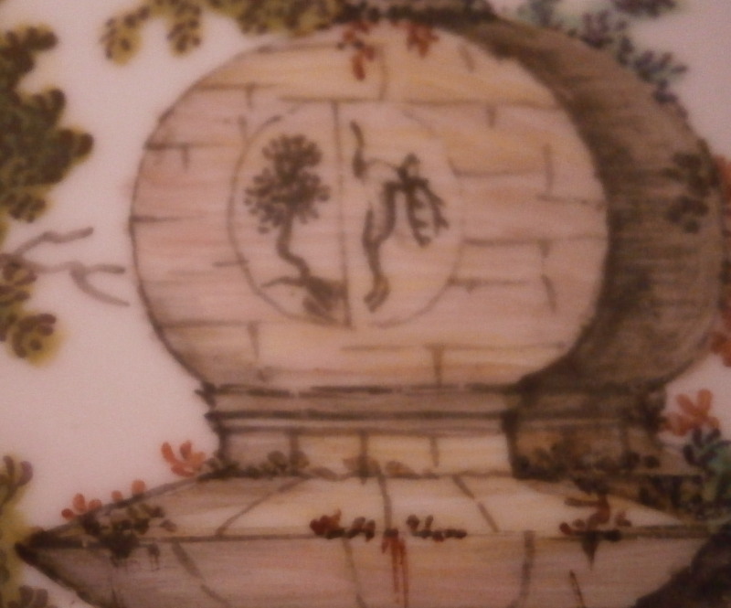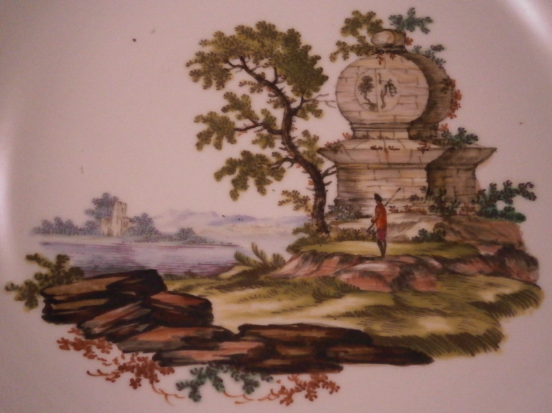 This is a superb and very rare saucer made by Fulda in the 18th century. Fulda was founded by Prince Abbot Heinrich VIII von Bibra zu Fulda in 1764. The factory closed its doors after a short existence in 1789. The figures of Fulda are probably the most expensive pieces of German porcelain one can own but it is rare to find any pieces by this maker as they only made porcelain for a few years. The saucer is marked with the underglaze blue FF mark under the crown and an impressed I (I think) and A. The piece is hand painted with nice polychrome scene filling the entire center and a simple gold trim to the edge. It is one of the nicest scenes I ahve seen by them! The scene includes a ruin with a circle in the center - half of which has a tree painted in it and the other half a jumping deer which is easier to make out if you turn it 90 degrees. It might be a reference to an armorial but I am not sure. Another thing that struck me is an area in the hills in the background that very much looks like a signature to me but I cannot make it out even with a magnifying glass. I am quite certain it is a signature though. The saucer is 1.125 inches tall and 5.5 inches in diameter. It is in superb condition with just a touch of wear and a few small black firing spots. Definitely a rare and interesting piece! Please email me for more information or photos.