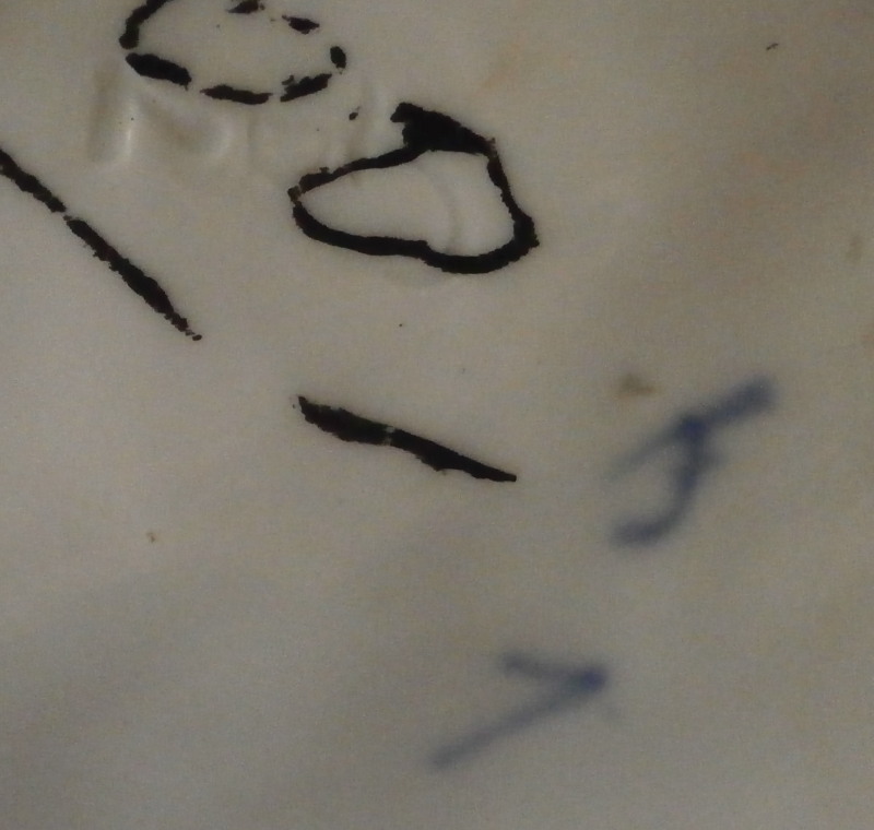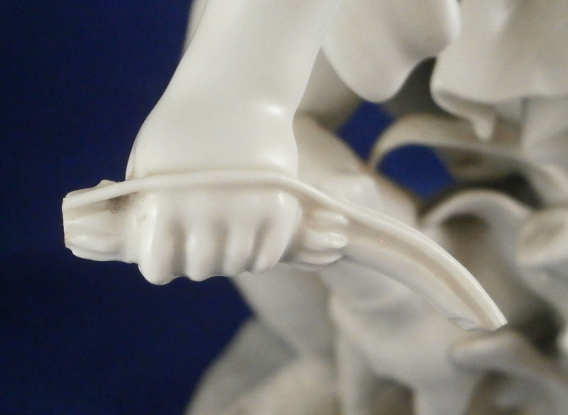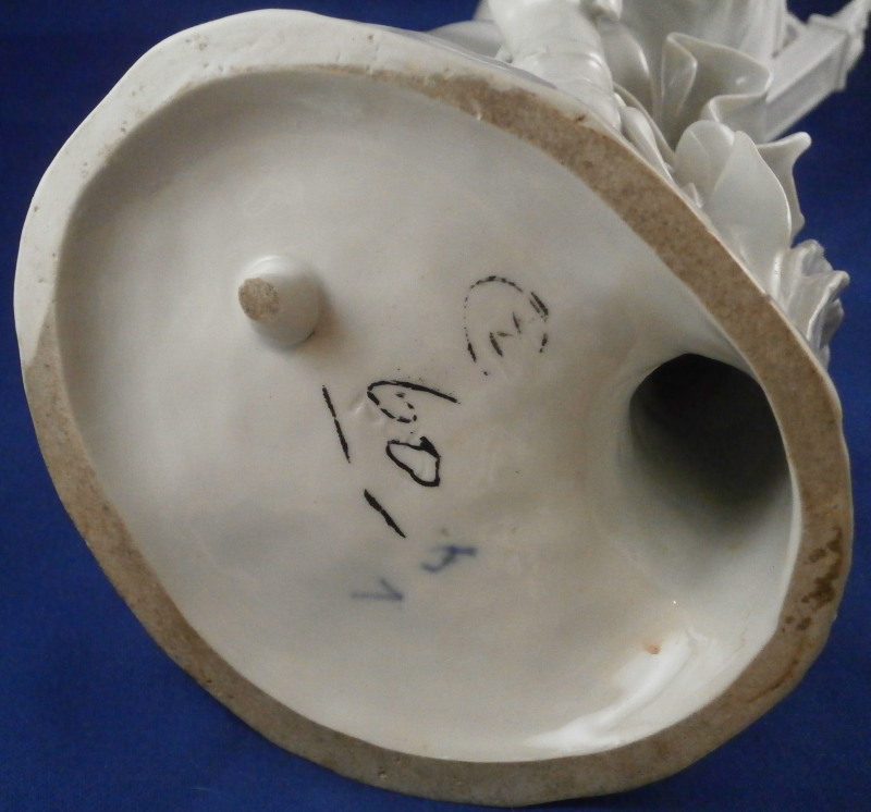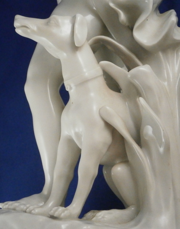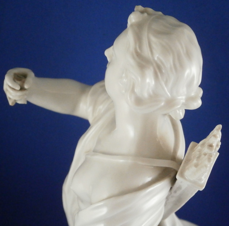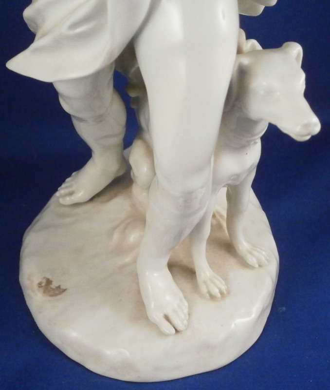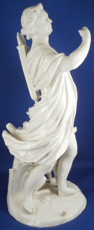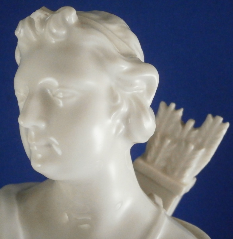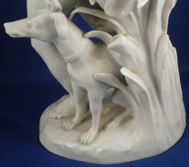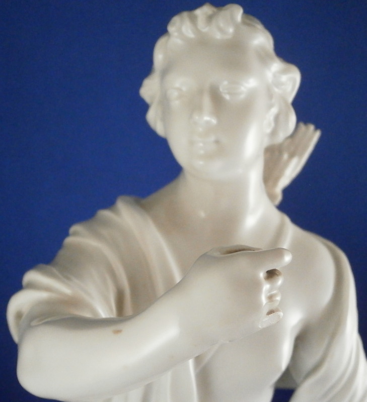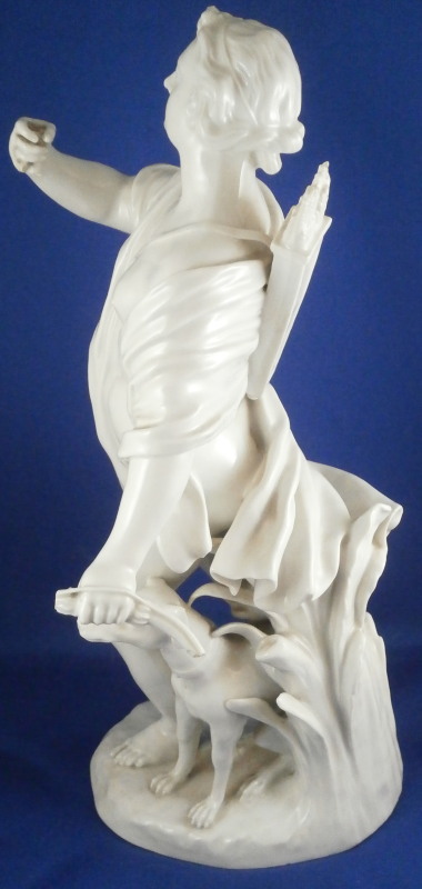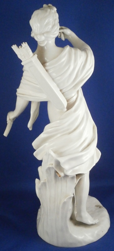 This is a great figurine of the goddess Diana made by Fuerstenberg in the 18th century. An early piece that is modeled superbly and larger than many pieces one finds. Diana was the goddess of the hunt among other things. The figure is of a semi nude Diana with her dog holding a bow and a spear with the quiver of arrows on her back. The piece displays nicely but has some expected damages. The spear is missing though I ahve also seen her with an arrow instead in that hand, the bow mostly missing and the corwn in her hair i smissing the half moon piece in the front though that is not obvious at all. An unglazed spot to the top of the base likely where the spear touched the base and was ground down a bit. All in all in good condition given the age and nature of the piece. The figure is 11.5 inches tall, about 5.75 inches wide and 4.75 inches deep. The piece is marked with an under glaze script F mark in blue as well as a number 7 and the usual impressed / incised marks as shown. One looks like a small script f with a D in the bottom end. I think she was modeled by the famous Simone Feilner . I also own the matching Mercury figurine. Please email me for more information or photos.