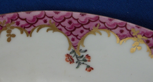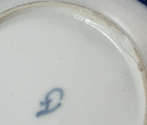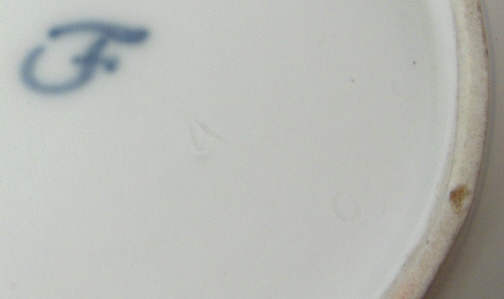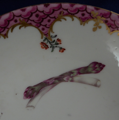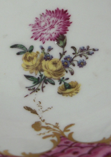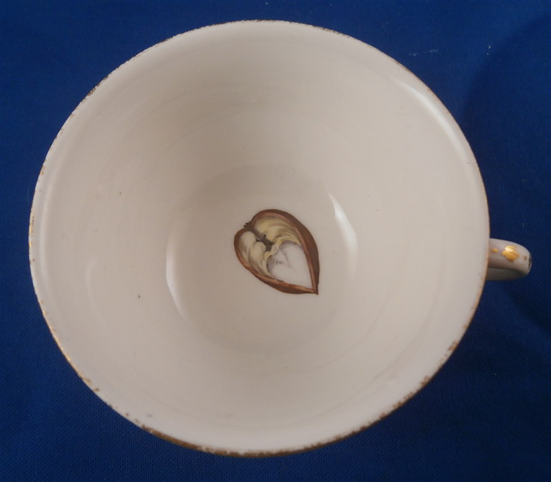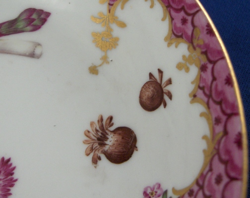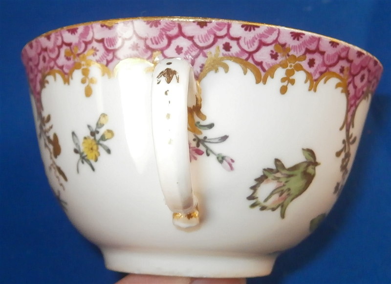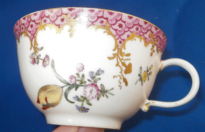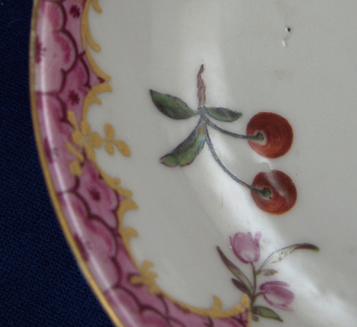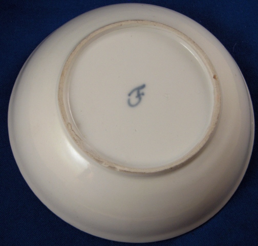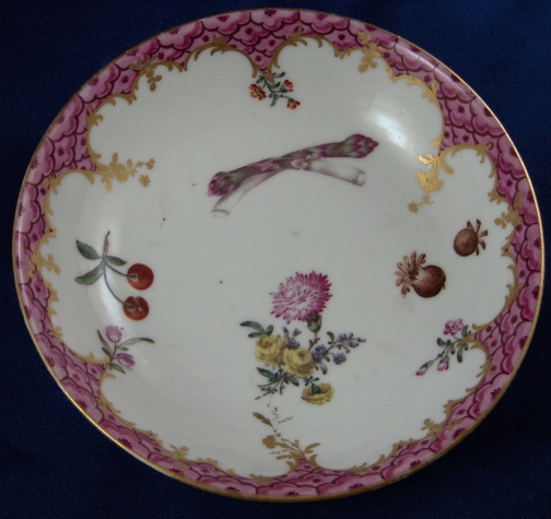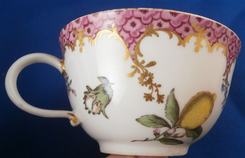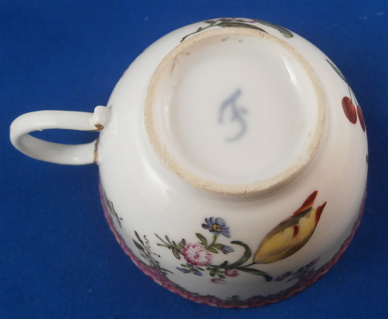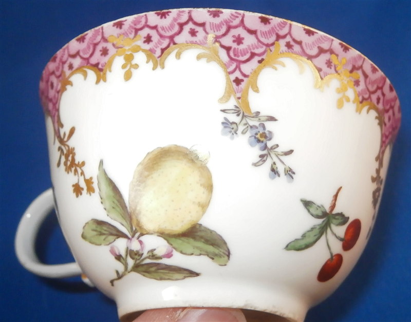 This is a superb cup and saucer made by Fuerstenberg around 1765. Both pieces are superbly handpainted with a nice design of fruits and veggies, some flowers and a neat puce rim design with gilding. One of the nicest sets I have seen by them in quite some time! The cup is 1.875 inches tall and 3.25 inches in diameter. The saucer is 1.375 inches tall and 5.375 inches in diameter. They are both in great condition with a little wear to the clear glaze from stacking and a chipped area to the footring underneath on the saucer and some wear to the gold trim on the top edge of the cup. The set is marked with the underglaze blue script letter F as well as an incised 4. Please email me for more information or photos.