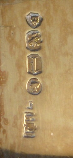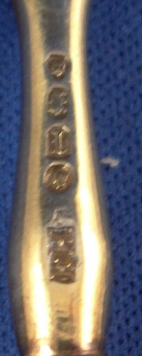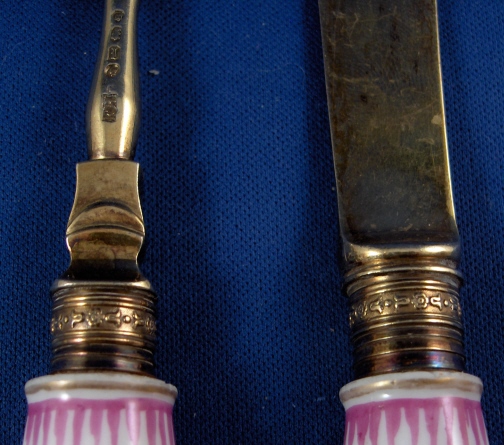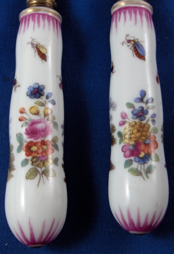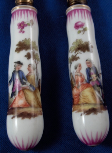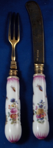 This is a rare knife and fork set made by Fuerstenberg in about 1840. Both pieces have handles made of porcelain that are handpainted with a scene of a couple in a landscape surrounding with some scattered small flowers and bugs plus a larger floral arrangement on the other side and a puce trim to the top and bottom ends. The metal parts are made of sterling silver and appear to be of British origin judging by the hallmarks. The pieces are in top condition with the silver tarnished a bit to look golden. The handles are 3.375 inches long and 0.75 inches in diameter. The metal parts are 4.5 inches long for the fork and 5.25 inches long for the knife. They are not visibly marked though the style of painting is clearly Fuerstenberg. Please email me for more information or photos.