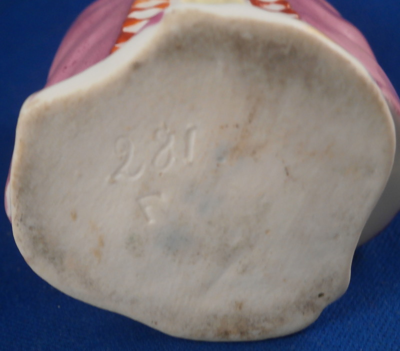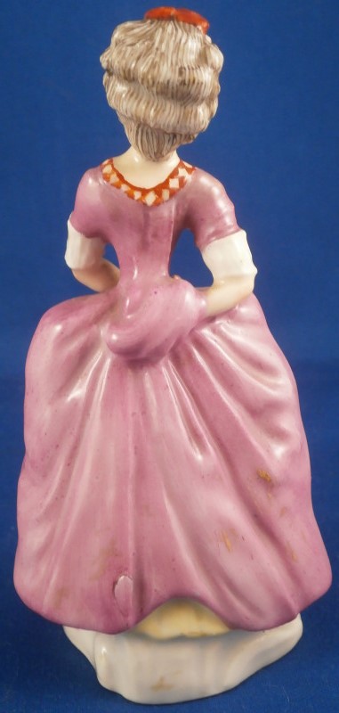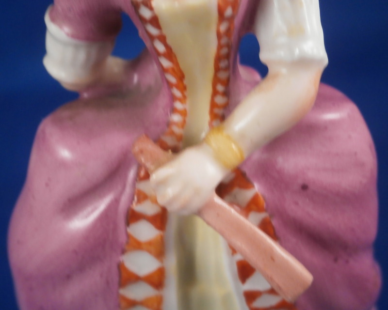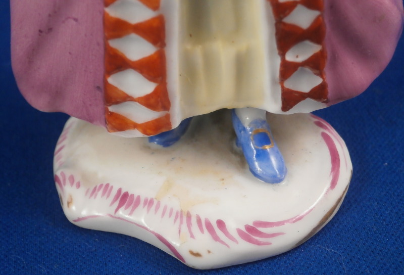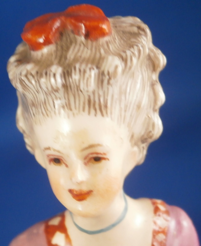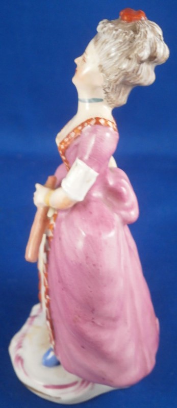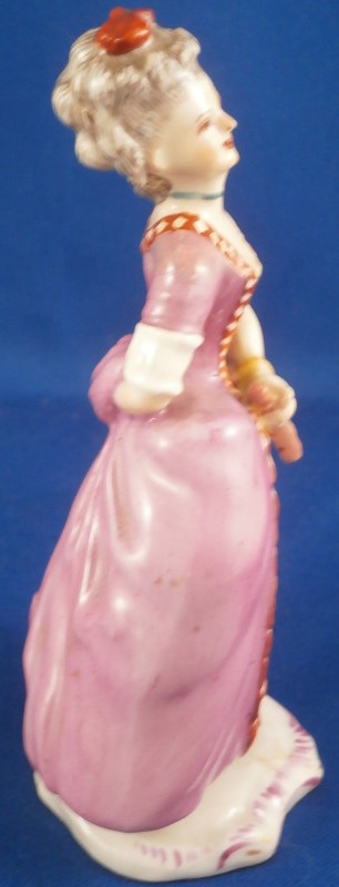 This is a figurine of a lady holding a fan made by Fuerstenberg around 1770. It is marked with a very faint blue crossed swords mark with a star below mark as well as an incised number 281 and an impressed letter F. I am fairly sure she is one of the Commedia del Arte pieces since I have owned a a very similar piece that was holding a mask and had the same incised number and a different letter. The figure is superbly modeled and hand painted. She is wearing a great ball gown and a cute little red bow in her hair while standing on a typical base for this maker highlighted with puce trim. The piece is in great condition with a bit of work done to her right shoulder area not sure if there was a chip or some paint flaking. There is a flaw to the porcelain from the making to the back bottom of her dress. She displays perfectly! The figure is 4.625 inches tall, about 2.5 inches wide and 2 inches deep. Please email me for more information or photos.