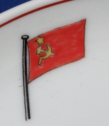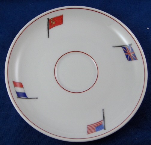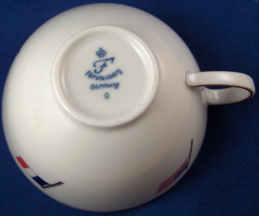 This is a rare cup made by Fuerstenberg around 1945 and used by the representatives of the US, UK, Soviet Union, and France at meetings of the Allied Control Council ( Vier Mächte ) which issued directives, laws, and proclamations to the four occupied zones of postwar Germany. Neat set with a lot of history attached! Both pieces are decorated with hand painted flags of the four nations ( Allied Powers ) as well as a red line around the rim. The cup and saucer are in perfect condition. The cup is just over 2 inches tall and has a diameter of 3.75 inches. The saucer is 0.75 inches tall and has a diameter of 5.625 inches. Both are marked underneath with the underglaze blue F mark with Fuerstenberg Germany underneath and a crown above. Please email me for more information or other pictures.