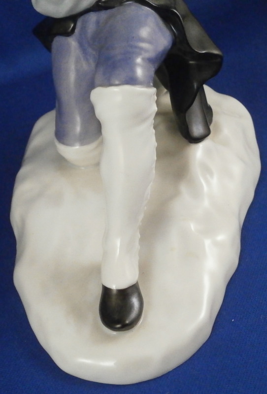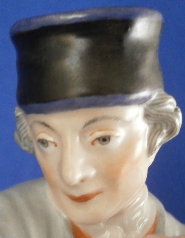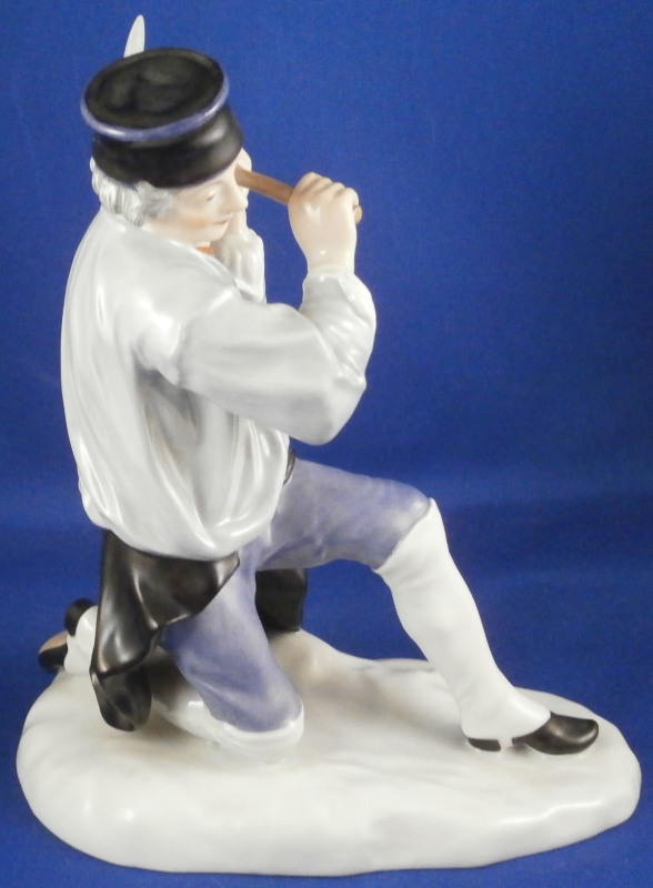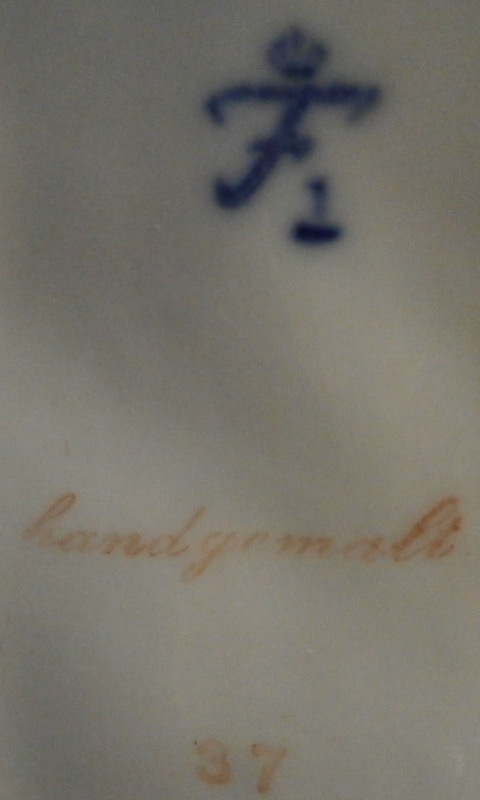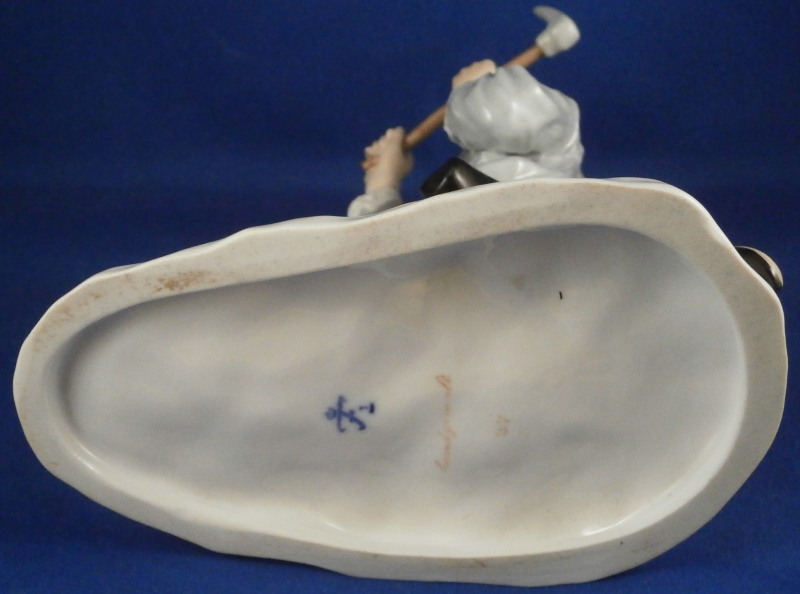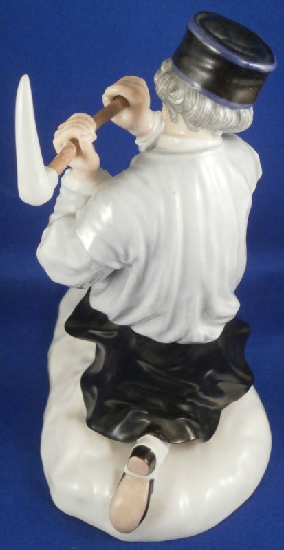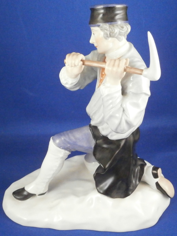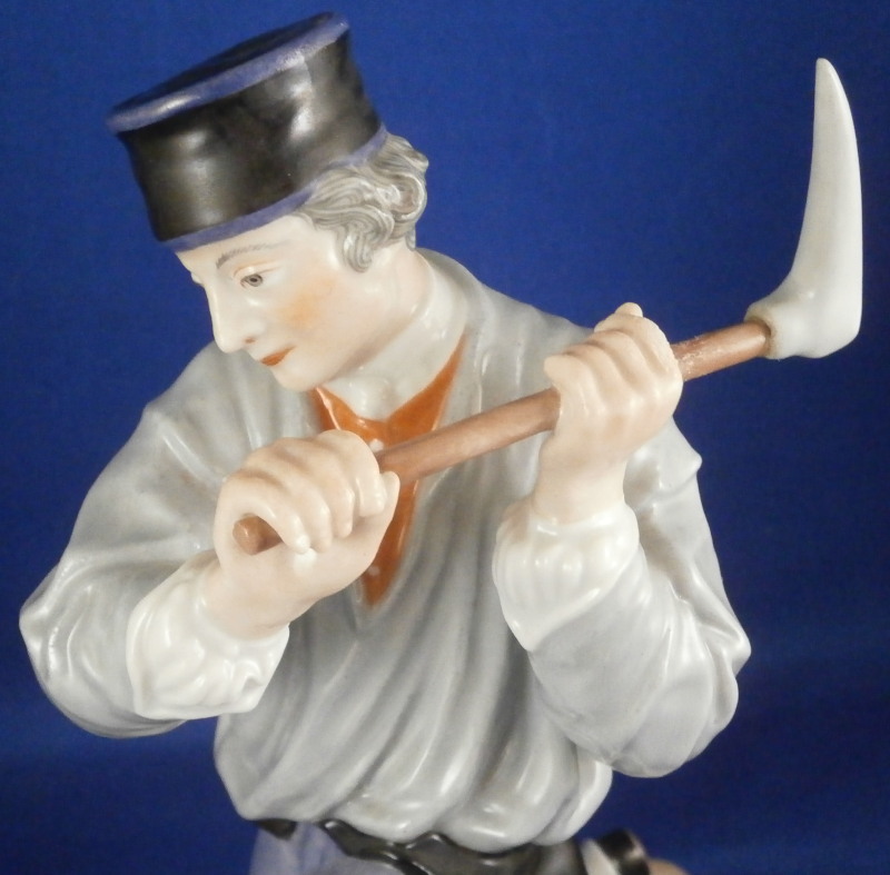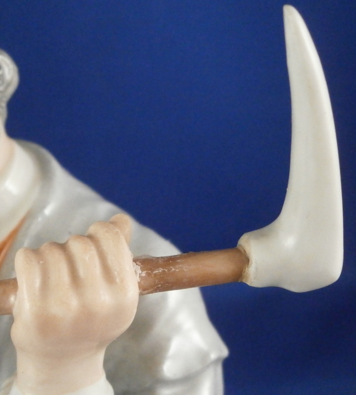 This is a figurine of a miner mady by Fuerstenberg in the 20th century. They are quite famous for this series of figures and they are often left in the white but here we have a muchr arer polychrome version. The miner is using a pickaxe to break the rocks down. He is well dressed with the traditonal hat on. Very well modeled and hand painted. The figure is in great condition with the back end of the handle by his hand having been broken and reglued. Displays perfectly and it is sadly a common issue on this figurine! The piece is 6.5 inches tall, 3.5 inches wide and 5.625 inches deep. It is marked underneath with the underglaze blue script F mark with the crown over it with a number one next to it, the number 37 printed in red which is likely a painter number and handgemalt in red which means hand painted. Please email me for more information or photos.