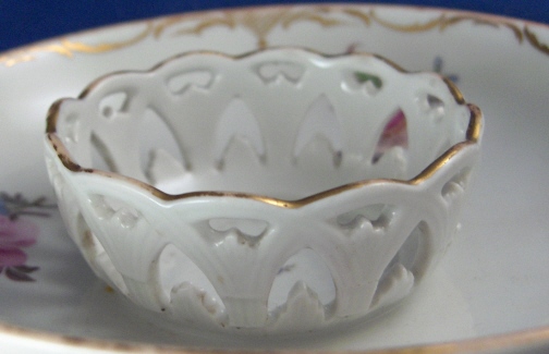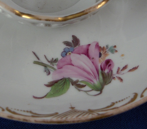 This is a rare trembleuse saucer made by Fuerstenberg in the 18th century. It is handpainted with three small floral arrangements as well as a nice gold trim. Small flower in the center of the very nicely reticulated center that would hold the cup. These were made for people whose hands were shaking a lot so they wouldn't spill their drink as easily as with another type of cup. The saucer is in great condition with just some wear to the gold ring on the very edge of the saucer. A bit of wear to the clear glaze in the center where the cup used to sit which shows it was used a lot back in the days! The saucer is 1.375 inches tall and has a diameter of 5.25 inches. It is marked underneath with the underglaze blue scipt F mark as shown. Please email me for more information or other pictures.