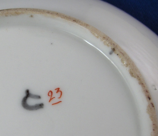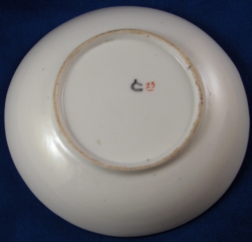 This is a very rare porcelain saucer made by the Gardner factory in the 18th century. It is nicely handpainted with a large floral arrangement as well as a small flower bid with an orange brown trim to the edge. A very nice saucer that one will not see again soon - sadly no cup :( The saucer is 1 inch tall and has a diameter of 5.375 inches. It is in great condition with just some very minor wear. The dish is marked underneath with an underglaze blue capital G and a number 23 with a line under it in red. Please email me for more information or other pictures.