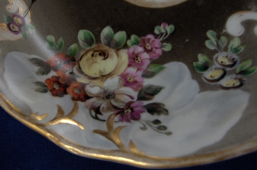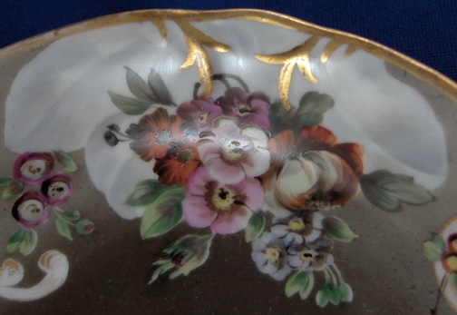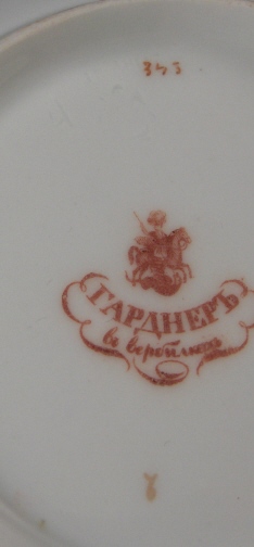 This is a superb saucer made by Gardner / Moscow in the 19th century. This style I am more used to seeing from another Russian maker Popoff but I guess like anywhere else in the world they all used the designs that sold best during any given period :) The sacer is handpainted with some superb floral arrangements on an olive colored ground that gradually goes from being rather dark in the center to much lighter on the rim. A nice effect! Some nice gold trim finishes off one elgant piece! The saucer is in great condition with two very small chips to the rim and a little wear to the gilding - neither takes away from the piece! It is marked underneath with the red Tapahepz mark as well as a red 343, an impressed 4 and 34 and a gold mark that looks like a tiny fish standing on its head :) The saucer is 1.125 inches tall and 5.375 inches in diameter. Please email me for more information or other pictures.