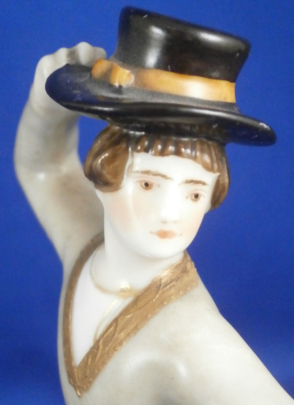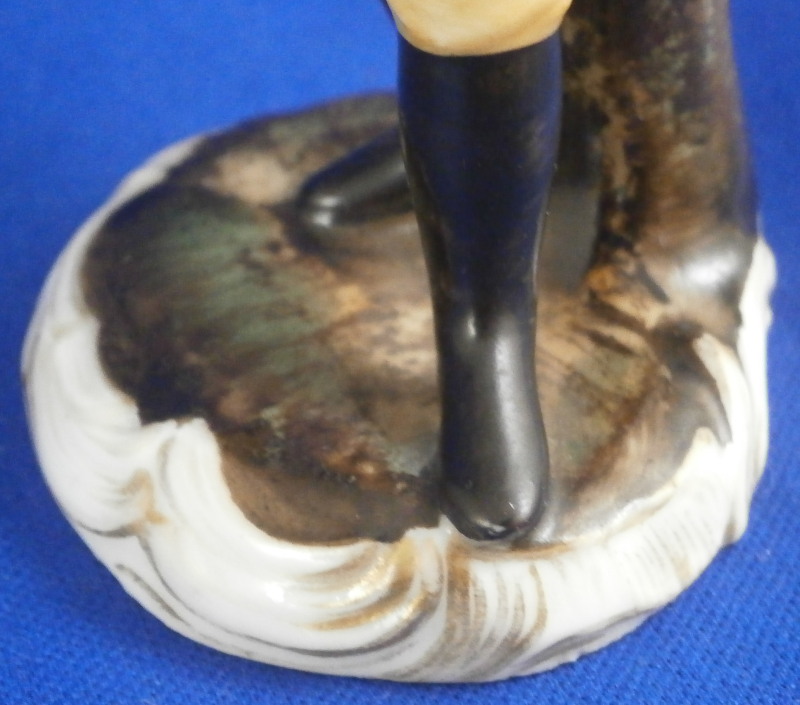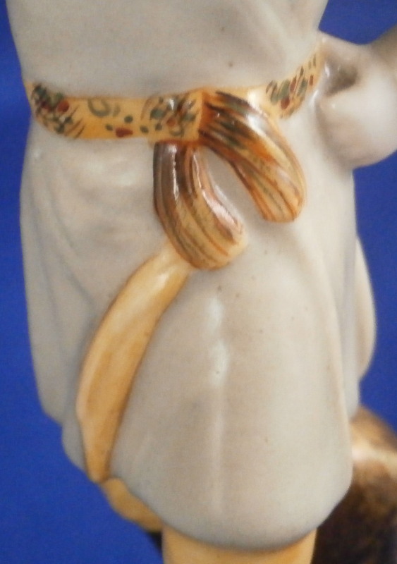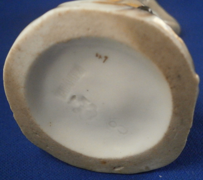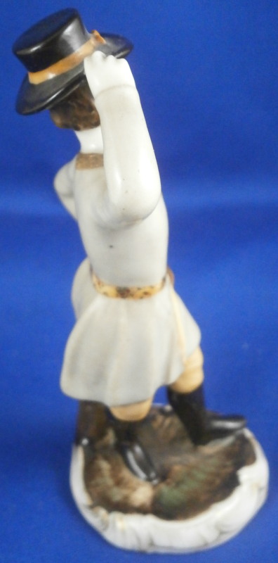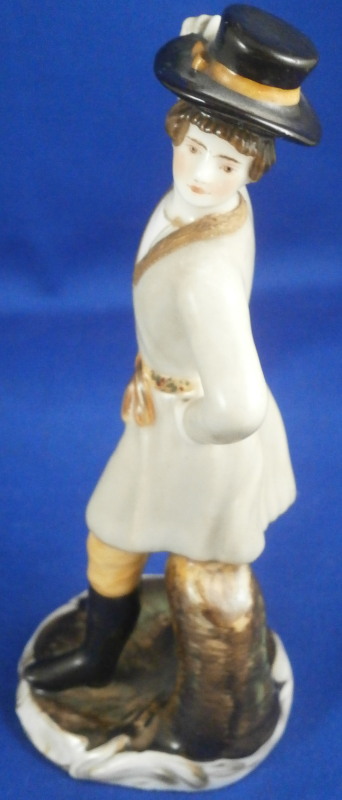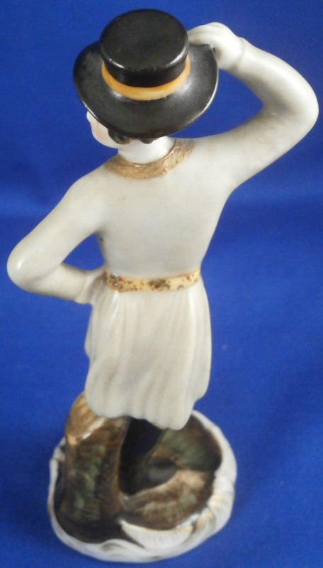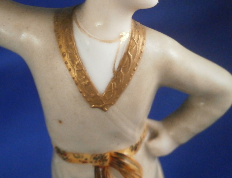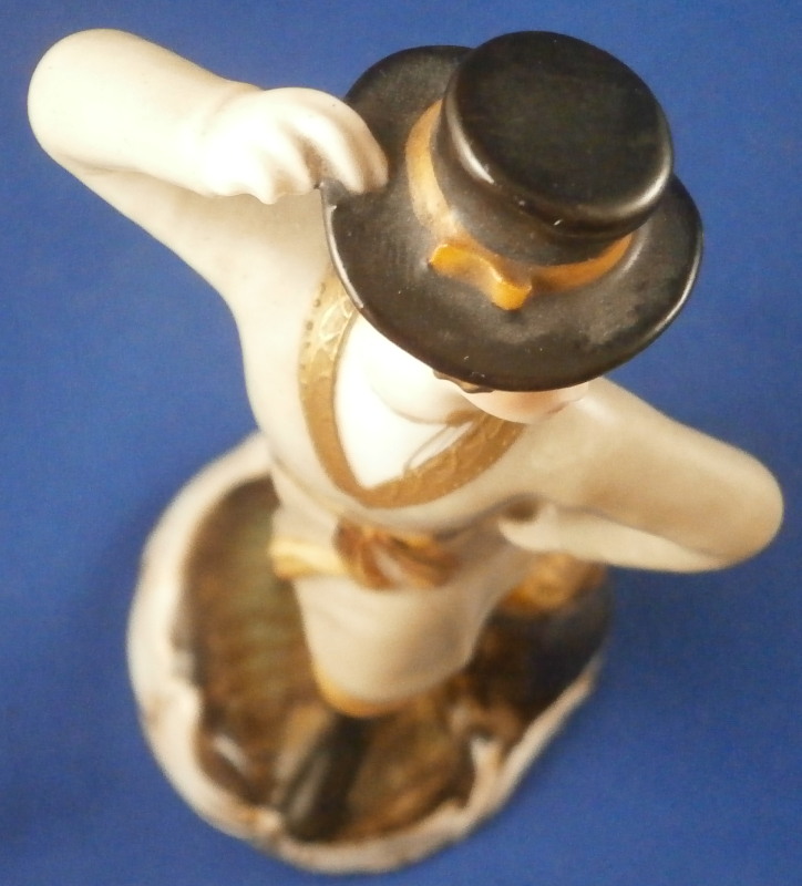 This is a bit of a treat - a figurine made by Gardner / Moscow in the early 19th century. It is of a dancing young gentleman / farmer and is superbly modeled and hand painted to make this one fun figurine :) Very much in the style of the period in terms of clothes, etc. He is wearing a long greytop with a colorful belt, has one hand on his hat and is standing in his long black boots on tp of a nice base painted to mimic the ground with some gilded relief scrolls all along the edge. The figure is in perfect condition with some very minor wear to the gilding along the edge of the base. The piece is marked underneath with the impressed Saint George slaying the dragon mark as well as TAPAHEPZ (or Gardner in cyrillic letters) and a black number 119 and impressed number 8. The figurine is 4.75 inches tall and the base has a diameter of about 2 inches. Please email me for more information or other pictures.
