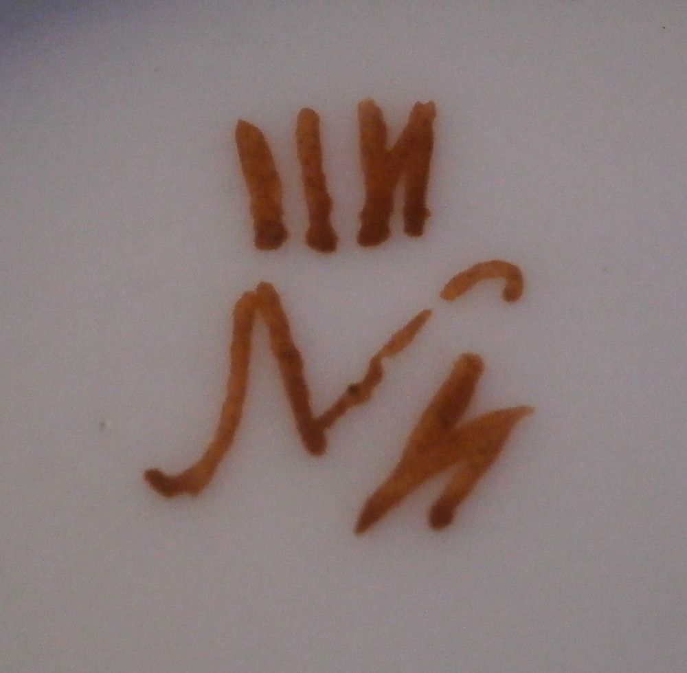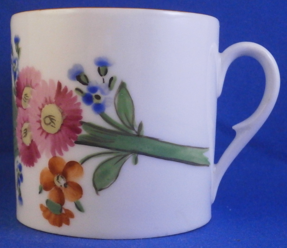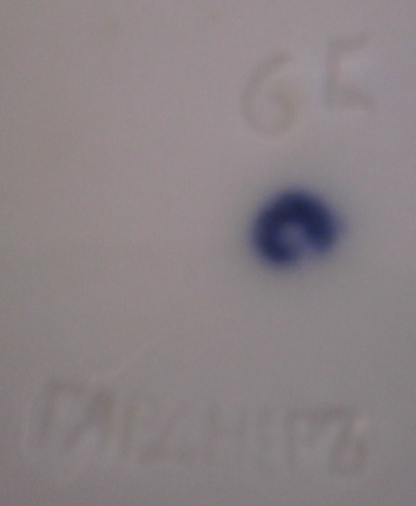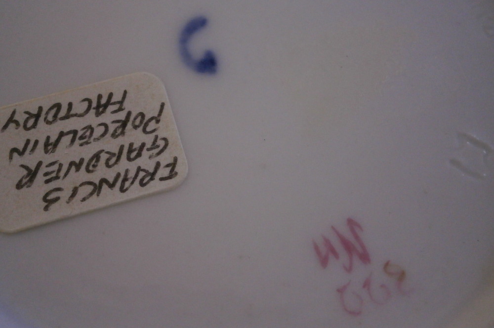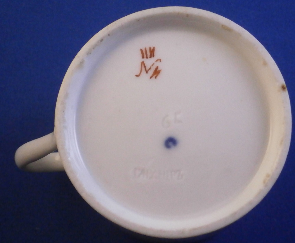 This is a very rare porcelain cup and saucer made by the Gardner factory in Verbilky near Moscow in the 18th century . I have owned some single pieces by them and some plates but never a cup and saucer so I was thrilled to find it. It is nicely hand painted with a large floral and leaf arrangementcovering most of the pieces and a typical rust colored trim to the edges. A really nice cup & saucer set that one will not see again soon. Reminds me very much of the the top German maker's pieces. The cup is 2.5 inches tall with a diameter of 2.5 inches. The saucer is 1.125 inches tall and has a diameter of 5.125 inches. Both pieces are in great condition - as nice as they come! Each is marked underneath with an under glaze blue capital G mark as well as some painted marks, two blue dots on the foot ring of the saucer and some impressed marks including Tapahepz ( Gardner in Cyrillc letters ) as shown. Please email me for more information or other pictures.