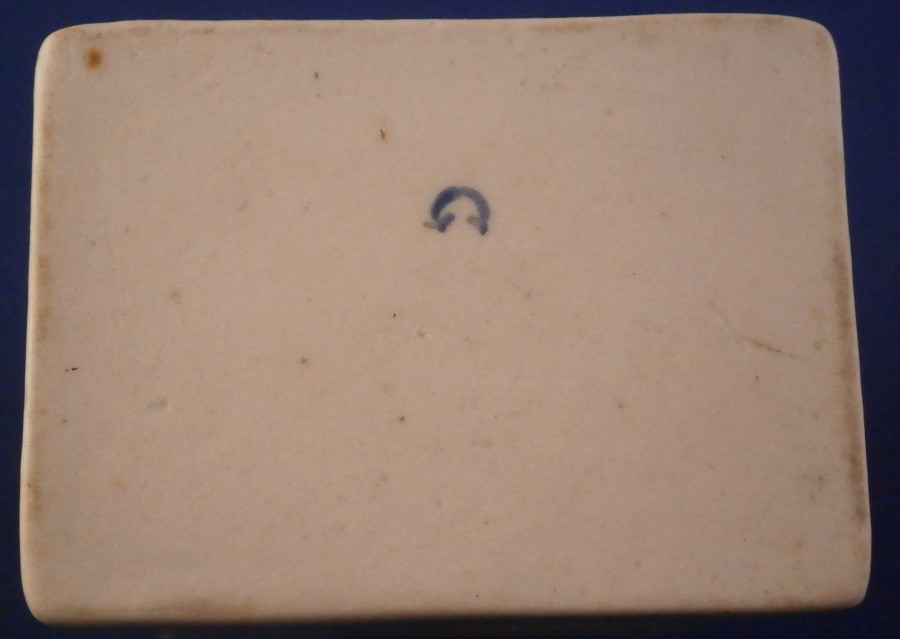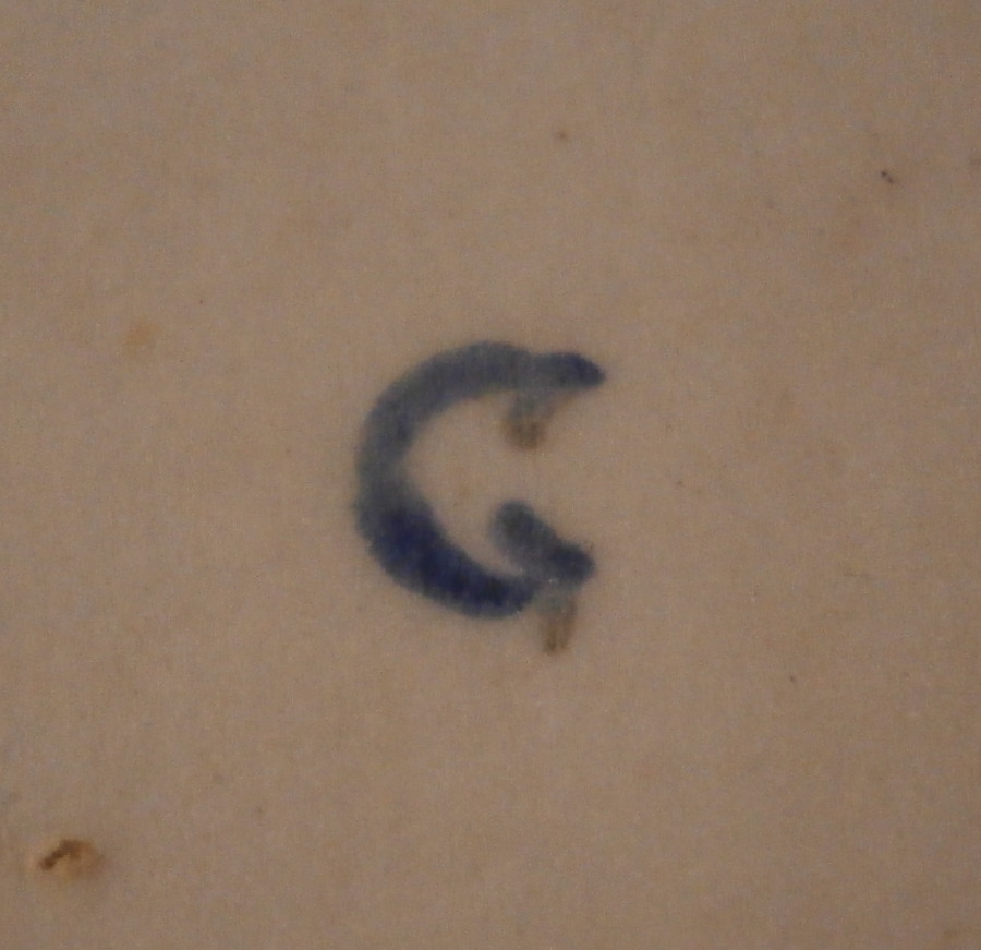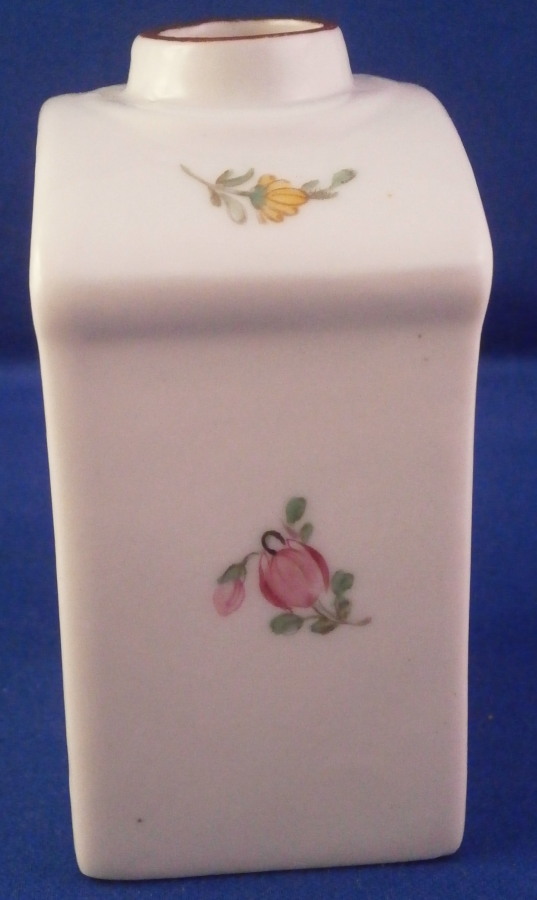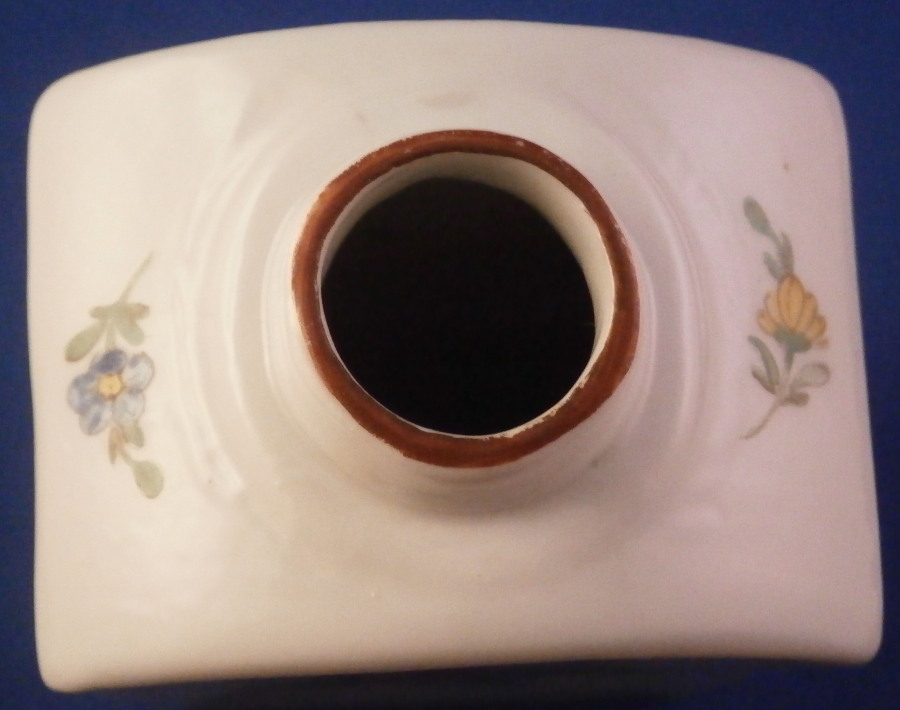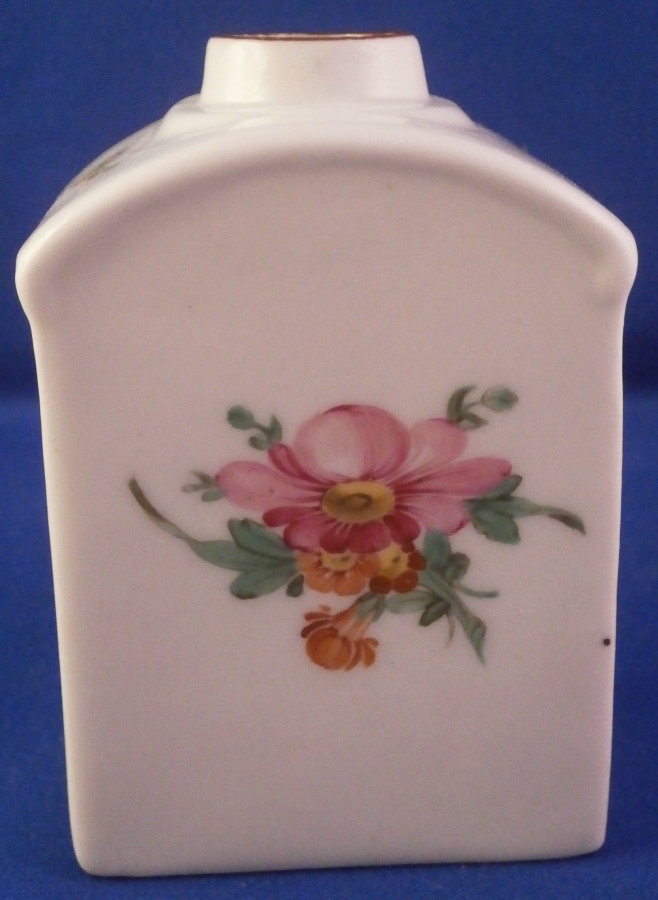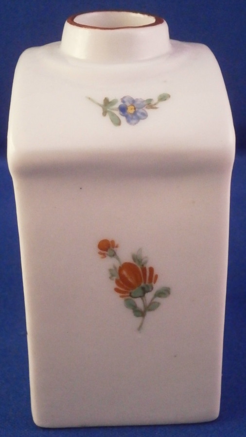 This is a nice tea caddy / jar made by the Gardner factory in the 18th century. The piece is hand painted with a nice floral arrangement on both the front and the back, a small flower to either side and two more single flowers to the top. Brown trim around the opening. The teacaddy is marked with a G in blue underneath as shown. It is in great condition but sadly lacking it lid. Not impossible to find a good replacement though so there is hope. The piece is 3.5 inches tall, 2.375 inches wide and about 1.875 inches deep. Please email me for more information or other pictures.