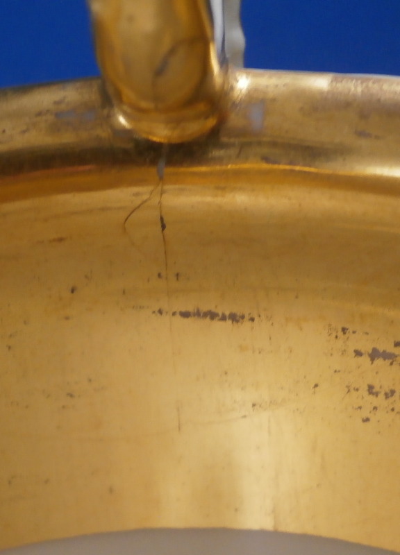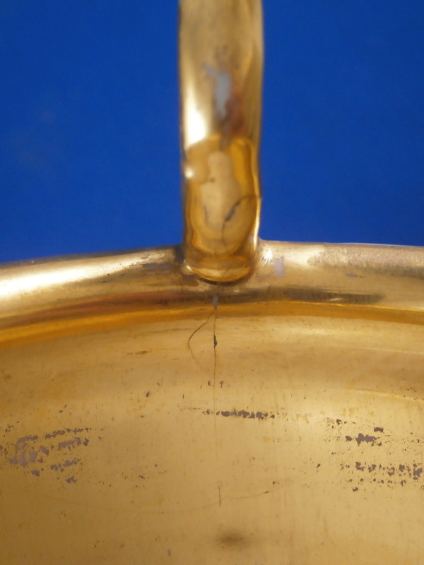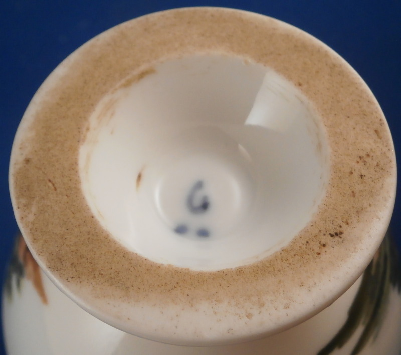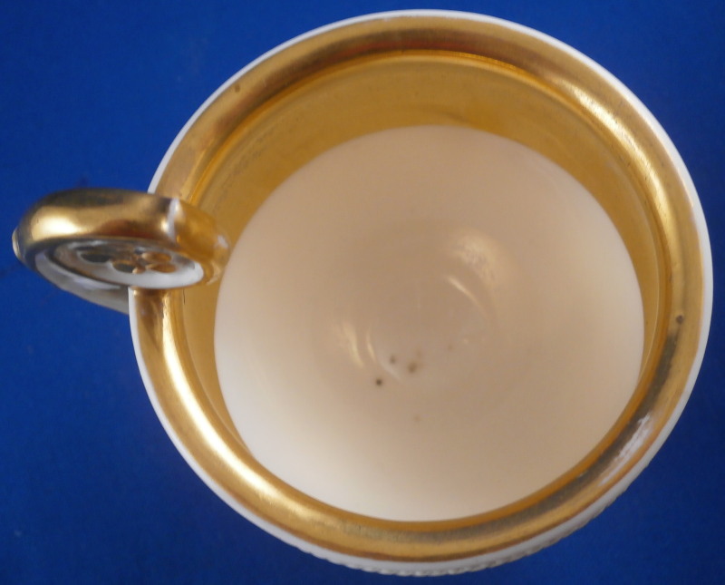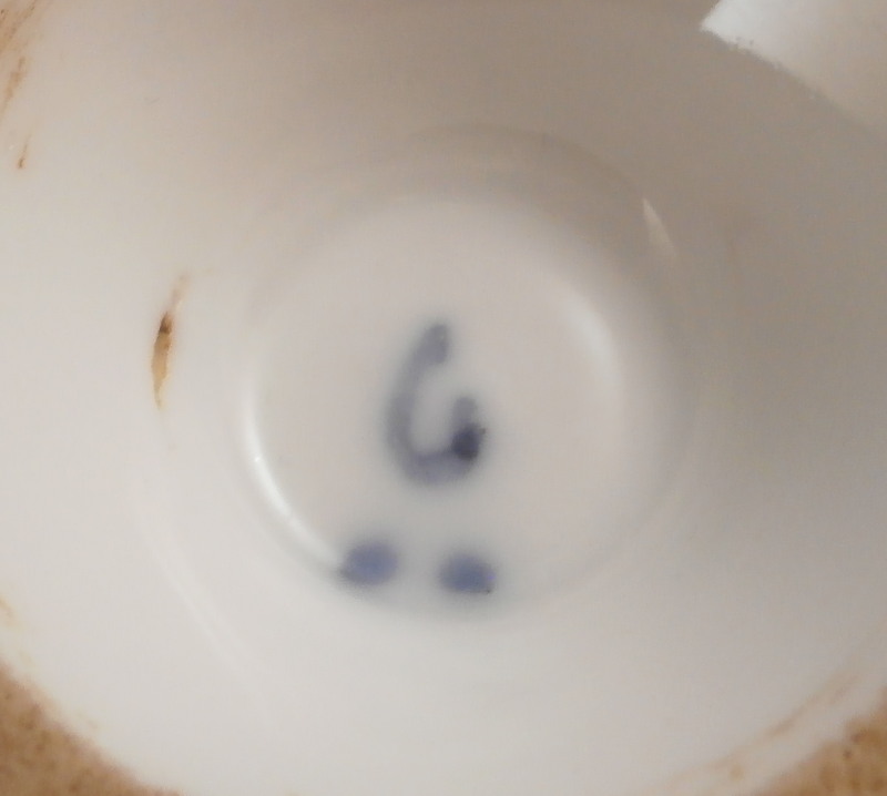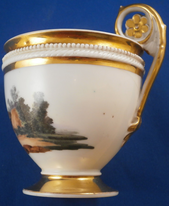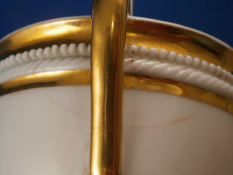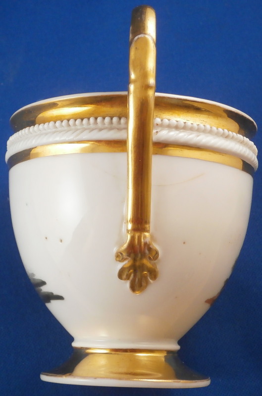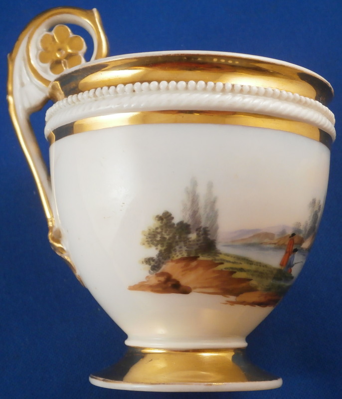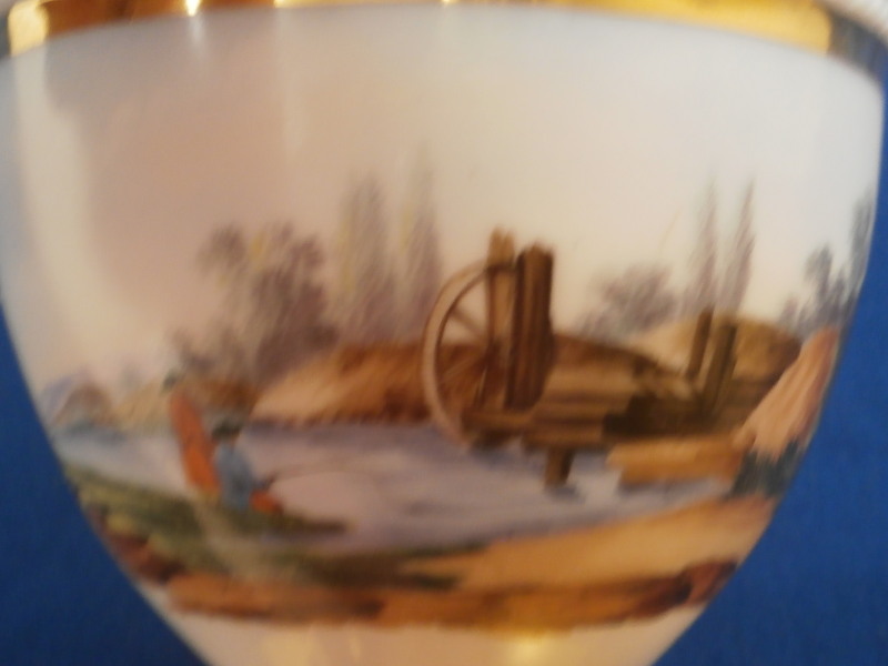 This is a porcelain cup made most likely by Gardner but definitely by a Russian maker in the late 18th or early 19th century. The cup is very nicely hand painted with a landscape scene in the front including a water wheel and two guys fishing. Nice relief trim design including 'perls' to the top part of the cup, lots of gold trim and a nice handle. Really a nice example of what they could do in Russia at this time - competes with the Europeans goodies in terms of quality! The cup displays nicely with some wear to the inside gold trim but there is damage to the area where the handle is - a horizonthal hairline through the bottom part of the handle as well as in that goes from the handle down towards that other hairline but is hidden by the handle. Took pictures to try to show it as it is hard to describe. Still a superb and definitely rare example! It is marked with an under glaze blue mark of a G with two dots under that. The cup is 4 inches tall including the handle and 3 inches in diameter. Please email me for more information or other pictures.