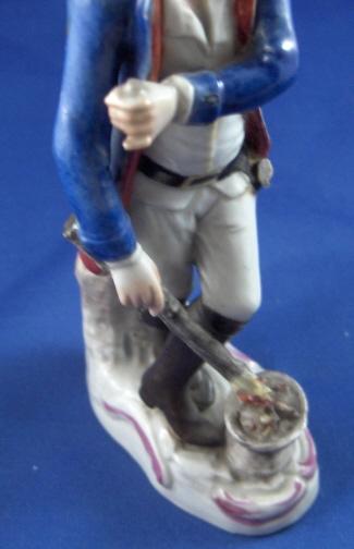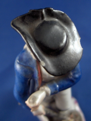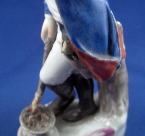 This is a rare figurine made by Gera around 1780. Gera was founded in 1750 as a faience factory but in 1779 they obtained the rights to make porcelain as well. Ownership changed a lot in the next 25 years until some stability was achieved. Gera unlike Gotha did make figurines. Some are of inferior quality and few (like this one) are quite nice. This figurine is of a charcoal maker (probably representing winter) and is most likely part of a four seasons group. He is well modeled and painted in the typical Gera manner. This figurine is in good condition with a chip to the hat, chips to the knife on his side and the piece in his right hand is just a stub but I am unsure if this is a flaw as the one in the books has the same stub. The piece is marked with the underglaze blue G mark as well as a museum ID number. It is 5.875 inches tall, 1.375 inches wide and 2.5 inches deep. Please e-mail me for more information or photos.