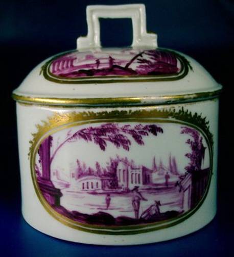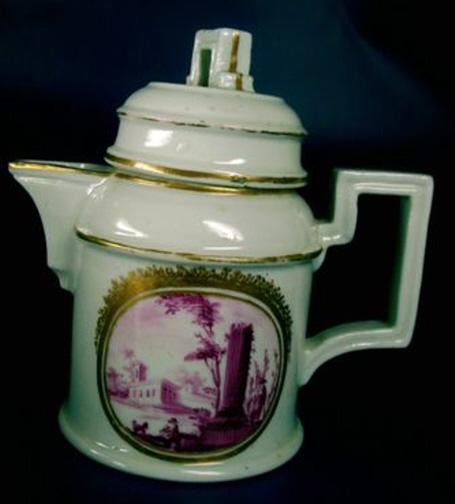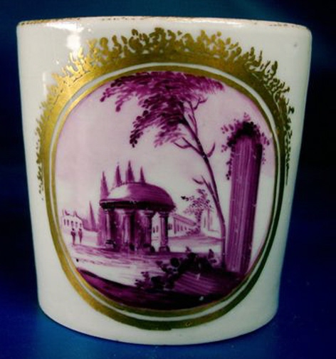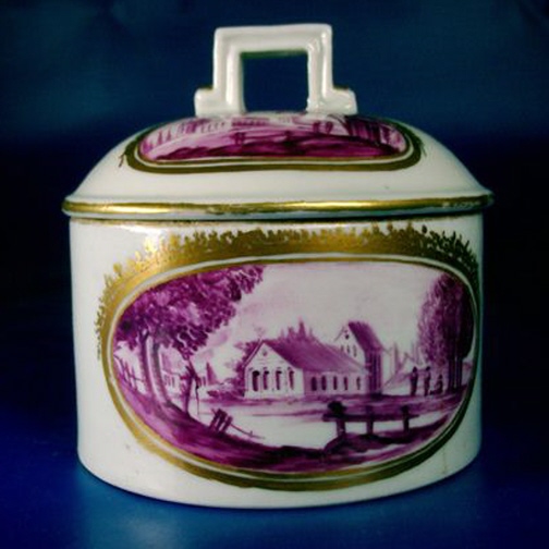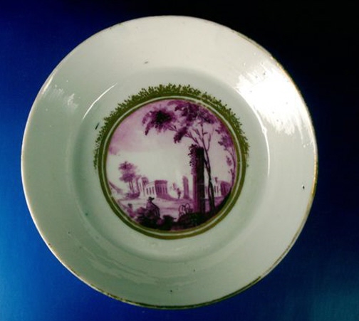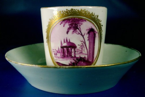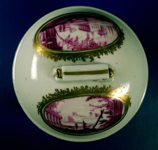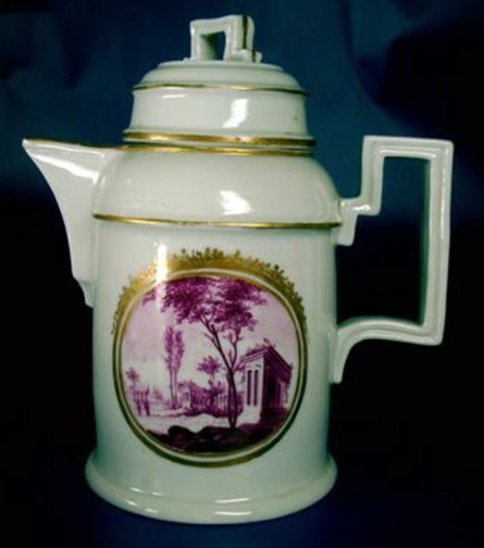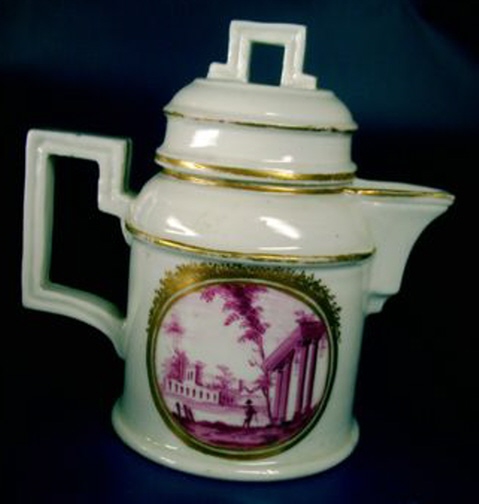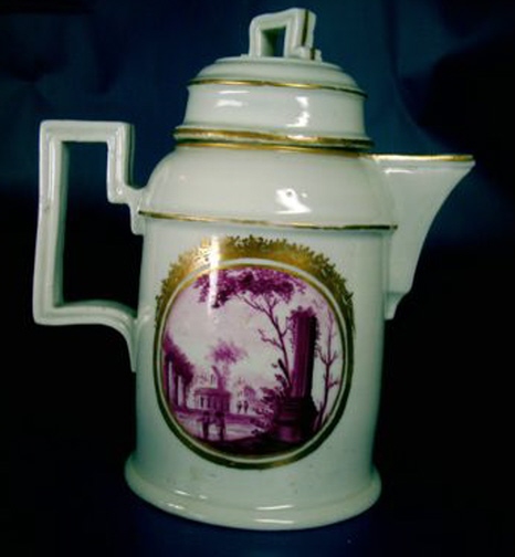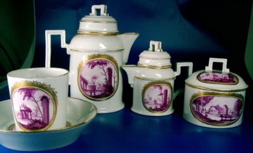 This is a super rare treat. A solitaire made by Gera around 1780. All pieces are handpainted with puce scenes of ruin landscapes surrounded by gold trim. An amazing little set. Gera is very similar to Gotha except the porcelain paste is not very good. Lots of flaws and bumps. Quite charming though and extremely rare. The set is in great condition with a hairline in the sugar dish. The set is marked with an underglaze blue G mark and an incised PM underneath the creamer. The teapot is a bit under 5.5 inches tall. Please email me for more information or photos.