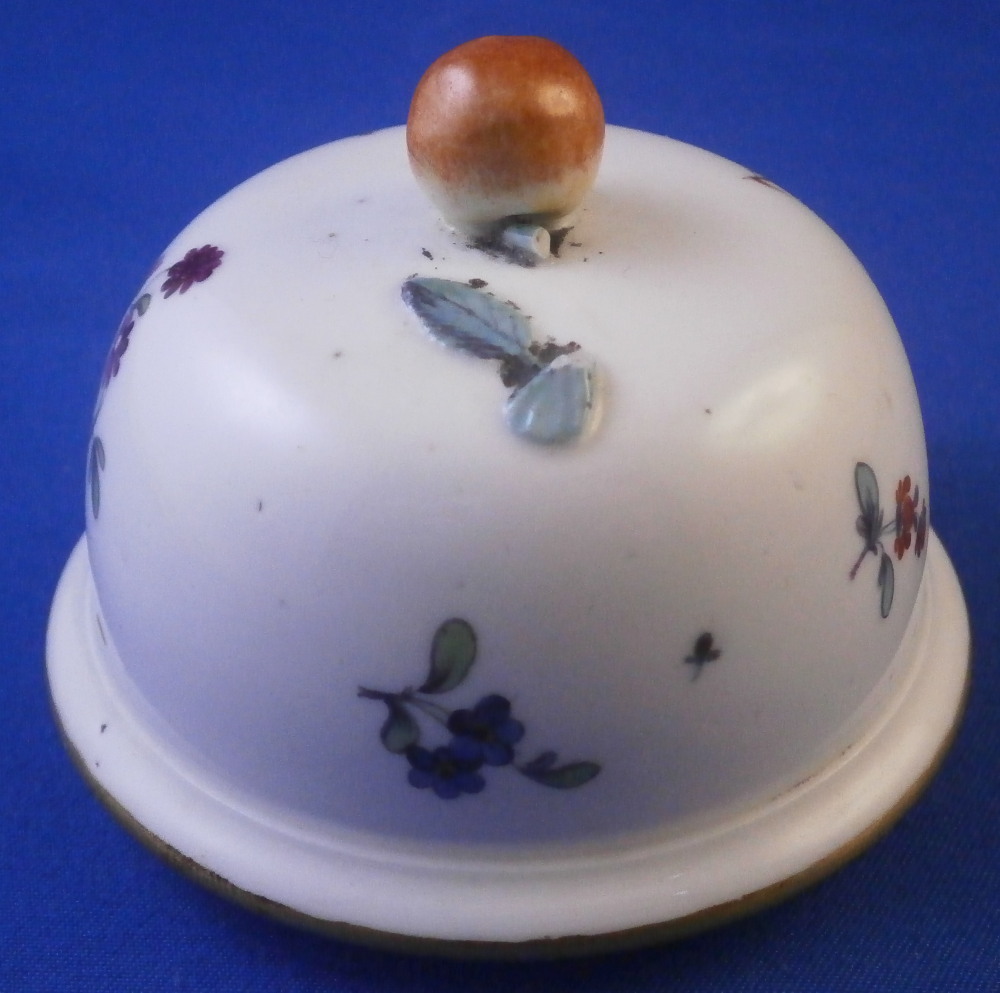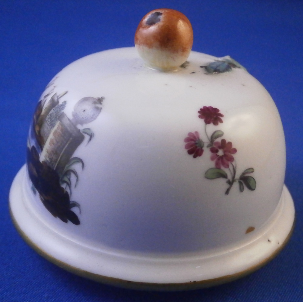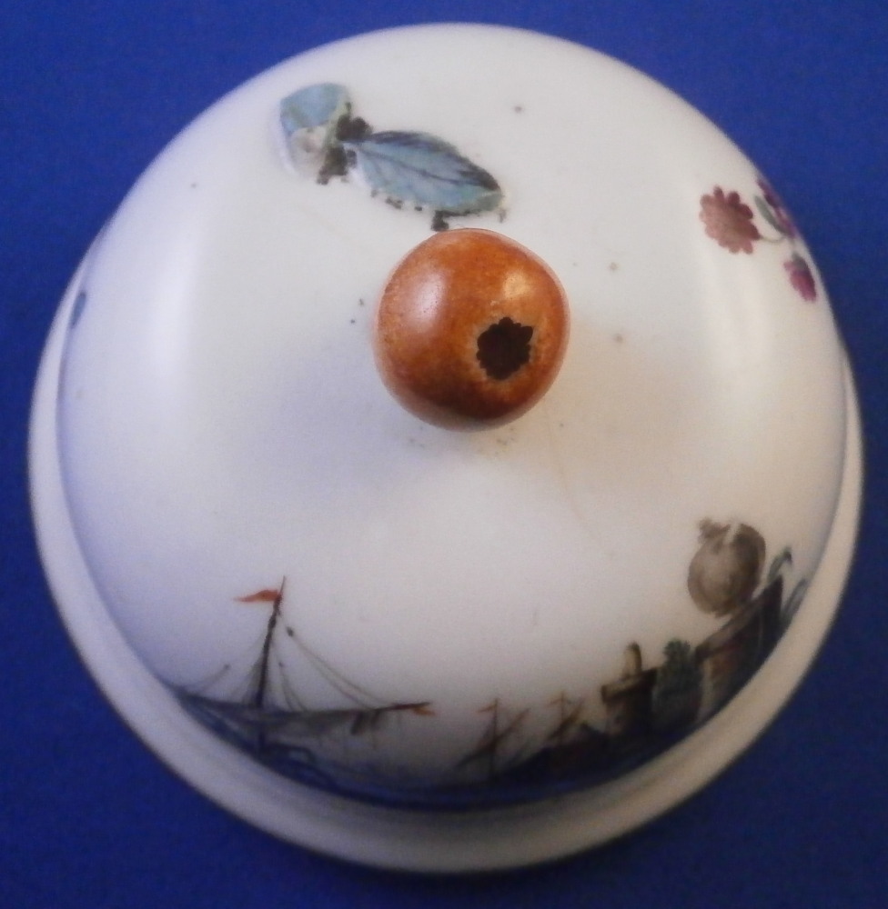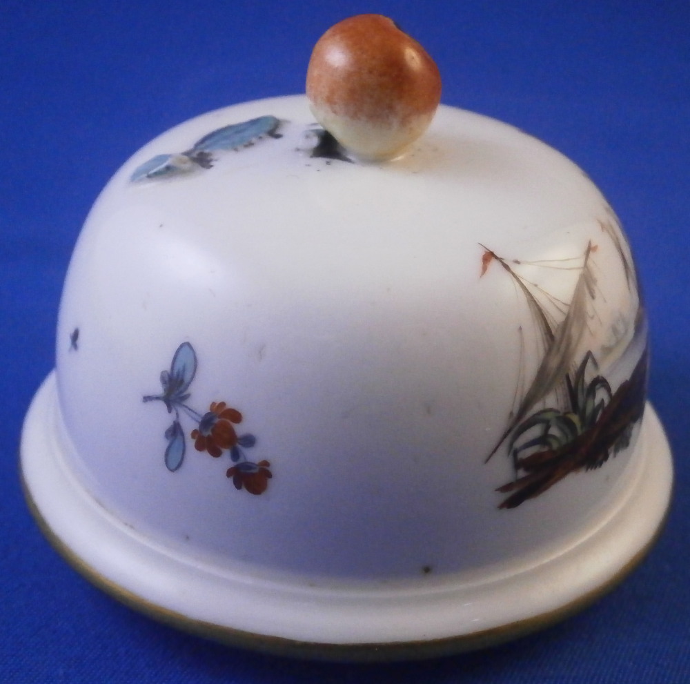 This is a nice porcelain lid made in Germany in the 18th century. If I had to guess it was probably made by Frankenthal but hard to tell. Any number of the smaller makers could have done it including Ludwigsburg and Hoechst . The shape of the lid is domed and it was likely for a small coffee pot. The piece is hand painted with a nice harbor scene to one side with three small flowers and a single tiny leaf filling in the rest of the area. Gold trim to the edge and a fruit / apple finial with its leaves to the top. The lid is 1.375 inches tall including the finial and 2.5 inches in diameter. The ring that sits inside the pot has an outer diameter of 2 inches. The piece is in great condition with the stem of the finial missing and a flat chip to the outside of the inner ring as shown. An unglazed spot on that inner ring as well from when it was made. Unmarked which is the norm but definitely German from this period. Please email me for more information or photos.