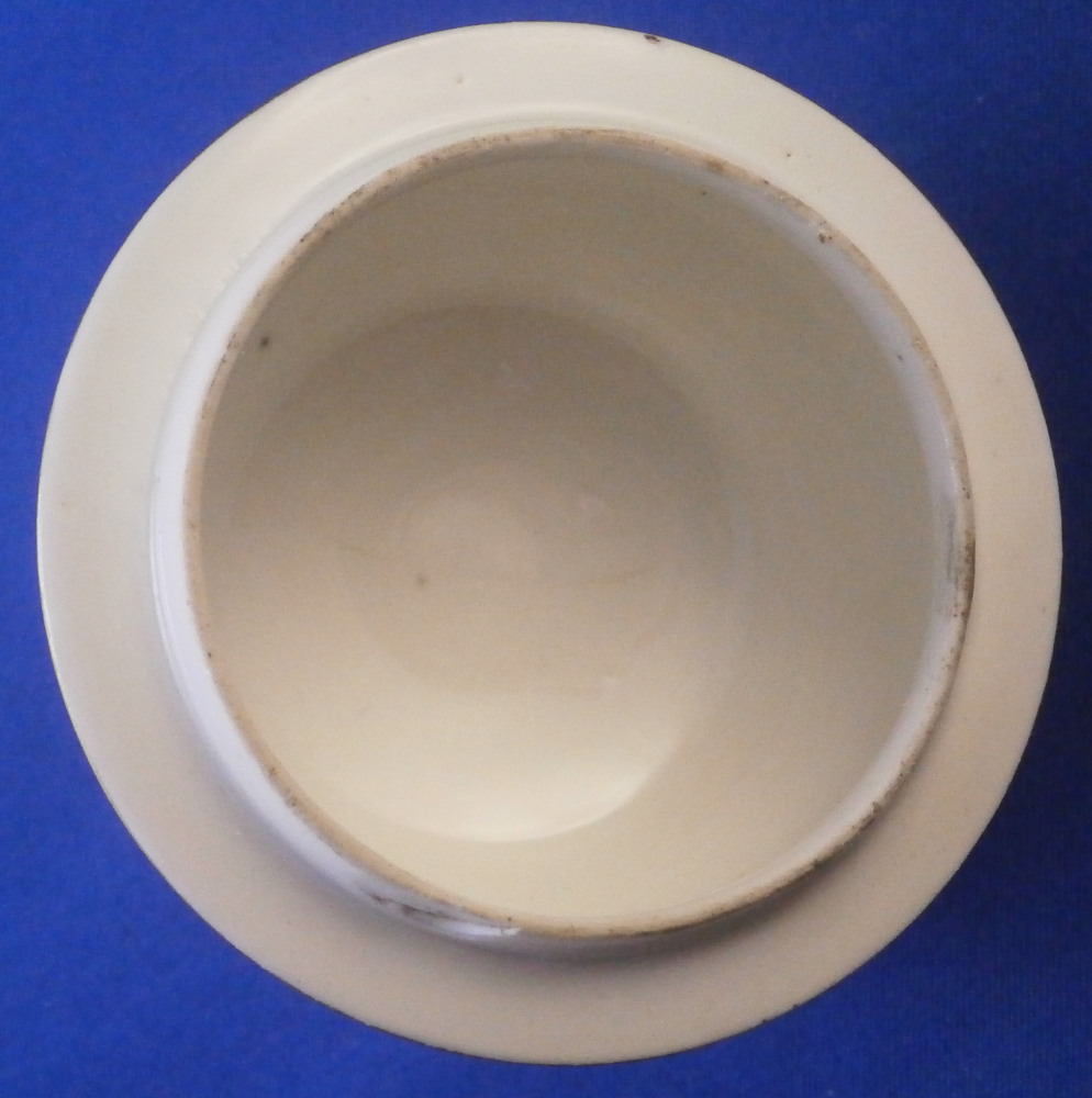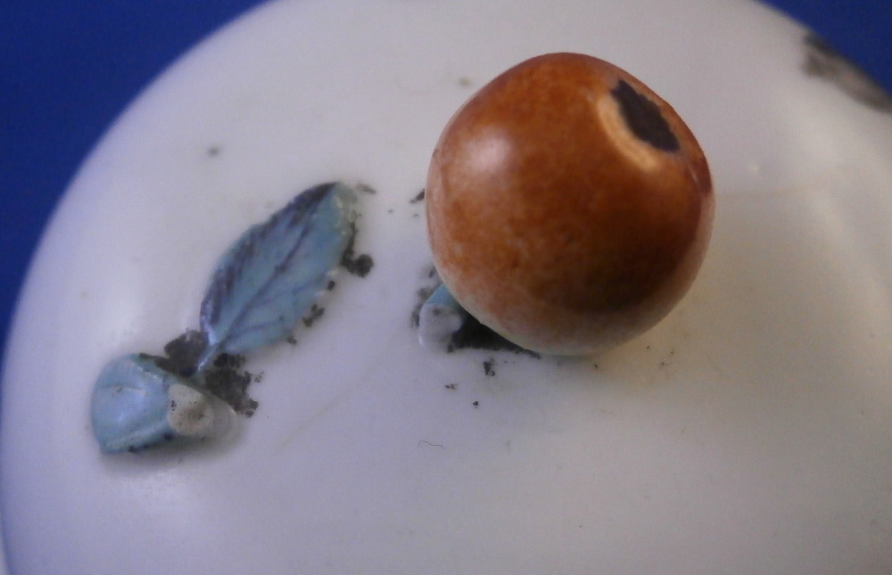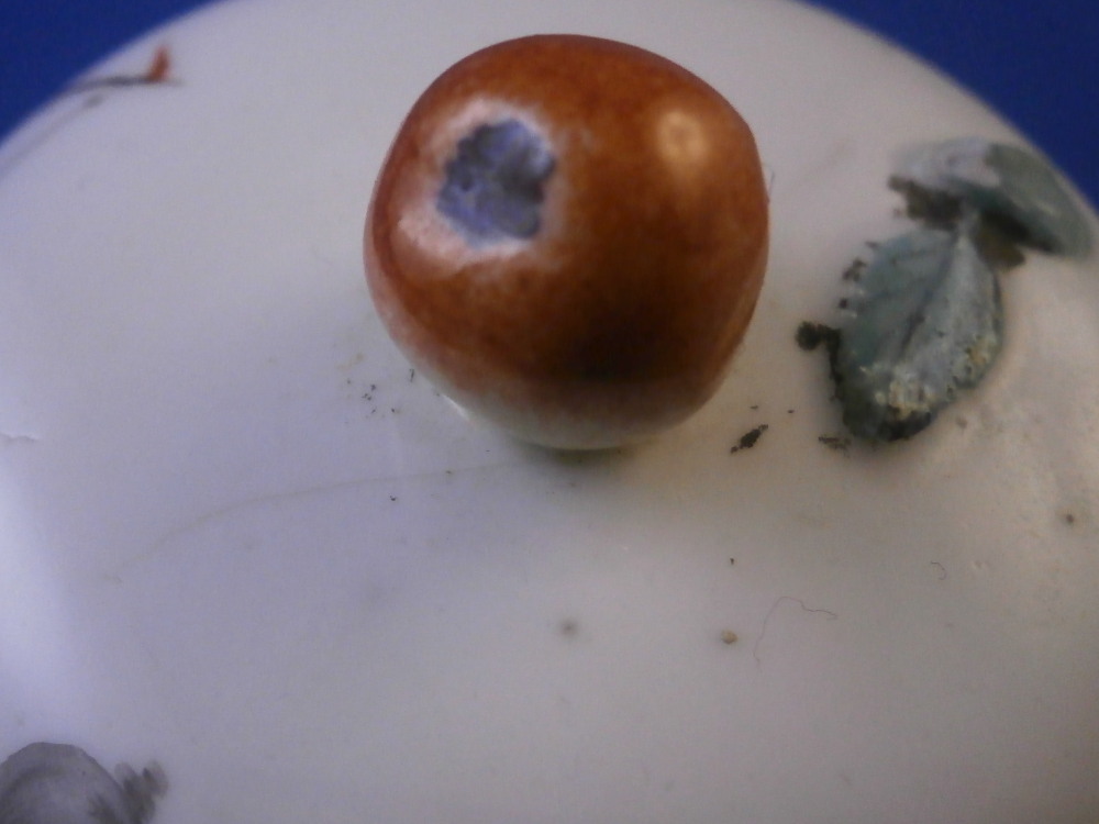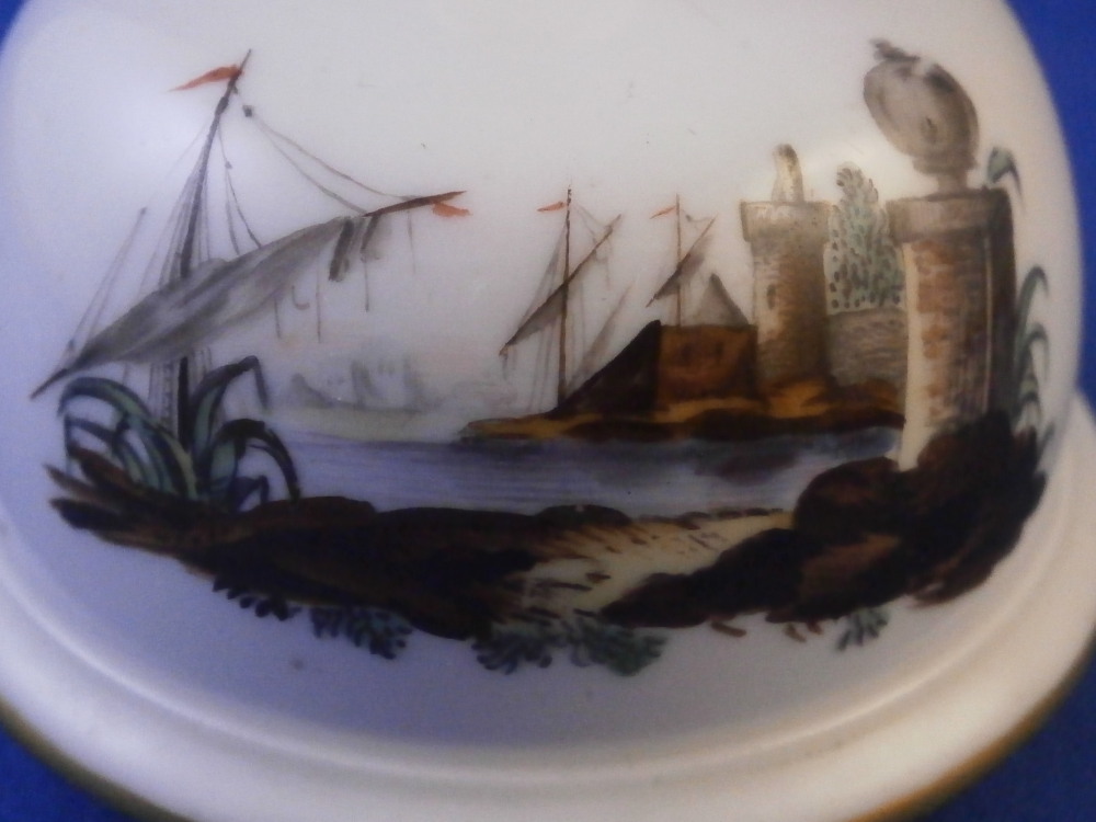 This is a nice porcelain lid made in Germany in the 18th century. If I had to guess it was probably made by Frankenthal but hard to tell. Any number of the smaller makers could have done it including Ludwigsburg and Hoechst . The shape of the lid is domed and it was likely for a small coffee pot. The piece is hand painted with a nice harbor scene to one side with three small flowers and a single tiny leaf filling in the rest of the area. Gold trim to the edge and a fruit / apple finial with its leaves to the top. The lid is 1.375 inches tall including the finial and 2.5 inches in diameter. The ring that sits inside the pot has an outer diameter of 2 inches. The piece is in great condition with the stem of the finial missing and a flat chip to the outside of the inner ring as shown. An unglazed spot on that inner ring as well from when it was made. Unmarked which is the norm but definitely German from this period. Please email me for more information or photos.