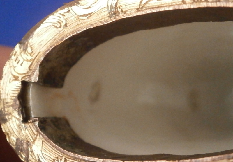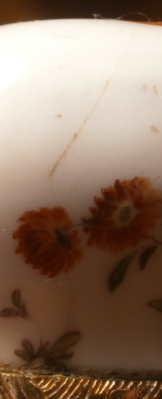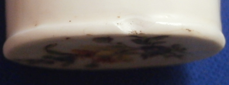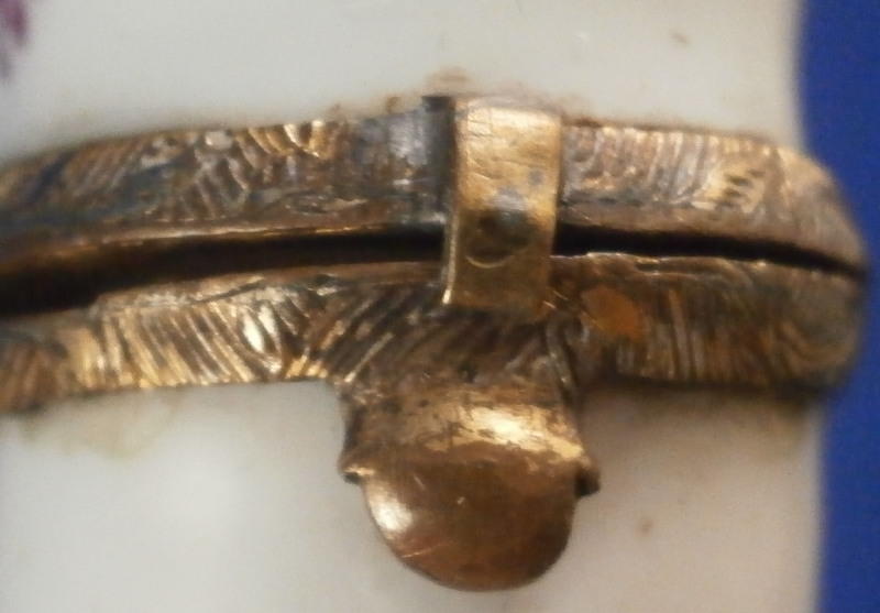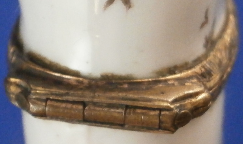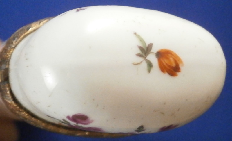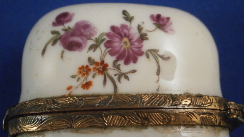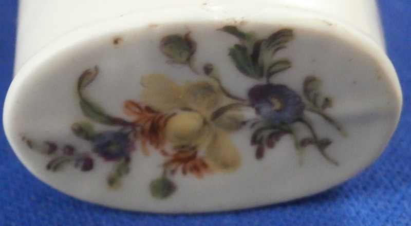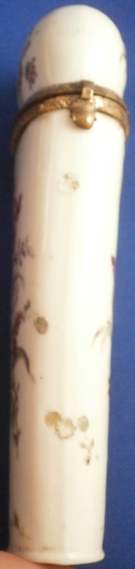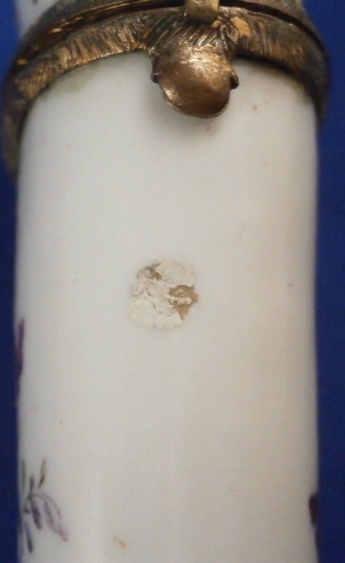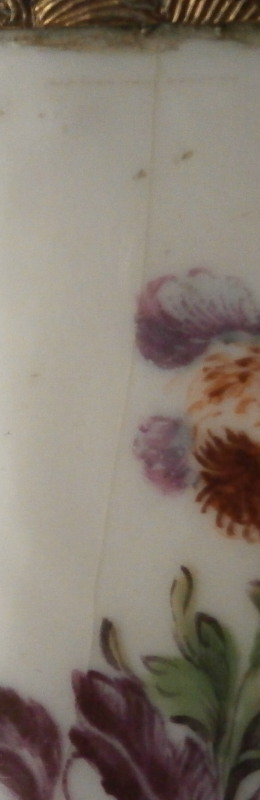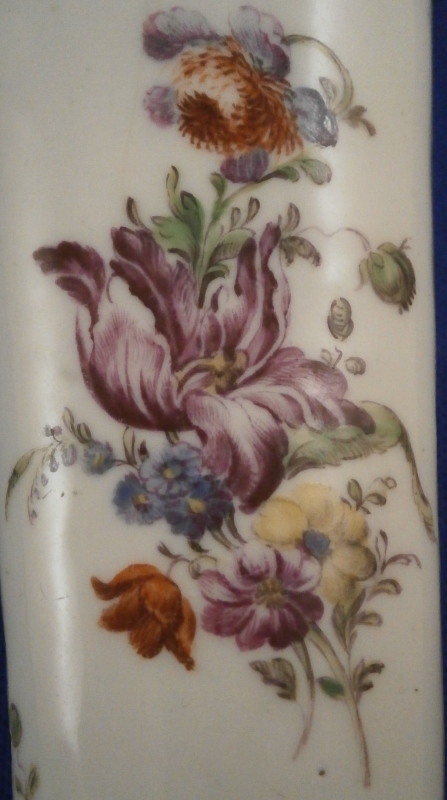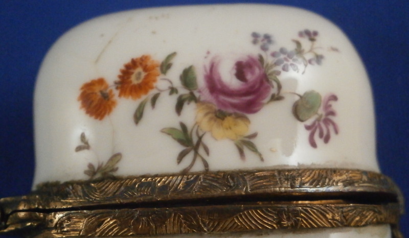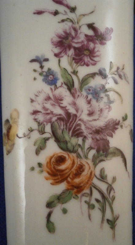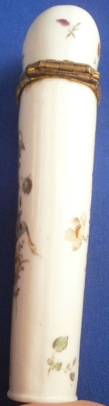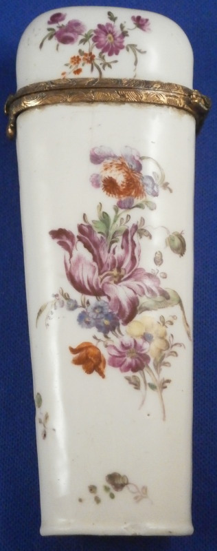 This is areally superb porcelain etui or sewing case I am sure was made in Germany in the mid 18th century. Hard to say which maker but I am leaning towards Hoechst or Frankenthal with these flowers - their quality is top notch! The piece has a nice shape to it and is hand painted with two very good quality floral arrangements - one to the front and another to the back as well as lots of smaller flowers scattered throughout. Silver mountings I believe though I cannot find a mark on that. The box is not marked which doesn't help any but is fairly normal. It is 4.375 inches tall, 1.75 inches wide and 1 inch deep. It displays superbly but has some issues - the lid has a finring crack to the inside which later on resulted in a hairline crack as shown, there also is a hairline crack to the main body as shown, a tiny chip to the bottom edge and the closing mechanism has been changed - there are two holes to one side of the piece which used to be part of the closing mechanism which were filled - one has a small flat chip next to it. The inside of the bottom mounts had a copper ring added for stability I assume, the front had a little blob added to it and the front of the top mounts a little "hook" that holds onto the blob. None of this is original but it works well. Sounds much worse than it is and the piece is still stunning and really fun to look at. None of these issues are obvious when on display at all. Please email me for more information or other pictures.