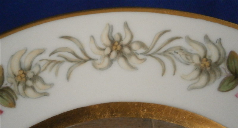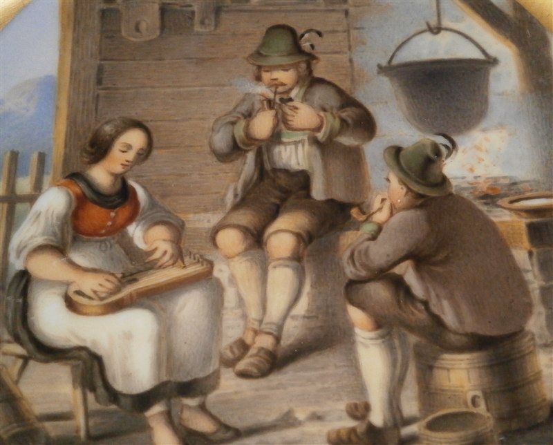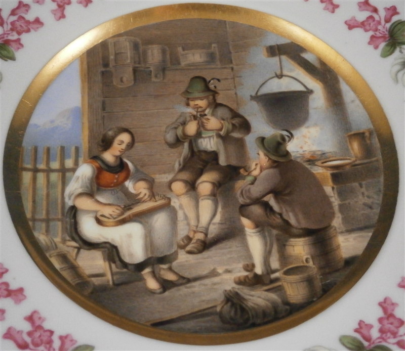 This is a plate hand painted with a fun Bavarian / Tirolean scene in the center possibly by the famous workshop of Franz Xaver Thallmaier. It definitely dates to the late 19th century. The central scene has two gentleman in lighting up pipes with a lady playing the Zither Guitar or some sort of isntrument like that. All three are wearing traditinal clothes. In the background there is a stove with a big kttle over it and lots of other detail. The rim has two different flowers all around including Edelweiss which is extra fun and very fitting. Nice gold trim along the edge and the central well edge. All in all a really superb plate! It is 1.125 inches tall and 7.875 inches in diameter. It is not marked so a perfect attribution is close to impossible but it is definitely from that era and region and quite possibly by Thallmeier. Please email me for more information or photos.