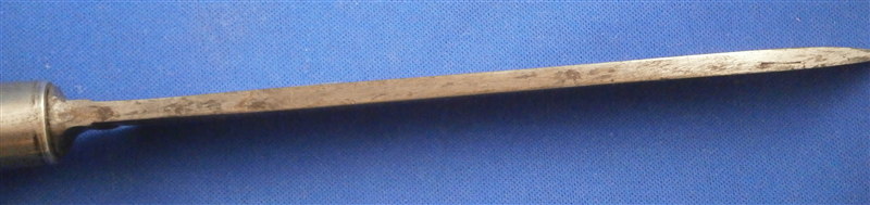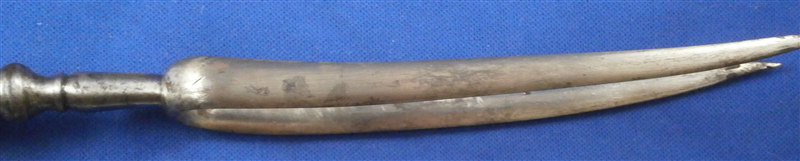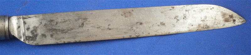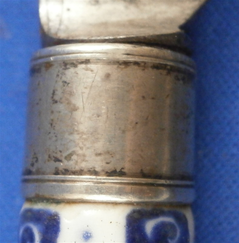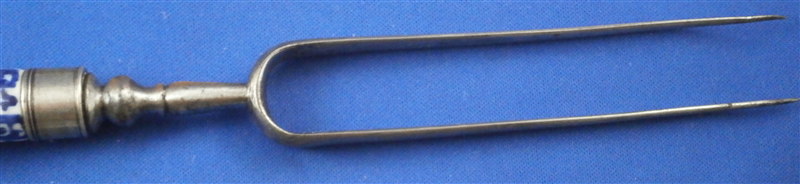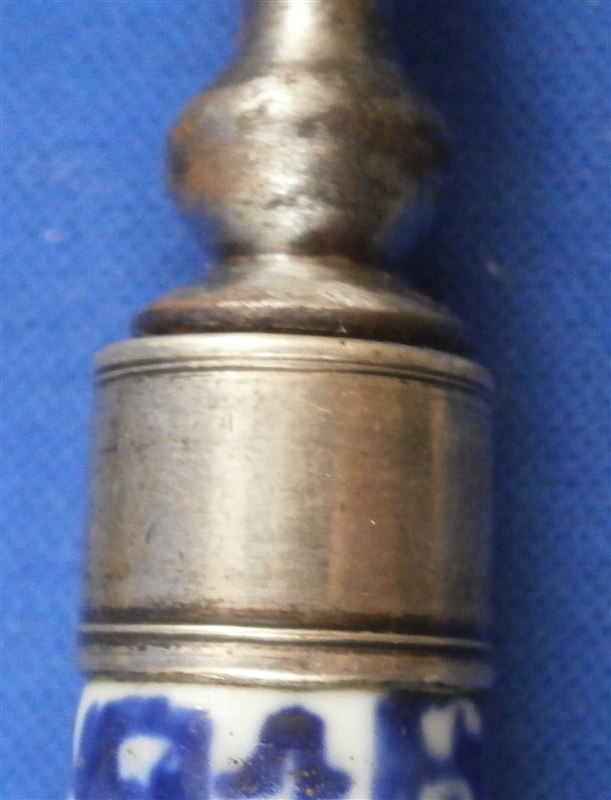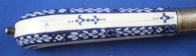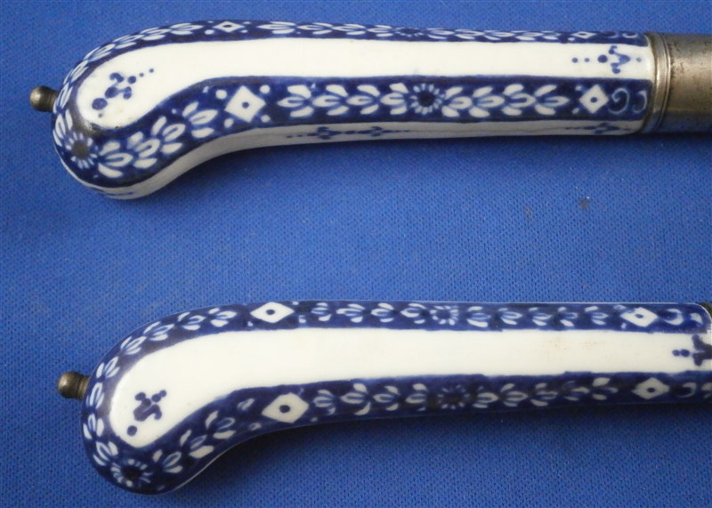This is a very rare carving set consisting of a knife and a fork made in German pre 1730. I showed to a buddy of mine who knows all about this sort of thing and here is what he thought. There is a similar set in the Sheffield Museum which states pre 1730 and no later. This style of fork was found in England and in Northern Germany the knife blade is certainly not English nor is the mark which is either German or Dutch. So he says the set is Northern European most likely German possibly with Dutch hardware. So there you have it. A rare set from the early days in great condition. The metal has a bit of the usual oxidation, the fork handle (aka haft ) has one small glaze imperfection and the knife has a hairline along the top and the bottom that look stable. There are no marks except for the crown on the knife blade. The knife is 11 inches long of which 3.75 inches is porcelain and the fork is 10.5 inches long of which 3.75 is the porcelain handle. Please email me for more information or photos.