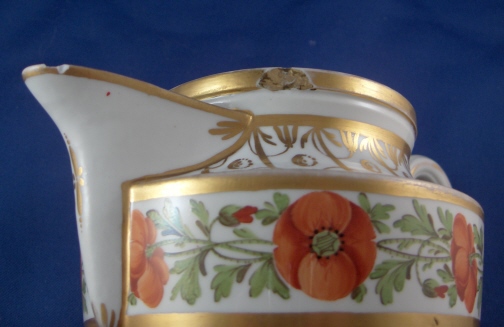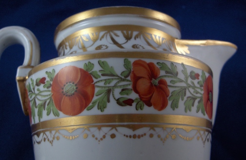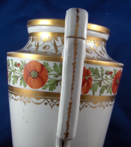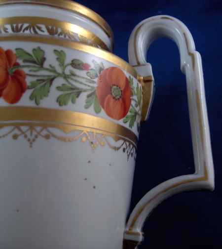 This is a coffee pot made by a German maker around 1800. I think it might be made by Limbach but could be a number of other makers. It is nicely handpainted with a ring of poppies as well as lots of fancy gold trim. The pot and lid are in good condition with the finial on the lid reattached and some gold wear to both pieces. The main body has a chip to the spout's side and one to the top rim neither of which is super terrible and both can be turned towards the back for display purposes. The piece is marked underneath with an impressed letter L as well as an incised line. The coffee pot and lid are 9.25 inches tall and 4.5 inches in diameter. Please e-mail me for more information or photos.