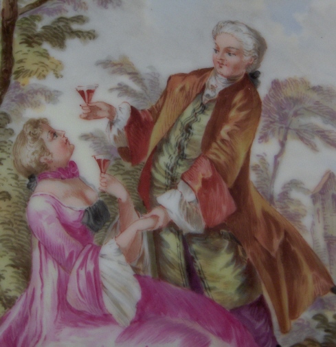 This is a plaque with a superb scene on it made likely by one of the Dresden area makers in the 19th century. The handpainted scene is of a couple in a landscape surrounding having a drink together. Nice gold trim around the rim. Not sure who exactly made but certainly German and very likely by a Dresden maker. The plaque is in perfect condition. It is 5.125 inches wide and 7 inches high so of a nice size! It is marked underneath with an impressed TT or something along those lines! Please email me for more information or other pictures.