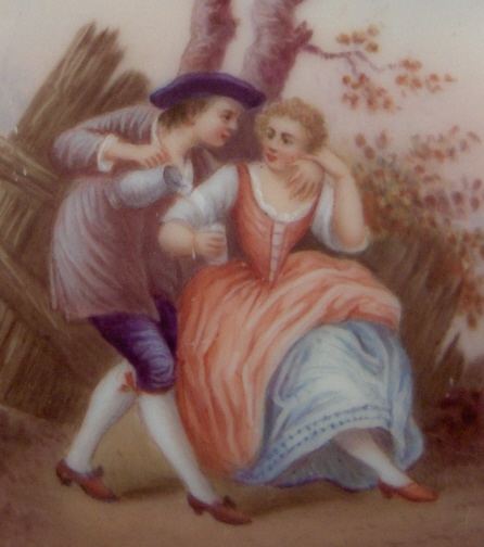 This is a porcelain plaque most likely made in Germany in the 19th century. It is handpainted with a very nice scene of a couple surrounded by a landscape. The gentleman is pouring a drink from his pitcher into the lady's glass. Very well handpainted and of good quality! The plaque is in perfect condition. It is marked in the back with some sort of impressed number I think though it is hard to make out! The plaque is about 2 inches tall and 2.375 inches wide. Please email me for more information or photos.