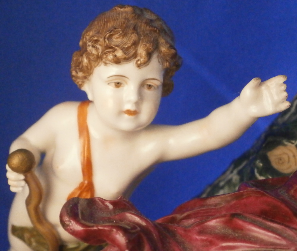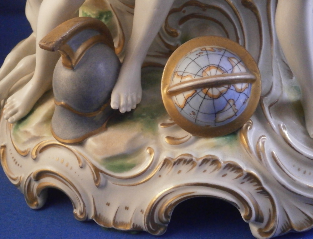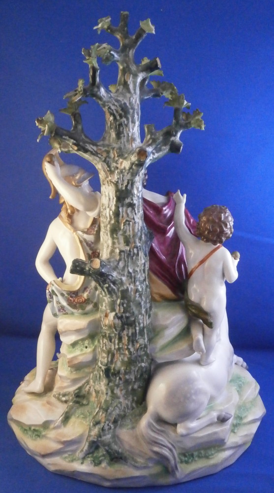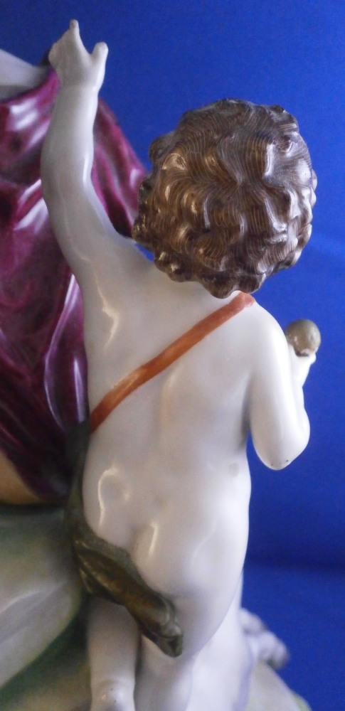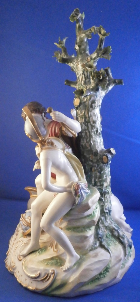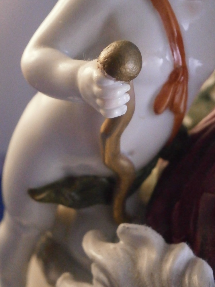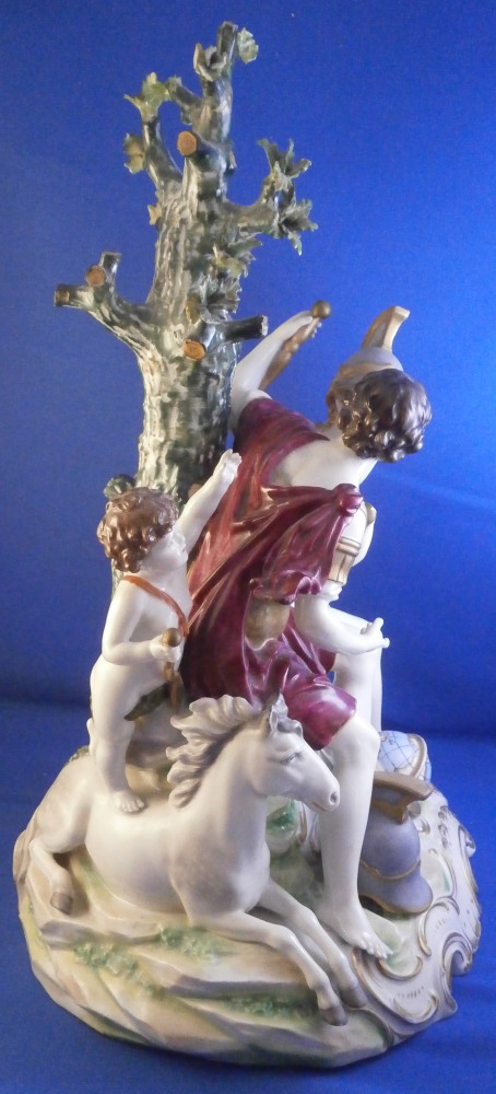 This is a nice and large figurine made by a German maker in the late 19th or early 20th century. Might be Passau or Bock Wallendorf. I could not find this exact mark but I am fairly sure it was made by one of these two makers byt the look of the piece. The figure is of a Roman soldier looking gentleman sitting next to a lady wearing a helmet with another helmet by his feet as well as a globe in front of them. There is a horse to his side and a putto behind him. Large tree in the back all on a nice base with some greenery painted on it and gold scrolls to the front. The style of the figure is older than the piece is. It looks great and is nicely modeled with lots of detail and hand painted quite nicely. The figurine displays nicely but has a few faults - the tip of the putto's bow as well as both tips of the scepters the other two are holding are dmaged and restored with an odd round top. The ears of the horse are chipped though that is not obvious at all. Damage to the leaves of the tree which is a given and possibly a branch tip or two. Hard to tell. All in all in very nice condition given the age and size and it displays very well. It's a nice figurine! Marked underneath with the script L in a shield under a crown in under glaze blue as shown. The piece is about 13.5 inches tall, 8.75 inches wide and 7.25 inches deep. Please email me for more information or photos.